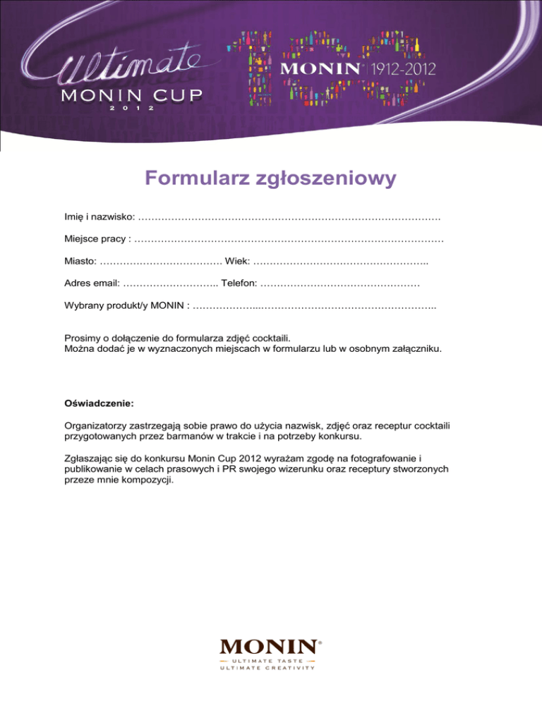 Formularz zgłoszeniowy Imię i nazwisko: ………………………………………………………………………………. Miejsce pracy : ………………………………………………………………………………… Miasto: ………………………………. Wiek: …………………………………………….. Adres email: ……………………….. Telefon: ………………………………………… Wybrany produkt/y MONIN : ………………...…………………………………………….. Prosimy o dołączenie do formularza zdjęć cocktaili. Można dodać je w wyznaczonych miejscach w formularzu lub w osobnym załączniku. Oświadczenie: Organizatorzy zastrzegają sobie prawo do użycia nazwisk, zdjęć oraz receptur cocktaili przygotowanych przez barmanów w trakcie i na potrzeby konkursu. Zgłaszając się do konkursu Monin Cup 2012 wyrażam zgodę na fotografowanie i publikowanie w celach prasowych i PR swojego wizerunku oraz receptury stworzonych przeze mnie kompozycji. Martini (cocktail zawierający alkohol) Nazwa : …………………………………………………………………………………………………….. No 1 2 3 4 5 ML Składnik Marka produktu Prosimy o wpisywanie danych w wyznaczonych miejscach w tabelce. Cocktail może zawierać maksymalnie 5 składników. Zawartość alkoholu nie może przekraczać 70 ml. Kompozycja cocktailu alkoholowego musi zawierać min. 10 ml produktów MONIN Dekoracja: ………………………………………………………………………………………. Metoda I technika wykonania: (Shake/ Stir/ Blend/ Build) …………………………………………………………. …………………………………………………………. …………………………………………………………. Szkło : ……………………………………………….. Wyjaśnij w kilku słowach dlaczego użyłeś/aś właśnie tego produktu / smaku MONIN : ………………………………………………………………………………………………… ………………………………………………………………………………………………… ………………………………………………………………………………………………… Zdjęcie drinka Long Drink (cocktail bez alkoholowy) Nazwa : ………………………………………………………………..................................................... No 1 2 3 4 5 ML Składniki Marka produktu Prosimy o wpisywanie danych w wyznaczonych miejscach w tabelce. Cocktail może zawierać maksymalnie 5 składników. Kompozycja bez alkoholowa musi zawierać min. 30 ml produktów MONIN. Dekoracja: ………………………………………………………………………………………. Metoda I technika wykonania: (Shake/ Stir/ Blend/ Build) …………………………………………………………. …………………………………………………………. …………………………………………………………. Szkło : ………………………………………………… Wyjaśnij w kilku słowach dlaczego użyłeś/aś właśnie tego produktu / smaku MONIN : ………………………………………………………………………………………………… ………………………………………………………………………………………………… ………………………………………………………………………………………………… Zdjęcie drinka