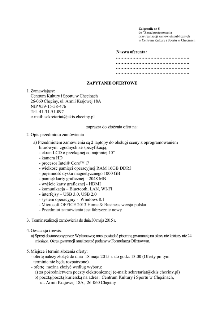 Załącznik nr 5 do ”Zasad postępowania przy realizacji zamówień publicznych w Centrum Kultury i Sportu w Chęcinach Nazwa oferenta: …………………………………………. …………………………………………. …………………………………………. …………………………………………. ZAPYTANIE OFERTOWE 1. Zamawiający: Centrum Kultury i Sportu w Chęcinach 26-060 Chęciny, ul. Armii Krajowej 18A NIP 959-15-58-476 Tel. 41-31-51-097 e-mail: [email protected] zaprasza do złożenia ofert na: 2. Opis przedmiotu zamówienia a) Przedmiotem zamówienia są 2 laptopy do obsługi sceny z oprogramowaniem biurowym zgodnych ze specyfikacją: - ekran LCD o przekątnej co najmniej 15” - kamera HD - procesor Intel® Core™ i7 - wielkość pamięci operacyjnej RAM 16GB DDR3 - pojemność dysku magnetycznego 1000 GB - pamięć karty graficznej – 2048 MB - wyjście karty graficznej - HDMI - komunikacja – Bluetooth, LAN, WI-FI - interfejsy – USB 3.0, USB 2.0 - system operacyjny - Windows 8.1 - Microsoft OFFICE 2013 Home & Business wersja polska - Przedmiot zamówienia jest fabrycznie nowy 3. Termin realizacji zamówienia do dnia 30 maja 2015 r. 4. Gwarancja i serwis: a) Sprzęt dostarczony przez Wykonawcę musi posiadać pisemną gwarancję na okres nie krótszy niż 24 miesiące. Okres gwarancji musi zostać podany w Formularzu Ofertowym. 5. Miejsce i termin złożenia oferty: - ofertę należy złożyć do dnia 18 maja 2015 r. do godz. 13.00 (Oferty po tym terminie nie będą rozpatrzone). - ofertę można złożyć według wyboru: a) za pośrednictwem poczty elektronicznej (e-mail: [email protected]) b) pocztą/pocztą kurierską na adres : Centrum Kultury i Sportu w Chęcinach, ul. Armii Krajowej 18A, 26-060 Chęciny c) osobiście w sekretariacie Centrum Kultury i Sportu w Chęcinach, ul. Armii Krajowej 18A, 26-060 Chęciny pok. 102 d) w przypadku składania oferty w sposób określony w pkt 5 lit. b) lub lit. c), ofertę należy złożyć w kopercie (lub inny sposób uniemożliwiający zdekompletowanie składanych dokumentów), którą należy opisać: (nazwa i adres Wykonawcy) „Oferta na dostawę 2 laptopów do obsługi sceny z oprogramowaniem biurowym ” Dostarczyć do dnia 18 maja 2015 r. do godz. 13.00, do sekretariatu Centrum Kultury i Sportu w Chęcinach, ul. Armii Krajowej 18A, 26-060 Chęciny 6. Miejscem dostawy przedmiotu zamówienia jest siedziba Zamawiającego: Centrum Kultury i Sportu w Chęcinach, 26-060 Chęciny ul. Armii Krajowej 18A Dostawa może być realizowana w dni robocze w godzinach od 8:00 do 15:00 7. Warunki płatności: płatność przelewem w ciągu 14 dni po potwierdzeniu dostarczenia protokołem odbioru dostawy 2 laptopów do obsługi sceny z oprogramowaniem biurowym 8. Osoba upoważniona do kontaktu z wykonawcami: Izabela Buda tel. 41-31-51-097 e-mail: [email protected] 9. Sposób przygotowania oferty: ofertę należy sporządzić w formie pisemnej, w języku polskim. Załącznik 5A. 10. Kryterium oceny ofert – cena 11. Informacja o wyborze oferty: O wyborze najkorzystniejszej oferty, Zamawiający poinformuje Wykonawców, którzy złożyli oferty za pomocą poczty elektronicznej e-mail. Załączniki: Załącznik Nr 5A – Formularz ofertowy