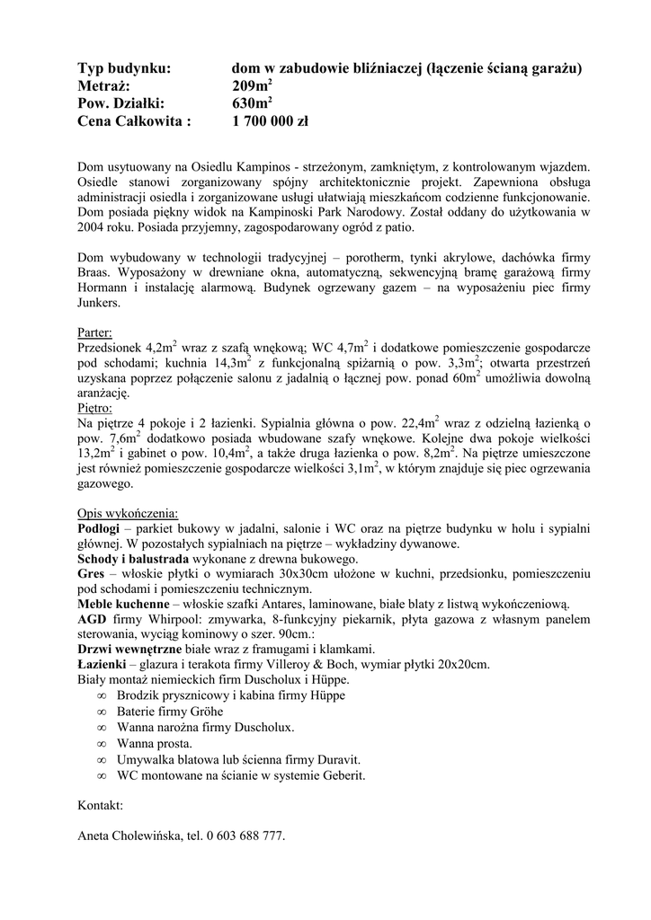 Typ budynku: Metraż: Pow. Działki: Cena Całkowita : dom w zabudowie bliźniaczej (łączenie ścianą garażu) 209m2 630m2 1 700 000 zł Dom usytuowany na Osiedlu Kampinos - strzeżonym, zamkniętym, z kontrolowanym wjazdem. Osiedle stanowi zorganizowany spójny architektonicznie projekt. Zapewniona obsługa administracji osiedla i zorganizowane usługi ułatwiają mieszkańcom codzienne funkcjonowanie. Dom posiada piękny widok na Kampinoski Park Narodowy. Został oddany do użytkowania w 2004 roku. Posiada przyjemny, zagospodarowany ogród z patio. Dom wybudowany w technologii tradycyjnej – porotherm, tynki akrylowe, dachówka firmy Braas. Wyposażony w drewniane okna, automatyczną, sekwencyjną bramę garażową firmy Hormann i instalację alarmową. Budynek ogrzewany gazem – na wyposażeniu piec firmy Junkers. Parter: Przedsionek 4,2m2 wraz z szafą wnękową; WC 4,7m2 i dodatkowe pomieszczenie gospodarcze pod schodami; kuchnia 14,3m2 z funkcjonalną spiżarnią o pow. 3,3m2; otwarta przestrzeń uzyskana poprzez połączenie salonu z jadalnią o łącznej pow. ponad 60m2 umożliwia dowolną aranżację. Piętro: Na piętrze 4 pokoje i 2 łazienki. Sypialnia główna o pow. 22,4m2 wraz z odzielną łazienką o pow. 7,6m2 dodatkowo posiada wbudowane szafy wnękowe. Kolejne dwa pokoje wielkości 13,2m2 i gabinet o pow. 10,4m2, a także druga łazienka o pow. 8,2m2. Na piętrze umieszczone jest również pomieszczenie gospodarcze wielkości 3,1m2, w którym znajduje się piec ogrzewania gazowego. Opis wykończenia: Podłogi – parkiet bukowy w jadalni, salonie i WC oraz na piętrze budynku w holu i sypialni głównej. W pozostałych sypialniach na piętrze – wykładziny dywanowe. Schody i balustrada wykonane z drewna bukowego. Gres – włoskie płytki o wymiarach 30x30cm ułożone w kuchni, przedsionku, pomieszczeniu pod schodami i pomieszczeniu technicznym. Meble kuchenne – włoskie szafki Antares, laminowane, białe blaty z listwą wykończeniową. AGD firmy Whirpool: zmywarka, 8-funkcyjny piekarnik, płyta gazowa z własnym panelem sterowania, wyciąg kominowy o szer. 90cm.: Drzwi wewnętrzne białe wraz z framugami i klamkami. Łazienki – glazura i terakota firmy Villeroy & Boch, wymiar płytki 20x20cm. Biały montaż niemieckich firm Duscholux i Hüppe. • Brodzik prysznicowy i kabina firmy Hüppe • Baterie firmy Gröhe • Wanna narożna firmy Duscholux. • Wanna prosta. • Umywalka blatowa lub ścienna firmy Duravit. • WC montowane na ścianie w systemie Geberit. Kontakt: Aneta Cholewińska, tel. 0 603 688 777.