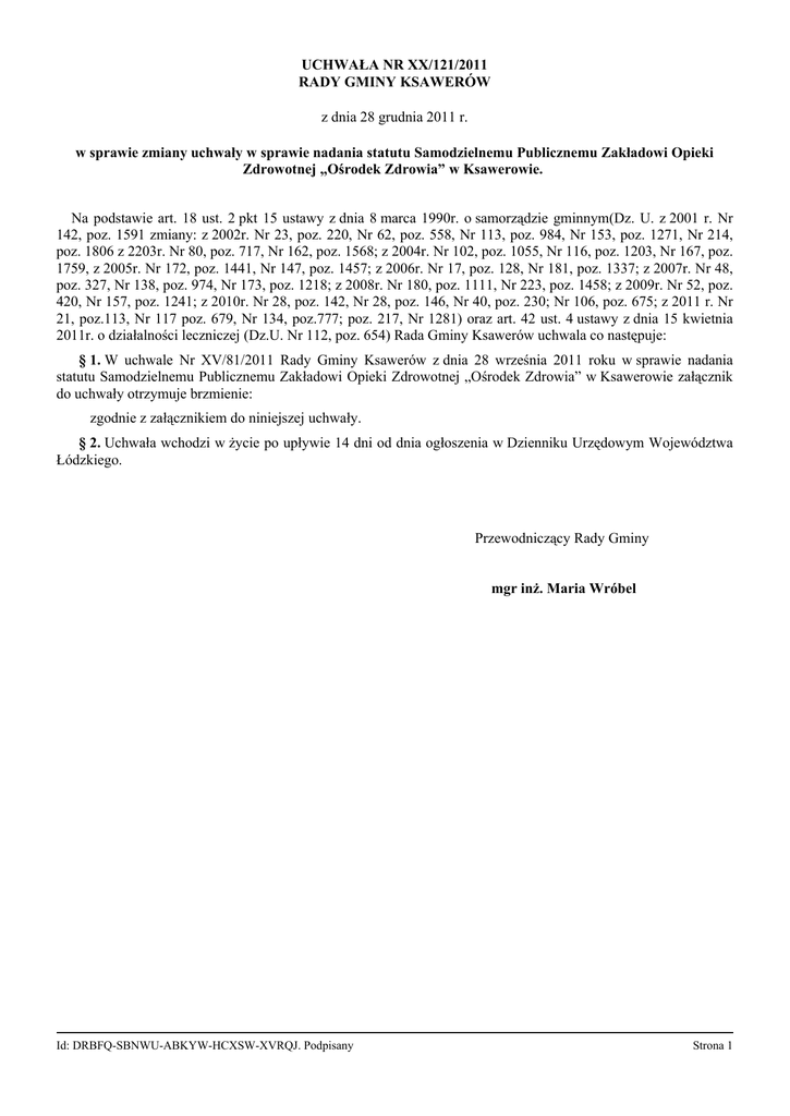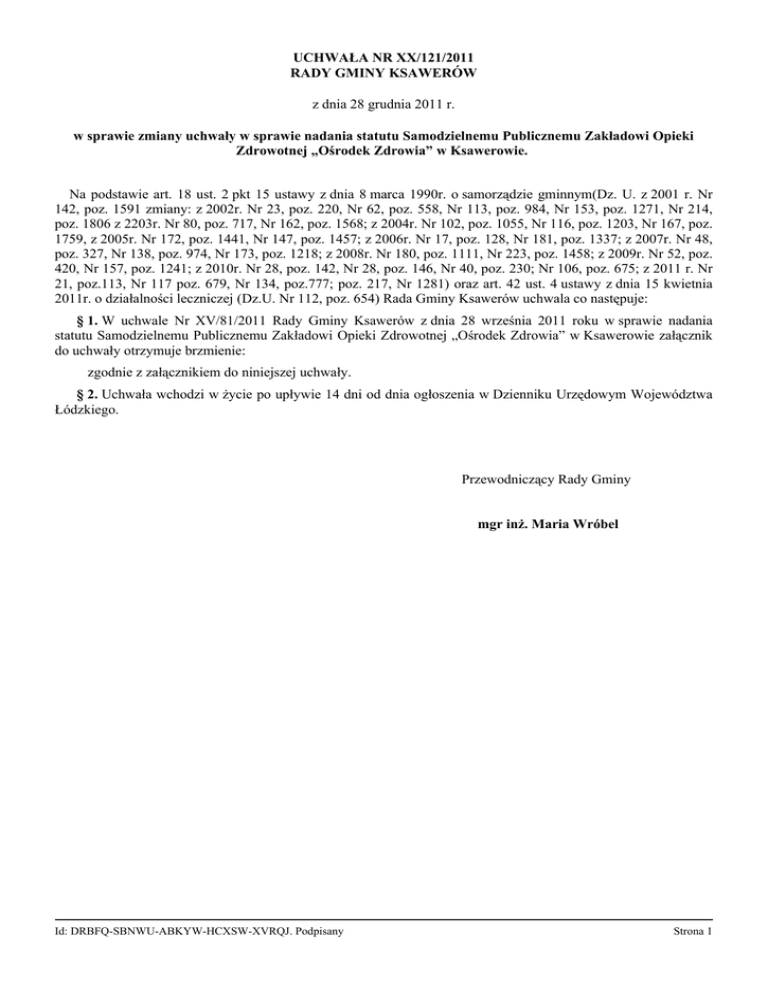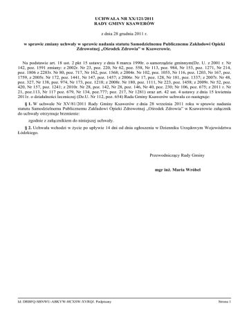 UCHWAŁA NR XX/121/2011 RADY GMINY KSAWERÓW z dnia 28 grudnia 2011 r. w sprawie zmiany uchwały w sprawie nadania statutu Samodzielnemu Publicznemu Zakładowi Opieki Zdrowotnej „Ośrodek Zdrowia” w Ksawerowie. Na podstawie art. 18 ust. 2 pkt 15 ustawy z dnia 8 marca 1990r. o samorządzie gminnym(Dz. U. z 2001 r. Nr 142, poz. 1591 zmiany: z 2002r. Nr 23, poz. 220, Nr 62, poz. 558, Nr 113, poz. 984, Nr 153, poz. 1271, Nr 214, poz. 1806 z 2203r. Nr 80, poz. 717, Nr 162, poz. 1568; z 2004r. Nr 102, poz. 1055, Nr 116, poz. 1203, Nr 167, poz. 1759, z 2005r. Nr 172, poz. 1441, Nr 147, poz. 1457; z 2006r. Nr 17, poz. 128, Nr 181, poz. 1337; z 2007r. Nr 48, poz. 327, Nr 138, poz. 974, Nr 173, poz. 1218; z 2008r. Nr 180, poz. 1111, Nr 223, poz. 1458; z 2009r. Nr 52, poz. 420, Nr 157, poz. 1241; z 2010r. Nr 28, poz. 142, Nr 28, poz. 146, Nr 40, poz. 230; Nr 106, poz. 675; z 2011 r. Nr 21, poz.113, Nr 117 poz. 679, Nr 134, poz.777; poz. 217, Nr 1281) oraz art. 42 ust. 4 ustawy z dnia 15 kwietnia 2011r. o działalności leczniczej (Dz.U. Nr 112, poz. 654) Rada Gminy Ksawerów uchwala co następuje: § 1. W uchwale Nr XV/81/2011 Rady Gminy Ksawerów z dnia 28 września 2011 roku w sprawie nadania statutu Samodzielnemu Publicznemu Zakładowi Opieki Zdrowotnej „Ośrodek Zdrowia” w Ksawerowie załącznik do uchwały otrzymuje brzmienie: zgodnie z załącznikiem do niniejszej uchwały. § 2. Uchwała wchodzi w życie po upływie 14 dni od dnia ogłoszenia w Dzienniku Urzędowym Województwa Łódzkiego. Przewodniczący Rady Gminy mgr inż. Maria Wróbel Id: DRBFQ-SBNWU-ABKYW-HCXSW-XVRQJ. Podpisany Strona 1 Załącznik do Uchwały Nr XX/121/2011 Rady Gminy Ksawerów z dnia 28 grudnia 2011 r. STATUT Samodzielnego Publicznego Zakładu Opieki Zdrowotnej „Ośrodek Zdrowia” w Ksawerowie I. POSTANOWIENIA OGÓLNE § 1. Samodzielny Publiczny Zakład Opieki Zdrowotnej „Ośrodek Zdrowia” w Ksawerowie zwany dalej Ośrodkiem Zdrowia działa na podstawie: 1) ustawy z dnia 15 kwietnia 2011 r. o działalności leczniczej (Dz. U. z 2011 r. Nr 112 poz. 654); 2) uchwały Nr XXIV/156/2000 Rady Gminy Ksawerów z dnia 9 listopada 2000 r. w sprawie utworzenia Samodzielnego Publicznego Zakładu Opieki Zdrowotnej „Ośrodek Zdrowia” w Ksawerowie; 3) uchwały Nr XXX/212/2001 Rady Gminy Ksawerów z dnia 24 maja 2001 r. w sprawie zmiany uchwały Nr XXIV/156/2001 Rady Gminy Ksawerów z dnia 9 listopada 2000 r. w sprawie utworzenia Samodzielnego Publicznego Zakładu Opieki Zdrowotnej w Ksawerowie; 4) uchwały Nr XV/81/2011 Rady Gminy Ksawerów z dnia 28 września 2011 r. w sprawie nadania Statutu Samodzielnego Publicznego Zakładu Opieki Zdrowotnej „Ośrodek Zdrowia” w Ksawerowie; 5) uchwały Nr XX/121/2011 Rady Gminy Ksawerów z dnia 28 grudnia 2011 r. w sprawie zmiany uchwały w sprawie nadania statutu Samodzielnemu Publicznemu Zakładowi Opieki Zdrowotnej „Ośrodek Zdrowia” w Ksawerowie. § 2. 1. Podmiotem tworzącym Ośrodek Zdrowia jest Gmina Ksawerów. 2. Ośrodek Zdrowia uzyskuje osobowość prawną z chwilą wpisu do rejestru publicznych zakładów opieki zdrowotnej prowadzonego przez Krajowy Rejestr Sądowy. 3. Podmiot tworzący sprawuje nadzór nad działalnością Ośrodka Zdrowia. 4. Ośrodek Zdrowia jest podmiotem leczniczym niebędącym przedsiębiorcą. § 3. Siedziba Ośrodka Zdrowia mieści się w Ksawerowie przy ul. Jana Pawła II 27. § 4. Ośrodek Zdrowia prowadzi działalność leczniczą, może również prowadzić wyodrębnioną organizacyjnie działalność, inną niż działalność lecznicza, w zakresie ustalonym postanowieniami Statutu, na rzecz pacjentów zamieszkałych na terenie Rzeczpospolitej Polskiej, przy czym podstawowym obszarem udzielania świadczeń zdrowotnych jest Gmina Ksawerów. II. CELE, ZADANIA I ZAKRES ŚWIADCZEŃ ZDROWOTNYCH § 5. 1. Głównym zadaniem Ośrodka Zdrowia jest podejmowanie działań służących zachowaniu, ratowaniu, przywracaniu lub poprawie zdrowia ludności oraz promocja zdrowia. 2. Ośrodek Zdrowia udziela świadczeń zdrowotnych w rodzaju ambulatoryjnych świadczeń zdrowotnych. § 6. Do podstawowych zadań Ośrodka Zdrowia w zakresie udzielania ambulatoryjnych świadczeń zdrowotnych, należy: 1) organizowanie i sprawowanie podstawowej i specjalistycznej opieki zdrowotnej oraz rehabilitacji leczniczej; 2) organizowanie badań diagnostycznych wykonywanych w celu rozpoznania stanu zdrowia i ustalenia dalszego postępowania leczniczego. § 7. Zakres świadczeń zdrowotnych udzielanych przez Ośrodek Zdrowia obejmuje w szczególności: 1) badania i porady lekarskie; 2) leczenie; 3) prowadzenie dokumentacji medycznej; Id: DRBFQ-SBNWU-ABKYW-HCXSW-XVRQJ. Podpisany Strona 1 4) orzekanie o stanie zdrowia oraz czasowej niezdolności do pracy; 5) opiekę nad kobietą ciężarną i płodem, porodem, połogiem oraz nad noworodkiem; 6) opiekę nad zdrowym dzieckiem; 7) szczepienia ochronne i inne działania zapobiegawcze; 8) opiekę środowiskową i pielęgnację w domu chorego; 9) rehabilitację leczniczą; 10) działania diagnostyczne; 11) udzielanie stomatologicznych świadczeń profilaktyczno-leczniczych; 12) prowadzenie działalności profilaktycznej i oświatowo-wychowawczej; 13) specjalistyczną opiekę zdrowotną; 14) prowadzenie medycznej działalności usługowej, w tym dla innych podmiotów wykonujących działalność leczniczą. § 8. 1. Ośrodek Zdrowia udziela świadczeń zdrowotnych finansowanych ze środków publicznych osobom ubezpieczonym oraz innym osobom, uprawnionym do tych świadczeń na podstawie odrębnych przepisów. 2. Ośrodek Zdrowia udziela świadczeń zdrowotnych nieodpłatnie, za częściową odpłatnością lub całkowitą odpłatnością, na zasadach określonych w obowiązujących przepisach prawa lub w umowie cywilnoprawnej. 3. Wysokość opłat za świadczenia zdrowotne ustala Dyrektor Ośrodka Zdrowia. § 9. 1. Świadczenia zdrowotne w Ośrodku Zdrowia udzielane są przez osoby wykonujące zawód medyczny, spełniają