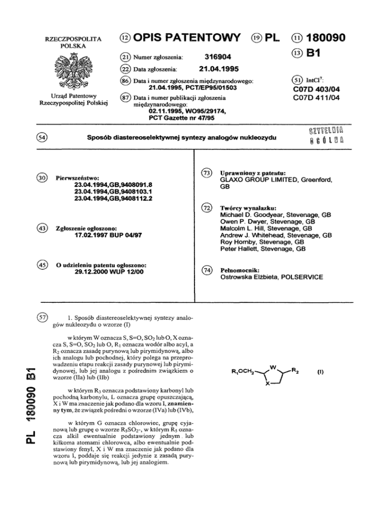 RZECZPOSPOLITA POLSKA (12) OPIS PATENTOWY (19)PL (11) 180090 (13)B1 (21) Numer zgłoszenia: 316904 (22) Data zgłoszenia: 21.04.1995 (86) Data i numer zgłoszenia międzynarodowego: Urząd Patentowy Rzeczypospolitej Polskiej 21.04.1995, PCT/EP95/01503 (87) Data i numer publikacji zgłoszenia międzynarodowego: (51) IntCl7: C07D 403/04 C07D 411/04 02.11.1995, W095/29174, PCTGazette nr 47/95 )Sposób diastereoselektywnej syntezy analogów nukleozydu 4 (5 (30) Pierwszeństwo: 23.04.1994,GB,9408091.8 23.04.1994, GB,9408103.1 23.04.1994,GB,9408112.2 (43) Zgłoszenie ogłoszono: 17.02.1997 BUP 04/97 (45) O udzielenia patentu ogłoszono: 29.12.2000 WUP 12/00 PL 180090 B1 (57 ) 1. Sposób diastereoselektywnej syntezy analogów nukleozydu o wzorze (I) w którym W oznacza S, S=O, SO2 lub O, X oznacza S, S=O, SO2 lub O, R1 oznacza wodór albo acyl, a R2 oznacza zasadę purynową lub pirymidynową, albo ich analogu lub pochodnej, który polega na przeprowadzeniu etapu reakcji zasady purynowej lub pirymidynowej, lub jej analogu z pośrednim związkiem o wzorze (IIa) lub (IIb) w którym R3 oznacza podstawiony karbonyl lub pochodną karbonylu, L oznacza grupę opuszczającą, X i W ma znaczenie jak podano dla wzoru I, znamienny tym, że związek pośredni o wzorze (IVa) lub (IVb), w którym G oznacza chlorowiec, grupę cyjanową lub grupę o wzorze R5SO2-, w którym R5 oznacza alkil ewentualnie podstawiony jednym , lub kilkoma atomami chlorowca, albo ewentualnie podstawiony fenyl, X i W ma znaczenie jak podano dla wzoru I, poddaje się reakcji jedynie z zasadą purynową lub pirymidynową lub jej analogiem. ( 73)Uprawniony z pateutu: GLAXO GROUP LIMITED, Greenford, GB Twórcy wynalazku: Michael D. Goodyear, Stevenage, GB Owen P. Dwyer, Stevenage, GB Malcolm L. Hill, Stevenage, GB Andrew J. Whitehead, Stevenage, GB Roy Homby, Stevenage, GB Peter Hallett, Stevenage, GB Pełnomocnik: Ostrowska Elżbieta, POLSERVICE Sposób diastereoselektywnej syntezy analogów nukleozydu Zastrzeżenia patentowe 1. Sposób diastereoselektywnej syntezy analogów nukleozydu o wzorze (I) W którym W oznacza S, S = 0, SO2 lub O, X oznacza S, S=0, SO2 lub O, R, oznacza wodór albo acyl, a R2 oznacza zasadę purynow ą lub pirymidynową, albo ich analogu lub pochodnej, który polega na przeprowadzeniu etapu reakcji zasady purynowej lub pirymidynowej, lub jej analogu z pośrednim związkiem o wzorze (IIa) lub (IIb) (IIa) (IIb) w którym R3 oznacza podstawiony karbonyl lub pochodną karbonylu, L oznacza grupę opuszczającą, X i W ma znaczenie jak podano dla wzoru I, znamienny tym, że związek pośredni o wzorze (IVa) lub (IVb), (IVa) w którym G oznacza chlorowiec, grupę cyjanową lub grupę o wzorze R5SO2-, w którym R5 oznacza alkil ewentualnie podstawiony jednym lub kilkoma atomami chlorowca, albo ewentualnie podstawiony fenyl, X i W ma znaczenie jak podano dla wzoru I, poddaje się reakcji jedynie z zasadą purynową lub pirymidynową, lub jej analogiem. 2. Sposób według zastrz. 1, znamienny tym, że dodatkowo obejmuje etap redukcji R3 do grupy R 1OCH2 3. Sposób według zastrz. 2, znamienny tym, że redukcję prowadzi się stosując borowodorek sodu w obecności borowodoru lub buforu fosforanowego. 4. Sposób według dowolnego z zastrz. 1, znamienny tym, że R2 oznacza korzystnie zasadę pirymidynową. 5. Sposób według zastrz. 4, znam ienny tym, że R2 oznacza cytozynę lub 5-fluorocytozynę. 6. Sposób według dowolnego z zastrz. 1, znamienny tym, że R3 oznacza korzystnie grupę o wzorze -(C=O)OR4, w którym R4 oznacza ewentualnie podstawioną grupę alkilową. 7. Sposób według zastrz. 6, znamienny tym, że R4 oznacza grupę chiralną. 8. Sposób według zastrz. 7, znamienny tym, że R4jest wybrany z (d)-mentylu, (l)-m entylu, (d)-8-fenylomentylu, (1)-8-fenylomentylu, (+)-norefedryny i (-)-norefedryny. 9. Sposób według zastrz. 1, znamienny tym, że W oznacza korzystnie O, a X oznacza S. 10. Sposób według zastrz. 1, znamienny tym, że G oznacza korzystnie Cl, Br lub I. 11. Sposób według zastrz. 1, znamienny tym, że związek o wzorze (I) korzystnie wyodrębnia się jako nierozpuszczalną w wodzie sól. 12. Sposób według zastrz. 1, znamienny tym, że korzystnym związkiem o wzorze (I) jest 4-am ino-1-(2R-hydroksym etylo[1,3]oksatiolan-5S-ylo)-1H-pirydyn-2-on lub jego sól salicylanową. 13. Sposób według zastrz. 1, znamienny tym, że pośrednie związki o wzorze (IVa) i (IVb) wytwarza się z odpowiednich trans alkoholi o wzorach (Va) i (Vb) (Va) (Vb) 180 090 3 w których R3, W i X mają znaczenie podane w zastrz. 1 albo z epimerycznych cis alkoholi, przez reakcję z reagentem właściwym dla wprowadzenia grupy G. 14. Sposób w edług zastrz. 13, znam ienny tym , że pośrednie zw iązki o w zorach (IVa) i (IVb) są wytwarzane in situ. 15. Sposób wytwarzania izomerów trans (Va) i (Vb) ze zwiększoną wydajnością z mieszaniny izomerów trans i cis, znamienny tym, że traktuje się mieszaninę izomerów trans i cis, co najmniej częściowo w roztworze, środkiem zdolnym do wywołania inwersji izomerów bez całkowitego stłumienia krystalizacji izomerów trans, korzystnie organiczną zasadą, taką jak am ina czwartorzędowa. 16. Sposób wytwarzania pojedynczego enancjomeru o wzorze (Va) lub (Vb) z mieszaniny izomerów, znamienny tym, że traktuje się mieszaninę izomerów, co najmniej częściowo w roztworze, środkiem zdolnym do wywołania inwersji izomerów bez całkowitego stłumienia krystalizacji pożądanego, pojedynczego enancjomeru (Va) lub (Vb), korzystnie organiczną zasadą, taką jak amina czwartorzędowa. 17. Sposób według zastrz. 16, znamienny tym, że prowadzi się selektywną krystalizację związków o wzorze (Va), w którym R3 oznacza -C(=O)OR4, w którym R4 oznacza 1-mentyl, z mieszaniny stereoizomerów, zawierających alkohole (Va), (Vb) i epimeryczne cis alkohole. 18. Sposób według zastrz. 16, znamienny tym, że prowadzi się selektywną krystalizację związków o wzorze (Vb),