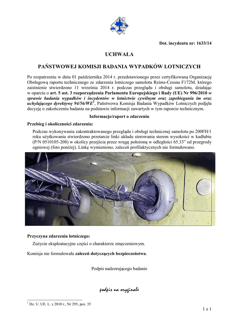 Dot. incydentu nr: 1633/14 UCHWAŁA PAŃSTWOWEJ KOMISJI BADANIA WYPADKÓW LOTNICZYCH Po rozpatrzeniu w dniu 01 października 2014 r. przedstawionego przez certyfikowaną Organizację Obsługową raportu technicznego ze zdarzenia lotniczego samolotu Reims-Cessna F172M, którego zaistnienie stwierdzono 11 września 2014 r. podczas przeglądu i obsługi samolotu, działając w oparciu o art. 5 ust. 3 rozporządzenia Parlamentu Europejskiego i Rady (UE) Nr 996/2010 w sprawie badania wypadków i incydentów w lotnictwie cywilnym oraz zapobiegania im oraz uchylającego dyrektywę 94/56/WE1, Państwowa Komisja Badania Wypadków Lotniczych podjęła decyzję o zakończeniu badania na podstawie informacji zawartych w tym raporcie technicznym. Informacje/raport o zdarzeniu Przebieg i okoliczności zdarzenia: Podczas wykonywania zakontraktowanego przeglądu i obsługi technicznej samolotu po 200FH/1 roku użytkowania stwierdzono przetarcie linki układu sterowania sterem wysokości w kadłubie (P/N 0510105-208) w okolicy przejścia przez wręgę położoną w odległości 65.33” od przegrody ogniowej (foto poniżej). Linkę wymieniono, zaleceń profilaktycznych nie formułowano. Przyczyna zdarzenia lotniczego: Zużycie eksploatacyjne części o charakterze zmęczeniowym. Komisja nie formułowała zaleceń dotyczących bezpieczeństwa. Podpis nadzorującego badanie podpis na oryginale 1 Dz. U. UE. L. z 2010 r., Nr 295, poz. 35 1z1