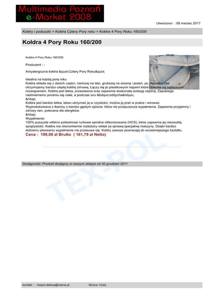 Utworzono : 08 marzec 2017 Kołdry i poduszki > Kołdra Cztery Pory roku > Kołdra 4 Pory Roku 160/200 Kołdra 4 Pory Roku 160/200 Model : - Kołdra 4 Pory Roku 160/200 Producent : Antyalergiczna kołdra "Cztery Pory Roku" Idealna na każdą porę roku Kołdra składa się z dwóch części: cieńszej na lato, grubszej na wiosnę i jesień, po złączeniu zaś otrzymujemy bardzo ciepłą kołdrę zimową. Łączy się je plastikowymi napami które obecnie są najlepszym rozwiązaniem. Kołdra jest lekka, przewiewna oraz zapewnia doskonałą izolację cieplną. Zapobiega nadmiernemu poceniu się ciała, a podczas snu „oddycha”. Kołdra jest bardzo lekka, łatwo utrzymać ją w czystości, można ją prać w pralce i wirować. Wyprodukowana z tkaniny o bardzo gęstym splocie, która nie przepuszcza wypełnienia. Zapewnia przyjemny i zdrowy sen, polecana dla alergików. Wypełnienie: 100% puszyste włókno poliestrowe rurkowe spiralne silikonizowane (HCS), które zapewnia jej niezwykłą sprężystość. Kołdra ma równomiernie rozłożony wkład za sprawą specjalnej maszyny. Dzięki bardzo dobremu pikowaniu wypełnienie nie przesuwa się. Kołdry zawsze powracają do wcześniejszego kształtu. L O Cena : 199,00 zł Brutto ( 161,79 zł Netto) P X Dostępność: Produkt dostępny w naszym sklepie od 30 grudzień 2011 E T kontakt : - [email protected] Strona 1/{nb}