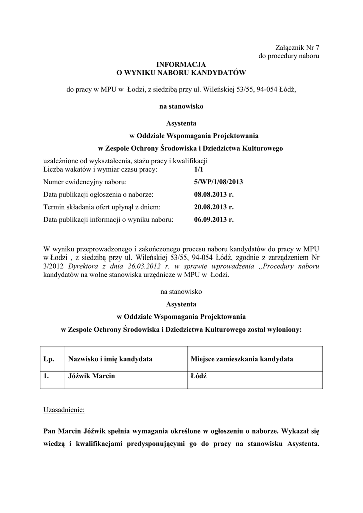 Załącznik Nr 7 do procedury naboru INFORMACJA O WYNIKU NABORU KANDYDATÓW do pracy w MPU w Łodzi, z siedzibą przy ul. Wileńskiej 53/55, 94-054 Łódź, na stanowisko Asystenta w Oddziale Wspomagania Projektowania w Zespole Ochrony Środowiska i Dziedzictwa Kulturowego uzależnione od wykształcenia, stażu pracy i kwalifikacji Liczba wakatów i wymiar czasu pracy: 1/1 Numer ewidencyjny naboru: 5/WP/1/08/2013 Data publikacji ogłoszenia o naborze: 08.08.2013 r. Termin składania ofert upłynął z dniem: 20.08.2013 r. Data publikacji informacji o wyniku naboru: 06.09.2013 r. W wyniku przeprowadzonego i zakończonego procesu naboru kandydatów do pracy w MPU w Łodzi , z siedzibą przy ul. Wileńskiej 53/55, 94-054 Łódź, zgodnie z zarządzeniem Nr 3/2012 Dyrektora z dnia 26.03.2012 r. w sprawie wprowadzenia „Procedury naboru kandydatów na wolne stanowiska urzędnicze w MPU w Łodzi. na stanowisko Asystenta w Oddziale Wspomagania Projektowania w Zespole Ochrony Środowiska i Dziedzictwa Kulturowego został wyłoniony: Lp. Nazwisko i imię kandydata Miejsce zamieszkania kandydata 1. Jóźwik Marcin Łódź Uzasadnienie: Pan Marcin Jóźwik spełnia wymagania określone w ogłoszeniu o naborze. Wykazał się wiedzą i kwalifikacjami predysponującymi go do pracy na stanowisku Asystenta. Posiadana przez Pana Marcina Jóźwik wiedza oraz doświadczenie zawodowe umożliwią właściwe wykonywanie zadań na w/w stanowisku. Dokumenty kandydatów będą przechowywane w Oddziale Administracyjno-Organizacyjnym MPU w Łodzi przez okres 1 miesiąca od dnia upowszechnienia informacji o wyniku naboru. W okresie tym kandydaci będą mogli dokonywać odbioru swoich dokumentów za potwierdzeniem odbioru. MPU w Łodzi nie odsyła dokumentów kandydatom. Przewodniczący Komisji ds. Naboru …………………………….. /podpis i pieczątka