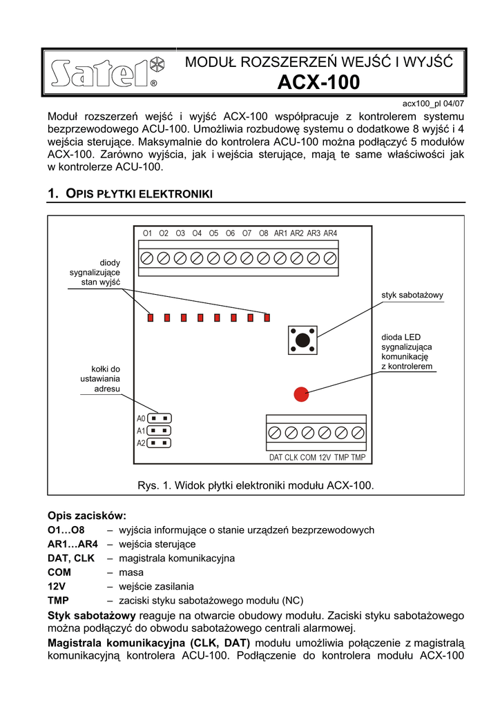 MODUŁ ROZSZERZEŃ WEJŚĆ I WYJŚĆ ® ACX-100 acx100_pl 04/07 Moduł rozszerzeń wejść i wyjść ACX-100 współpracuje z kontrolerem systemu bezprzewodowego ACU-100. Umożliwia rozbudowę systemu o dodatkowe 8 wyjść i 4 wejścia sterujące. Maksymalnie do kontrolera ACU-100 można podłączyć 5 modułów ACX-100. Zarówno wyjścia, jak i wejścia sterujące, mają te same właściwości jak w kontrolerze ACU-100. 1. OPIS PŁYTKI ELEKTRONIKI diody sygnalizujące stan wyjść styk sabotażowy dioda LED sygnalizująca komunikację z kontrolerem kołki do ustawiania adresu Rys. 1. Widok płytki elektroniki modułu ACX-100. Opis zacisków: O1…O8 AR1…AR4 DAT, CLK COM 12V TMP – – – – – – wyjścia informujące o stanie urządzeń bezprzewodowych wejścia sterujące magistrala komunikacyjna masa wejście zasilania zaciski styku sabotażowego modułu (NC) Styk sabotażowy reaguje na otwarcie obudowy modułu. Zaciski styku sabotażowego można podłączyć do obwodu sabotażowego centrali alarmowej. Magistrala komunikacyjna (CLK, DAT) modułu umożliwia połączenie z magistralą komunikacyjną kontrolera ACU-100. Podłączenie do kontrolera modułu ACX-100 2 SATEL ACX-100 wyklucza możliwość połączenia kontrolera z centralą alarmową za pośrednictwem magistrali komunikacyjnej. Dioda LED umieszczona obok zacisków magistrali komunikacyjnej sygnalizuje miganiem komunikację z kontrolerem ACU-100. Częstotliwość migania jest uzależniona od ilości modułów ACX-100 podłączonych do kontrolera: im więcej modułów, tym wolniej miga dioda. W przypadku braku komunikacji z kontrolerem dioda świeci ciągle, a dodatkowo zapalają się wszystkie diody sygnalizujące stan wyjść. Kołki A0, A1 i A2 służą do ustawiania indywidualnego adresu modułu (patrz tabela 1). Każdy moduł ACX-100 podłączony do kontrolera ACU-100 musi mieć ustawiony inny adres z zakresu od 0 do 4 (ustawienie wyższego adresu odczytywane jest jak 4). Adres ten musi odpowiadać numerowi kolejnego modułu w systemie zgodnie z tabelą 2. Jeżeli do kontrolera podłączony jest jeden moduł ACX-100, musi on mieć ustawiony adres 0, jeżeli dwa, to jeden z nich musi mieć ustawiony adres 0, a drugi adres 1 itd. Kołki Wartość liczbowa A0 A1 A2 (przy założonej zworce) 1 2 4 Tabela 1. Numer kolejny modułu Adres modułu 1 2 3 4 5 0 1 2 3 4 A0 Kołki A1 A2 – kołki zwarte – kołki rozwarte Tabela 2. Sposób numeracji wyjść i wejść sterujących modułów ACX-100 w systemie bezprzewodowym opisany został w instrukcji kontrolera ACU-100. 2. MONTAŻ Moduł rozszerzeń wejść i wyjść ACX-100 jest montowany w obudowie plastikowej. Powinien być instalowany w pomieszczeniach zamkniętych, o normalnej wilgotności powietrza. Zaleca się, aby wszystkie połączenia wykonywać przy odłączonym zasilaniu. Ze względu na konieczność łączenia wyjść i wejść modułu z centralą alarmową, wskazane jest, aby miejsce montażu modułu znajdowało się w pobliżu centrali. Pozwoli to zminimalizować długość przewodów łączących moduł z centralą. Pozostałe informacje dotyczące pracy modułu ACX-100 w systemie bezprzewodowym, wykorzystania wyjść i wejść sterujących zawarte są w instrukcji kontrolera ACU-100. ACX-100 SATEL 3 zasilanie modułu zasilanie kontrolera Rys. 2. Przykład podłączenia modułu ACX-100 do kontrolera ACU-100. Moduł może być zasilany z centrali alarmowej lub dodatkowego zasilacza. 4 SATEL ACX-100 3. DANE TECHNICZNE Znamionowe napięcie zasilania.............................................................. 12 V DC ±15% Średni pobór prądu ................................................................................................ 26 mA Obciążalność prądowa wyjść ................................................................................ 50 mA Zakres temperatur pracy ................................................................................. 0...+55 °C Wymiary obudowy .................................................................................. 72x118x24 mm Masa ......................................................................................................................... 65 g DEKLARACJA ZGODNOŚCI Producent: SATEL spółka z o.o. ul. Schuberta 79 80-172 Gdańsk, POLSKA tel. (+48 58) 320-94-00 fax. (+48 58) 320-94-01 Opis wyrobu: Ekspander kontrolera ACU-100, zwiększający ilość wejść i wyjść kontrolera ACU-100. Urządzenie przeznaczone jest do zastosowania w systemach sygnalizacji włamania i napadu. Wyrób jest zgodny z Dyrektywami Unii Europejskiej: R&TTE 1999/5/EC Wyrób spełnia wymagania norm zharmonizowanych: EMC: ETSI EN 301 489-1: v.1.5.1.; EN 301 489-3: v.1.4.1 Bezpieczeństwo: EN60950-1:2001 Jednostka notyfikowana biorąca udział w ocenie zgodności: Nr identyfikacyjny: 1471 Kierownik Działu Badań: Gdańsk, Polska 2005-07-15 Michał Konarski Aktualną treść deklaracji zgodności EC i certyfikatów można pobrać ze strony internetowej www.satel.pl Wyrób: ACX-100 – Ekspander kontrolera systemu bezprzewodowego ABAX