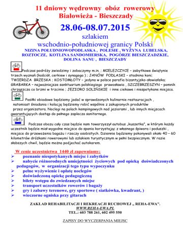 11 dniowy wędrowny obóz rowerowy Białowieża - Bieszczady 28.06-08.07.2015 szlakiem wschodnio-południowej granicy Polski NIZINA POŁUDNIOWOPODLASKA , POLESIE , WYŻYNA LUBELSKA, ROZTOCZE, KOTLINA SANDOMIERSKA, POGÓRZE BIESZCZADZKIE, DOLINA SANU , BIESZCZADY Podczas podróży zwiedzimy i zobaczymy m.in. ; MIELEJCZYCE – zabytkowe świątynie trzech wyznań (kościół, cerkiew i synagoga ) ; JANÓW PODLASKI – stadnina koni; TWIERDZA BRZESKA ; KOSTOMŁOTY – jedyna w polsce parafia bizantyjsko-słowiańska; GRABARKA – najważniejsze sanktuarium polskiegiego prawosławia , SZCZEBRZESZYN – pomnik chrząszcza co brzmi w trzcinie ; JEZIORO SOLIŃSKIE i inne ciekawe i niespotykane miejsca. Posiłki obiadowe będziemy jadać w sprawdzonych kulinarnie restauracjach , natomiast śniadania i kolację będziemy robić wspólnie z zakupionych produktów przez organizatora. Noclegi na polach kempingowych nad jeziorami , lub innych miejscach gwarantujących dostęp do pełnego zaplecza sanitarnego. . Podczas obozu cały czas będzie nam towarzyszył autobus „kuszetka”, w którym każdy uczestnik będzie miał wygodne miejsce do spania korzystając z własnego śpiwora i poduszki , miejsce do przewożenia bagażu i rzeczy osobistych. Dziennie będziemy pokonywali około 40 – 60 kilometrów dróżkami rowerowymi lub szlakiem turystycznym w pełni bezpiecznym. W razie słabszych chwil, będzie można podjechać autokarem. W cenie uczestnictwa 1440 zł zapewniamy; poznanie niespotykanych miejsc i zabytków nabycie różnorodnych umiejętności życiowych pod opieką doświadczonych pedagogów, w organizacji tego typu wypoczynku pełne wyżywienie i opłatę noclegów doświadczoną opiekę pedagogiczną bilety wstępu do zwiedzanych miejsc transport uczestników rowerów i bagaży gry i zabawy terenowe, gry sportowe ( siatkówka, kwadrant, ) wieczorne ogniska przy gitarach ZAKŁAD REHABILITACJI I REKREACJI RUCHOWEJ „ REHA-EWA”. WWW.REHA-EWA.PL TEL.: 603 788 261, 602 495 550 ZAPISY DO WYCZERPANIA MIEJSC