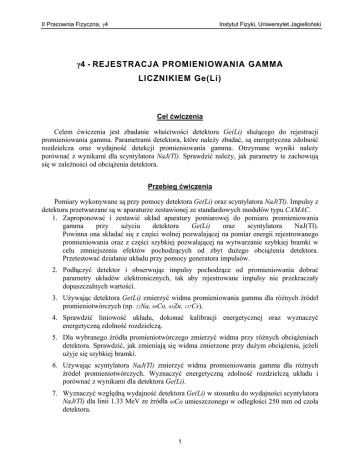 II Pracownia Fizyczna, γ4 Instytut Fizyki, Uniwersytet Jagielloński γ4 - REJESTRACJA PROMIENIOWANIA GAMMA LICZNIKIEM Ge(Li) Cel ćwiczenia Celem ćwiczenia jest zbadanie właściwości detektora Ge(Li) służącego do rejestracji promieniowania gamma. Parametrami detektora, które należy zbadać, są energetyczna zdolność rozdzielcza oraz wydajność detekcji promieniowania gamma. Otrzymane wyniki należy porównać z wynikami dla scyntylatora NaJ(Tl). Sprawdzić należy, jak parametry te zachowują się w zależności od obciążenia detektora. Przebieg ćwiczenia Pomiary wykonywane są przy pomocy detektora Ge(Li) oraz scyntylatora NaJ(Tl). Impulsy z detektora przetwarzane są w aparaturze zestawionej ze standardowych modułów typu CAMAC. 1. Zaproponować i zestawić układ aparatury pomiarowej do pomiaru promieniowania gamma przy użyciu detektora Ge(Li) oraz scyntylatora NaJ(Tl). Powinna ona składać się z części wolnej pozwalającej na pomiar energii rejestrowanego promieniowania oraz z części szybkiej pozwalającej na wytwarzanie szybkiej bramki w celu zmniejszenia efektów pochodzących od zbyt dużego obciążenia detektora. Przetestować działanie układu przy pomocy generatora impulsów. 2. Podłączyć detektor i obserwując impulsy pochodzące od promieniowania dobrać parametry układów elektronicznych, tak aby rejestrowane impulsy nie przekraczały dopuszczalnych wartości. 3. Używając detektora Ge(Li) zmierzyć widma promieniowania gamma dla różnych źródeł promieniotwórczych (np. 22Na, 60Co, 65Zn, 137Cs). 4. Sprawdzić liniowość układu, dokonać kalibracji energetycznej oraz wyznaczyć energetyczną zdolność rozdzielczą. 5. Dla wybranego źródła promieniotwórczego zmierzyć widma przy różnych obciążeniach detektora. Sprawdzić, jak zmieniają się widma zmierzone przy dużym obciążeniu, jeżeli użyje się szybkiej bramki. 6. Używając scyntylatora NaJ(Tl) zmierzyć widma promieniowania gamma dla różnych źródeł promieniotwórczych. Wyznaczyć energetyczną zdolność rozdzielczą układu i porównać z wynikami dla detektora Ge(Li). 7. Wyznaczyć względną wydajność detektora Ge(Li) w stosunku do wydajności scyntylatora NaJ(Tl) dla linii 1.33 MeV ze źródła 60Co umieszczonego w odległości 250 mm od czoła detektora. 1 II Pracownia Fizyczna, γ4 Instytut Fizyki, Uniwersytet Jagielloński Problemy do kolokwium 1. Własności promieniowania gamma i jego oddziaływanie z materią. 2. Liczniki Ge(Li) i scyntylatory NaJ(Tl), zdolność rozdzielcza, wydajność. 3. Ogólne wiadomości o sposobach wzmacniania i kształtowania sygnałów. Literatura 1. Strzałkowski, „Wstęp do fizyki jądra atomowego”, PWN 1978 2. W. R. Leo, „Techniques for Nuclear and Particle Physics Experiments”, Springer, BerlinHeidelberg 1987 3. E. Fünfer, H. Neuert, „Liczniki promieniowania”, PWN 1960 4. J. B. E. England, „Metody doświadczalne fizyki jądrowej”, PWN 1980 5. Instrukcje obsługi oscyloskopu i modułów CAMAC (dostępne w Pracowni Jądrowej) 2
