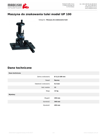 Maszyna do znakowania tulei model UP 100 Kategoria : Maszyny do znakowania tulei Dane techniczne Dane techniczne Zakres znakowania Ø 11,5-100 mm Napęd Ręczny Głębokość znakowania 0,5 mm Ilość znaków Waga 22 12 kg Wymiary Dokument wygenerowany 8-03-2017 Długość 250 mm Szerokość 340 mm Wysokość 450 mm 1/1 www.madejski.com.pl