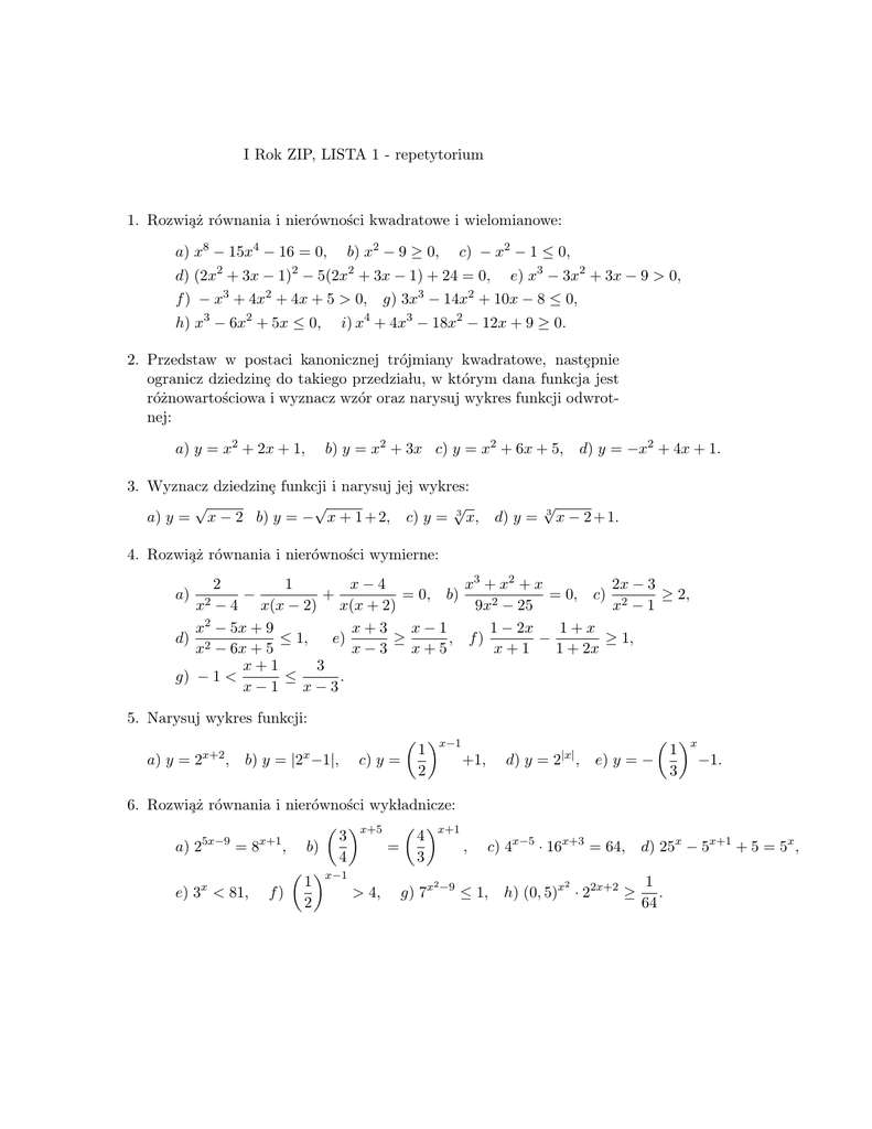 I Rok ZIP, LISTA 1 - repetytorium 1. Rozwia˙z równania i
