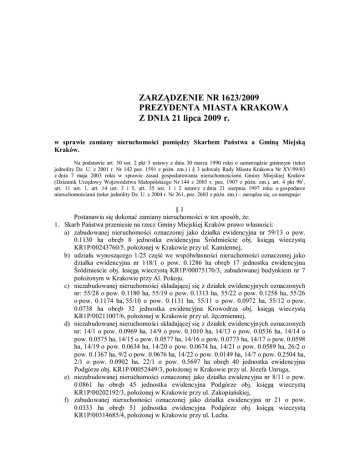 ZARZĄDZENIE NR 1623/2009 PREZYDENTA MIASTA KRAKOWA Z DNIA 21 lipca 2009 r. w sprawie zamiany nieruchomości pomiędzy Skarbem Państwa a Gminą Miejską Kraków. Na podstawie art. 30 ust. 2 pkt 3 ustawy z dnia 30 marca 1990 roku o samorządzie gminnym (tekst jednolity Dz. U. z 2001 r. Nr 142 poz. 1591 z późn. zm.) i § 3 uchwały Rady Miasta Krakowa Nr XV/99/03 z dnia 7 maja 2003 roku w sprawie zasad gospodarowania nieruchomościami Gminy Miejskiej Kraków (Dziennik Urzędowy Województwa Małopolskiego Nr 144 z 2003 r. poz. 1907 z późn. zm.), art. 4 pkt 9b1, art. 11 ust. 1, art. 14 ust. 3 i 5, art. 35 ust. 1 i 2 ustawy z dnia 21 sierpnia 1997 roku o gospodarce nieruchomościami (tekst jednolity Dz. U. z 2004 r. Nr 261, poz. 2603 z późn. zm.) – zarządza się, co następuje: §1 Postanawia się dokonać zamiany nieruchomości w ten sposób, że: 1. Skarb Państwa przeniesie na rzecz Gminy Miejskiej Kraków prawo własności: a) zabudowanej nieruchomości oznaczonej jako działka ewidencyjna nr 59/13 o pow. 0.1130 ha obręb 8 jednostka ewidencyjna Śródmieście obj. księgą wieczystą KR1P/00243760/5, położonej w Krakowie przy ul. Kamiennej, b) udziału wynoszącego 1/25 część we współwłasności nieruchomości oznaczonej jako działka ewidencyjna nr 118/1 o pow. 0.1286 ha obręb 17 jednostka ewidencyjna Śródmieście obj. księgą wieczystą KR1P/00075170/3, zabudowanej budynkiem nr 7 położonym w Krakowie przy Al. Pokoju. c) niezabudowanej nieruchomości składającej się z działek ewidencyjnych oznaczonych nr: 55/28 o pow. 0.1180 ha, 55/19 o pow. 0.1313 ha, 55/22 o pow. 0.1258 ha, 55/26 o pow. 0.1174 ha, 55/10 o pow. 0.1131 ha, 55/11 o pow. 0.0972 ha, 55/12 o pow. 0.0738 ha obręb 32 jednostka ewidencyjna Krowodrza obj. księgą wieczystą KR1P/00211007/6, położonej w Krakowie przy ul. Jęczmiennej, d) niezabudowanej nieruchomości składającej się z działek ewidencyjnych oznaczonych nr: 14/1 o pow. 0.0969 ha, 14/9 o pow. 0.1010 ha, 14/13 o pow. 0.0536 ha, 14/14 o pow. 0.0575 ha, 14/15 o pow. 0.0577 ha, 14/16 o pow. 0.0773 ha, 14/17 o pow. 0.0598 ha, 14/19 o pow. 0.0634 ha, 14/20 o pow. 0.0674 ha, 14/21 o pow. 0.0589 ha, 26/2 o pow. 0.1367 ha, 9/2 o pow. 0.0676 ha, 14/22 o pow. 0.0149 ha, 14/7 o pow. 0.2504 ha, 2/1 o pow. 0.0902 ha, 22/1 o pow. 0.5697 ha obręb 40 jednostka ewidencyjna Podgórze obj. KR1P/00052449/3, położonej w Krakowie przy ul. Józefa Unruga, e) niezabudowanej nieruchomości oznaczonej jako działka ewidencyjna nr 8/11 o pow. 0.0861 ha obręb 45 jednostka ewidencyjna Podgórze obj. księgą wieczystą KR1P/00202192/3, położonej w Krakowie przy ul. Zakopiańskiej, f) zabudowanej nieruchomości oznaczonej jako działka ewidencyjna nr 21 o pow. 0.0333 ha obręb 51 jednostka ewidencyjna Podgórze obj. księgą wieczystą KR1P/00314685/4, położonej w Krakowie przy ul. Lecha. 2. W zamian za nieruchomości opisane w pkt 1 Gmina Miejska Kraków przeniesie na rzecz Skarbu Państwa prawo własności: a) zabudowanej nieruchomości oznaczonej jako działka ewidencyjna nr 446/8 o pow. 0.1795 ha obręb 5 jednostka ewidencyjna Śródmieście obj. księgą wieczystą KR1P/00124702/1, położonej w Krakowie przy ul. Przy Rondzie, b) zabudowanej nieruchomości oznaczonej jako działka ewidencyjna nr 107/4 o pow. 0.0327 ha obręb 50 jednostka ewidencyjna Śródmieście obj. księgą wieczystą KR1P/00327852/0, położonej w Krakowie przy ul. Rakowickiej 10, c) niezabudowanej nieruchomości oznaczonej jako działka ewidencyjna nr 289 o pow. 0.0367 ha obręb 13 jednostka ewidencyjna Podgórze obj. KW 3681, położonej w Krakowie przy ul. Rękawka, d) nieruchomości oznaczonej jako działka ewidencyjna nr 131/2 o pow. 0.4433 ha obręb 22 jednostka ewidencyjna Śródmieście obj. KW 75072, położonej w Krakowie w rejonie ul. Strzelców i ul. Rozrywka, e) nieruchomości oznaczonej jako działka ewidencyjna nr 681/25 o pow. 0.1820 ha obręb 22 jednostka ewidencyjna Śródmieście obj. KW 254860, położonej w Krakowie przy ul. Strzelców, f) nieruchomości oznaczonej jako działka ewidencyjna nr 134/40 o pow. 0,0963 ha obręb 22 jednostka ewidencyjna Śródmieście obj. KW 236401, położonej w Krakowie w rejonie ul. Strzelców i ul. Rozrywka. §2 Postanawia się podać do publicznej wiadomości przez wywieszenie na tablicach ogłoszeń w budynkach Urzędu Miasta Krakowa przy Placu Wszystkich Świętych 3/4 i przy ulicy Kasprowicza 29 oraz budynku Małopolskiego Urzędu Wojewódzkiego w Krakowie przy ul. Basztowej 22 na okres 21 dni wykaz, o którym mowa w § 1. §3 Zawarcie umowy w formie aktu notarialnego nastąpić może po wydaniu przez Wojewodę Małopolskiego zarządzenia w sprawie wyrażenia zgody na zamianę nieruchomości. §4 Wykonanie zarządzenia powierza się Dyrektorowi Wydziału Skarbu Miasta. §5 Zarządzenie wchodzi w życie z dniem podpisania. Prezydent Miasta Krakowa /-/ Załącznik do zarządzenia Nr 1623/2009 Prezydenta Miasta Krakowa z dnia 21 lipca 2009 r. Wyka z nieruchomości przeznaczonych do zamiany pomiędzy Skarbem Państwa a Gminą Miejską Kraków, na podstawie art. 4 pkt 9b1, art. 11 ust. 1, art. 14 ust. 3 i 5, art. 35 ust. 1 i 2 ustawy z dnia 21 sierpnia 1997 roku o gospodarce nieruchomościami (tekst jednolity Dz.U. z 2004 roku Nr 261, poz. 2603 z późn. zm.) Lp Numer działki Pow. w ha Obręb Księga wieczysta Przeznaczenie nieruchomości Położenie nieruchomości Wartość netto nieruchomości nieruchomości przeznaczone do przekazania w formie zamiany przez Skarb Państwa 1. 59/13 0.1130 8 Śródmieście KR1P/00243760/5 Decyzja nr WZ nr AU-2/7331/1008/2009 – zabudowa usługowa ul. Kamienna 698.747,00 zł al. Pokoju 7 907.537,00 zł W studium uwarunkowań i kierunków zagospodarowania przestrzennego Miasta Krakowa, nieruchomość znajduje się w terenach kolejowy w ramach jednego z centrów miejskich – Nowe Centrum Miasta, ponadto teren znajduje się w granicach układu urbanistycznego miasta Krakowa w historycznych
