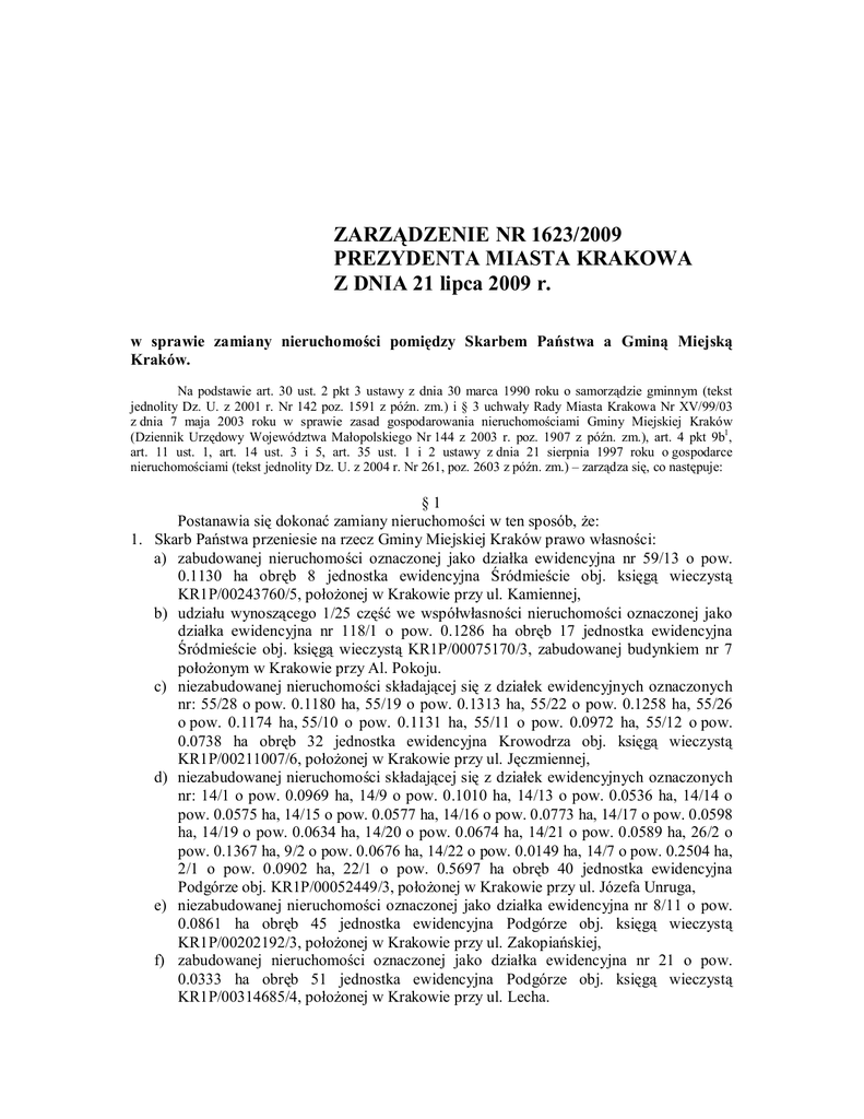 ZARZĄDZENIE NR 1623/2009 PREZYDENTA MIASTA KRAKOWA Z