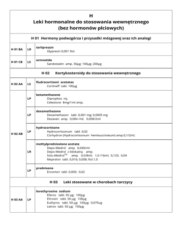 H Leki hormonalne do stosowania wewnętrznego (bez hormonów płciowych) H 01 Hormony podwzgórza i przysadki mózgowej oraz ich analogi H 01 BA LR terlipressin Glypresin 0,001 fiol. H 01 CB LS octreotide Sandostatin amp. 50µg; 100µg; 200µg H 02 H 02 AA H 02 AB Kortykosteroidy do stosowania wewnętrznego LS fludrocortisoni acetatas Cortineff tabl. 100µg LP betamethasone Diprophos inj. Celestone $mg/1ml amp. LP dexamethasone Dexamethason tabl. 0,001 mg; 0,0005 mg Dexaven amp. 0,004 /ml; 0,008/2ml LP hydrocortisone Hydrocortisonum tabl. 0,02 Corhydron (Hydrocortisonum hemisuccinatum) amp.0,1/2ml; LR methylprednisolone acetate Depo-Medrol amp. 0,040/ml Depo-Medrol z lidokainą amp. TM Solu-Medrol amp. 0,5/8ml; 1,0 /16ml; 0,125; 0,04 Meprelon tabl. 0,016; 0,008; fiol.1,0 LP prednisone Encorton tabl. 0,005; 0,02 H 03 H 03 AA LP Leki stosowane w chorobach tarczycy levothyroxine sodium Eferox tabl. 50 μg; 100μg Eltroxin tabl. 50 μg; 100μg Euthyrox tabl. 50 μg; 100μg; 0,075ug Letrox tabl. 50 μg; 100μg H 03 BA LS propylthiouracil Propycil tabl. 0,05 Thyrosan tabl. 0,05 H 03 BB LP thiamazole Metizol tabl. 0,005 Thyrozol tabl. 0,005
