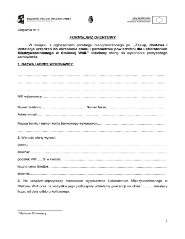 Załącznik nr 1 FORMULARZ OFERTOWY W związku z ogłoszeniem przetargu nieograniczonego pn. „Zakup, dostawa i instalacja urządzeń do określania stanu i parametrów powierzchni dla Laboratorium Międzyuczelnianego w Stalowej Woli.” składamy ofertę na wykonanie powyższego zamówienia. 1. NAZWA I ADRES WYKONAWCY: ... ... NIP wykonawcy: . . Numer telefonu:.............................................. Numer faksu............................................................. Adres e-mail: . .. Nazwa banku i numer konta bankowego wykonawcy: .. 2. Wartość oferty wynosi: (netto)................................................................................................................................................... słownie: ............................................................................................................................................... podatek VAT .....% w kwocie: ......................................................................................................... łączna cena (brutto): ........................................................................................................................... słownie: ........................................................................................................................................... 3. Na urządzenia/przyrządy stanowiące wyposażenie Laboratorium Międzyuczelnianego w Stalowej Woli oraz na wszystkie jego podzespoły udzielamy gwarancji na okres1.............miesięcy licząc od daty odbioru końcowego. 1 Minimum 12 miesięcy. 1 4. Oferowana powyżej cena brutto zawiera koszty transportu, załadunku i rozładunku oraz instalacji i uruchomienia u Zamawiającego. Powyższa cena zawiera koszty związane z dostarczeniem wszystkich elementów wymienionych w Specyfikacji Technicznej. 5. Oświadczam/y, że oferowane urządzenie oraz wszystkie podzespoły wyposażenia Laboratorium Międzyuczelnianego w Stalowej Woli spełnia wszystkie minimalne wymagania zdefiniowane w Specyfikacji Technicznej. 6. Oświadczam/y, że serwis będzie realizowany przez producenta lub autoryzowanego partnera serwisowego producenta. 7. Oświadczam/y, że zapoznałem/zapoznaliśmy się ze Specyfikacją Istotnych Warunków Zamówienia, Specyfikacją Techniczną i nie wnoszę/wnosimy żadnych zastrzeżeń oraz uzyskałem/uzyskaliśmy informacje niezbędne do przygotowania oferty. 8. Oświadczam/y, że załączone do SIWZ wymagania stawiane Dostawcy oraz postanowienia umowy zostały przez nas zaakceptowane bez zastrzeżeń i zobowiązujemy się, w przypadku wyboru naszej oferty, do zawarcia umowy w miejscu i terminie wyznaczonym przez zamawiającego. 9. Zobowiązujemy się zabezpieczyć we własnym zakresie materiał do prób odbiorowych, a także do przeprowadzenia odpowiednich prób odbiorowych na oferowanych urządzeniach. 10. Uważam/y się za związanego/związanych niniejszą ofertą na okres 60 dni od terminu składania ofert. 11. Przedmiot zamówienia zamierzam/y wykonać 1) sami, 2) przy pomocy podwykonawcy/ów w zakresie2 .. .............................................................................................................................. 12. Spełniam/y warunki określone w art. 22 ust. 1 ustawy z dnia 29.01.2004 – Prawo zamówień publicznych oraz w otrzymanej od zamawiającego specyfikacji istotnych warunków zamówienia. 13. Nie podlegam/y wykluczeniu z ubiegania się o udzielenie zamówienia publicznego na podstawie art. 24 ust.1 ustawy z dnia 29.01.2004 - Prawo zamówień publicznych. 14. Oświadczam/y, że akceptujemy projekt umowy stanowiący załącznik do specyfikacji i zobowiązuje/my się w przypadku wybrania mojej/naszej oferty do jej zawarcia; 15. Ofertę składam/y na kolejno ponumerowanych stronach .................. (liczba stron); 16. Zwrotu wadium wniesionego w pieniądzu prosimy dokonać na rachunek: 2 ...... Należy określić zakres zamówienia planowany do realizacji przez podwykonawców. 2 . PODSTAWOWE WYMAGANIA TECHNICZNE 1.2.1. ZESTAW URZĄDZEŃ DO POMIARÓW PARAMETRÓW POWIERZCHNI. Lp. Nazwa parametru Wielkość parametru Wielkość parametru oferowanego urządzenia1 Chropowatościomierz przenośny 1. 2. 3. 4. 5. 6. 7. 8. 9. Klasa dokładności wg DIN 4772 Zakres pomiarowy zgrubny Zakres pomiarowy dokładny Dokładność pomiaru przy zakresie zgrubnym Dokładność pomiaru przy zakresie dokładnym Długość odcinków elementarnych Długość przesuwu czujnika pomiarowego Pamięć urządzenia Możliwość opracowywania danych statystycznie 10. Mierzone parametry 11. 16. Ostrze odwzorowujące Możliwość pomiaru przy głowicy ustawionej prostopadle do kierunku ruchu jednostki napędowej Możliwość pomiarów w pionie i „do góry nogami” Możliwość tworzenia programów pomiarowych Drukarka wbudowana w urządzenie Zasilanie 17. Walizka transportowa 12. 13. 14. 15. 1 min. ± 320 µm min. ± 80 µm 0,04 µm lub lepsza 0,01 µm lub lepsza 0,08; 0,25; 0,8; 2,5; 8,0 mm zgodna z EN ISO 4288 i EN ISO 1205 min. 999 pomiarów TAK wg EN ISO 4287; JIS B 0601; EN ISO 13565 diamentowe TAK TAK TAK TAK bateryjne i sieciowe TAK 1 Dostawca ma obowiązek wypełnić wszystkie pola kolumny. Brak spełnienia któregokolwiek z wymaganych parametrów lub brak wpisu informującego o oferowanych parametrach powoduje odrzucenie oferty. 3 Lp. Nazwa parametru Wielkość parametru Wielkość parametru oferowanego urządzenia1 Stacjonarne urządzenie do pomiarów parametrów powierzchni – profilometr 18. Podstawa urządzenia 19. Kolumna pomiarowa 20. Jednostka napędu głowicy pomiarowej 21. Głowica pomiarowa 22. Stolik pomiarowy płyta granitowa, wymiary min. 780×500 mm, rowki teowe mocowana do podstawy, ruchy zautomatyzowane i zmotoryzowane; przesuw na wysokość co najmniej 400mm; funkcja auto stop oraz ochrona kolizyjna • mocowana do kolumny za pośrednictwem uchwytu obrotowego, możliwość obrotu co najmniej ±45°; • długość przesuwu min. 120 mm, • prędko