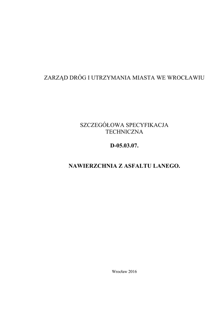 ZARZĄD DRÓG I UTRZYMANIA MIASTA WE WROCŁAWIU SZCZEGÓŁOWA SPECYFIKACJA TECHNICZNA D-05.03.07. NAWIERZCHNIA Z ASFALTU LANEGO. Wrocław 2016 SST D-05.03.07. Spis treści: 1. WSTĘP. 1.1. Przedmiot SST. 1.2. Zakres stosowania SST. 1.3. Zakres robót objętych SST. 1.4. Określenia podstawowe. 1.4.1. Asfalt lany. 1.5. Ogólne wymagania dotyczące robót. 2. MATERIAŁY. 2.1. Warunki ogólne stosowania materiałów. 2.2. Kruszywa. 2.2.1. Kruszywo łamane - grysy 2.2.2. Kruszywo łamane - piasek łamany i kruszywo drobne granul. 2.2.3. Kruszywo naturalne. 2.2.4. Wypełniacz. 2.2.5. Asfalt. 3. SPRZĘT. 3.1. Sprzęt do produkcji i transportu asfaltu lanego. 3.1.1. Kotły produkcyjno-tansportowe. 3.2. Sprzęt do wbudowania. 3.2.1. Sprzęt do wbudowywania ręcznego. 4. TRANSPORT. 4.1. Transport mieszanki asfaltu lanego. 5. WYKONANIE ROBÓT. 5.1. Ogólne warunki wykonania robót. 5.2. Projektowanie składu asfaltu lanego. 5.2.1. Recepta laboratoryjna. 5.2.2. Wymagania dla mieszanki asfaltu lanego. 5.3. Warunki prowadzenia produkcji. -2- SST D-05.03.07. 5.3.1. Dozowanie składników mieszanki do kotła. 5.3.2. Temperatura wytwarzania. 5.3.3. Dopuszczalne tolerancje. 5.4. Wbudowanie mieszanki asfaltu lanego. 5.4.1. Przygotowanie podłoŜa. 5.4.2. Warunki atmosferyczne. 5.4.3. Ręczne wbudowanie mieszanki. 5.4.4. Wykonanie złączy. 5.5. Wymagania dla ułoŜonej warstwy nawierzchni.. 6. KONTROLA JAKOŚCI ROBÓT. 6.1. Zakres badań. 6.2. Częstotliwość badań. 7. OBMIAR ROBÓT. 8. ODBIÓR ROBOT. 9. PODSTAWA PŁATNOŚCI. 10. PRZEPISY ZWIĄZANE. -3- SST D-05.03.07. -4- 1. Wstęp. 1.1. Przedmiot SST. Przedmiotem niniejszej szczegółowej specyfikacji technicznej są wymagania dotyczące wykonania i odbioru robót związanych z wykonaniem nawierzchni z asfaltu lanego 1.2. Zakres stosowania SST. Szczegółowa specyfikacja techniczna jest stosowana jako dokument przetargowy i kontraktowy przy zlecaniu i realizacji robót wymienionych w pkt. 1.1. 1.3. Zakres robót objętych SST. Ustalenia zawarte w niniejszej specyfikacji dotyczą prowadzenia robót przy wykonywaniu nawierzchni z asfaltu lanego. 1.4. Określenia podstawowe. Zgodnie z obowiązującymi normami i SST D-M-00.00.00. "Wymagania ogólne". 1.4.1. Asfalt lany - wbudowana mieszanka mineralno-asfaltowa o duŜej zawartości wypełniacza, wytworzona w otaczarce lub kotle transportowo-produkcyjnym, nie wymagająca zagęszczenia w czasie wbudowywania 1.4.2. Chodnik z asfaltu lanego – wydzielona powierzchnia przeznaczona do ruchu pieszego, wykonana z asfaltu lanego ułoŜonego na odpowiedniej podbudowie. 1.5. Ogólne wymagania dotyczące robót. Wykonawca robót jest odpowiedzialny za jakość ich wykonywania oraz za zgodność z dokumentacją projektową, SST i poleceniami Kierownika Projektu. Ogólne wymagania dotyczące robót podano w SST D-M-00.00.00 "Wymagania ogólne". 2. Materiały. 2.1. Warunki ogólne stosowania materiałów. Warunki ogólne stosowania materiałów podano w SST D-M-00.00.00 "Wymagania ogólne". 2.2. Kruszywa. Do produkcji asfaltu lanego stosuje się kruszywo łamane i naturalne. Stosowane kruszywa muszą spełniać wymagania zawarte w niniejszej SST. 2.2.1. Kruszywo łamane – grysy kl. I lub II gat. 1 i 2. Grysy klasy II tylko pod względem ścieralności w bębnie kulowym. Pozostałe cechy grysów jak dla kl. I gat. 1 i 2. SST D-05.03.07. -5- Cechy kruszywa wg. PN-B-11112. Wymagania podstawowe podano w Tablicach 1 i 2 SST. 2.2.2. Kruszywa łamane - piasek łamany i kruszywo drobne granulowane. Cechy kruszywa wg. PN-B-11112. Wymagania przedstawia Tablica 3. 2.2.3. Kruszywo naturalne. NaleŜy stosować piasek naturalny wg. PN-B-11113. Wymagania dla piasku podano w Tablicy 4. 2.2.4. Wypełniacz. NaleŜy stosować wypełniacz podstawowy wg. PN-S-96504. Wymagania podano w Tablicy 5. 2.2.5. Asfalt. Do mieszanki asfaltu lanego naleŜy stosować asfalt drogowy D20/30 lub D35/50 , o właściwościach podanych w Tablicy 6. Niniejsza SST uwzględnia tylko lepiszcza produkowane i dostępne w kraju. Zastosowanie innych asfaltów moŜe mieć miejsce pod warunkiem spełnienia wymagań normy PN-EN 12591: 2002 (U) lub po uprzednim uzyskaniu dla danego produktu świadectwa dopuszczenia do stosowania w budownictwie drogowym wydane przez IBDiM. 3. Sprzęt. 3.1. Sprzęt do produkcji i transportu mieszanek asfaltu lanego. 3.1.1. Kotły produkcyjno-transportowe. Kotły tego typu słuŜą zarówno do produkcji asfaltu lanego jak i do dostarczenia go na miejsce wbudowania. Kocioł musi być wyposaŜony w sprawny termometr do kontrolowania temperatury procesu produkcji. 3.1.2. Otaczarki wyposaŜone dodatkowo w suszarkę do podgrzewania wypełniacza. 3.2. Sprzęt do wbudowania mieszanki asfaltu lanego. 3.2.1. Sprzęt do wbudowania ręcznego. Wymagany jest następujący sprzęt: - taczki stalowe do przewozu mieszanki asfaltu lanego - gładziki drewniane do rozkładania mieszanki asfaltu lanego - Ŝelazka Ŝeliwne do prasowania złączeń SST D-05.03.07. -6- - listwy drewniane lub stalowe do formowania warstwy bitumicznej - szczotki i łopaty - nakolanniki dla robotników układających mieszankę 4. Transport. Warunki ogólne transportu podano w SST D-M-00.00.00. "Wymagania ogólne". 4.1. Transport mieszanki asfaltu lanego. W przypadku ręcznego wbudowania mieszanki asfaltu lanego uzasadnionym jest dostarczenie mieszanki do miejsca wbudowania w kotle produkcyjno-transportowym. W czasie transportu mieszanki asfaltu lanego, naleŜy utrzymywać temperaturę jej produkcji, która jest jednocześnie temperaturą wbudowania w nawierzchnię. 5. Wykonanie robót. 5.1. Ogólne warunki wykonania robót. Ogólne warunki wykonania robót podano w SST D-M-00.00.00. 5.2. Projektowanie składu mieszanki asfaltu lanego. 5.2.1. Receptura laboratoryjna. Za wykonanie recept odpowiedzialny jest Wykonawca, który przedstawia je Kierownikowi Projektu do zatwierdzenia. Receptury powinny być opracowane dla konkretnych materiałów, zaakceptowanych przez Kierownika Projek