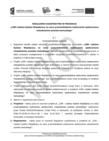 POWIAT KARTUSKI POWIATOWY URZĄD PRACY W KARTUZACH REGULAMIN UCZESTNICTWA W PROJEKCIE „LSW-Lokalny System Współpracy na rzecz przeciwdziałania wykluczeniu społecznemu mieszkańców powiatu kartuskiego” § 1. POSTANOWIENIA OGÓLNE 1. Regulamin określa zasady rekrutacji Uczestników/Uczestniczek do projektu „LSW- Lokalny System Współpracy na rzecz przeciwdziałania wykluczeniu społecznemu mieszkańców powiatu kartuskiego” warunki uczestnictwa w szkoleniach tematycznych, a także procedury postępowania w przypadku rezygnacji Uczestnika/Uczestniczki z udziału w projekcie w trakcie jego trwania. 2. Projekt „LSW- Lokalny System Współpracy na rzecz przeciwdziałania wykluczeniu społecznemu mieszkańców powiatu kartuskiego” jest realizowany w ramach Programu Operacyjnego Kapitał Ludzki, Priorytet VII Promocja integracji społecznej, Działanie 7.3 Inicjatywy lokalne na rzecz aktywnej integracji. 3. Projekt „LSW- Lokalny System Współpracy na rzecz przeciwdziałania wykluczeniu społecznemu mieszkańców powiatu kartuskiego” jest współfinansowany przez Unię Europejską ze środków Europejskiego Funduszu Społecznego. 4. Projekt realizowany jest przez Powiat Kartuski/Powiatowy Urząd Pracy w Kartuzach, który odpowiada za realizację wszystkich działań podejmowanych w projekcie „LSW- Lokalny System Współpracy na rzecz przeciwdziałania wykluczeniu społecznemu mieszkańców powiatu kartuskiego”. 5. Ilekroć w regulaminie jest mowa o: a) Projekcie - należy przez to rozumieć projekt pt. „LSW - Lokalny System Współpracy na rzecz przeciwdziałania wykluczeniu społecznemu mieszkańców powiatu kartuskiego” realizowany przez Powiat Kartuski/Powiatowy Urząd Pracy w Kartuzach, na podstawie umowy nr UDAPOKL.07.03.00-22-101/11-00 z dnia 31.01.2012 r. zawartej pomiędzy Województwem Pomorskim a Powiatem Kartuskim. b) Regulaminie - należy przez to rozumieć Regulamin uczestnictwa w projekcie pt. „LSW Lokalny System Współpracy na rzecz przeciwdziałania wykluczeniu społecznemu mieszkańców powiatu kartuskiego”. Projekt jest współfinansowany przez Unię Europejską ze środków Europejskiego Funduszu Społecznego. POWIAT KARTUSKI POWIATOWY URZĄD PRACY W KARTUZACH c) Uczestniku/Uczestniczce – należy przez to rozumieć osobę bezpośrednio korzystającą z udzielanego w ramach Projektu wsparcia. d) PUP - należy przez to rozumieć Powiatowy Urząd Pracy w Kartuzach (z siedzibą: ul. Mściwoja II 4, 83-300 Kartuzy). e) PCPR – należy przez to rozumieć Powiatowe Centrum Pomocy Rodzinie w Kartuzach. f) CIS należy przez to rozumieć Centrum Integracji Społecznej w Garczu i w Ostrzycach. g) GOPS – Gminny Ośrodek Pomocy Społecznej w: Chmielnie, Kartuzach, Przodkowie, Sierakowicach, Somoninie, Stężycy, Sulęczynie, Żukowie. 6. Projekt obejmuje swym zasięgiem teren powiatu kartuskiego. 7. Projekt realizowany jest w okresie od 01.02.2012 r. do 30.09.2012 r. 8. Głównym celem projektu jest usprawnienie, do końca IX 2012 r. sposobu współpracy lokalnych instytucji działających w powiecie kartuskim na rzecz przeciwdziałania wykluczenia społecznemu mieszkańców terenów wiejskich. 9. Celami szczegółowymi Projektu są: a) Umożliwienie do końca IX 2012 roku wymiany doświadczeń 20 pracownikom (18 kobietom i 2 mężczyznom) PUP, CIS, GOPS, PCPR. b) Nabycie, do końca IX 2012 r. wiedzy przez 20 pracowników PUP, CIS, GOPS, PCPR (18 kobiet i 2 mężczyzn) z zakresu tworzenia lokalnego systemu współpracy oraz pracy z trudnym klientem. c) Rozwój, do końca IX 2012 r. usług i metod wsparcia indywidualnego na rzecz osób wykluczonych społecznie zamieszkałych na terenie powiatu kartuskiego. 10. Udział Uczestników/Uczestniczek w Projekcie jest bezpłatny. § 2. UCZESTNICY/UCZESTNICZKI PROJEKTU Projekt skierowany jest do pracowników (18 kobiet i 2 mężczyzn) instytucji z terenu powiatu kartuskiego przeciwdziałających wykluczeniu społecznemu mieszkańców terenów wiejskich powiatu, w tym: Powiatowego Urzędu Pracy w Kartuzach; Powiatowego Centrum Pomocy Rodzinie w Kartuzach; Centrum Integracji Społecznej w Garczu i w Ostrzycach; Gminnego Ośrodka Pomocy Społecznej w: Chmielnie, Sierakowicach, Somoninie, Stężycy, Sulęczynie, Żukowie. Kartuzach, Projekt jest współfinansowany przez Unię Europejską ze środków Europejskiego Funduszu Społecznego. Przodkowie, POWIAT KARTUSKI POWIATOWY URZĄD PRACY W KARTUZACH § 2. ZASADY REKRUTACJI 1. Rekrutacja prowadzona będzie w okresie od 01.03.2012 r. do 30.04.2012 r. 2. W trakcie procesu rekrutacji wyłonionych zostanie 20 pracowników instytucji biorących udział w projekcie. Na listę rezerwową zostanie wpisanych 5 osób. 3. Lista rezerwowa utworzona zostanie spośród osób, które wypełnią Kwestionariusz zgłoszeniowy i będą kwalifikowały się do udziału w projekcie, zgodnie z kolejnością zgłoszeń. 4. Osoby z listy rezerwowej zostaną zaproszone do udziału w Projekcie w przypadku rezygnacji lub niestawiennictwa osoby wcześniej zakwalifikowanej. 5. Osoby z listy rezerwowej otrzymają wsparcie niewykorzystane przez osobę, którą zastępują. 6. Rekrutacja do Projektu nastąpi kilkuetapowo: a) Etap I: Wystosowanie pism do GOPS, CIS, PCPR informujących o Projekcie i prowadzonej rekrutacji. W przypadku pracowników PUP zorganizowane zostanie spotkanie z Kierownikami Działów, którzy przedstawią propozycje Kandydatów/Kandydatek do projektu. b) Etap II: Udostępnienie kwestionariusza zgłoszeniowego i Regulaminu uczestnictwa w projekcie w siedzibie i na stronie internetowej PUP. c) Etap III: Spotkanie rekrutacyjne w siedzibie PUP. Na spotkanie zaproszeni zostaną pracownicy, którzy: dostarczą do PUP wypełniony Kwestionariusz zgłoszeniowy (w terminie określonym w pkt 7 niniejszego paragrafu), w swojej pracy zawodowej bezpośrednio oddziałują na sytuację osób dotkniętych zjawiskiem wykluczenia społecznego i po wstępnej ocenie złożonego Kwestionariusza z