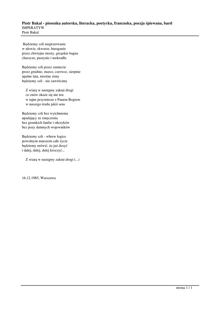 Piotr Bakal - piosenka autorska, literacka, poetycka, francuska, poezja śpiewana, bard IMPERATYW Piotr Bakal Będziemy szli nieprzerwanie w ulewie, skwarze, huraganie przez chwiejne mosty, grząskie bagna chaszcze, pustynie i mokradła Będziemy szli przez zamiecie przez grudnie, marce, czerwce, sierpnie upalne lata, mroźne zimy będziemy szli - nie zawrócimy Z wiarą w następny zakręt drogi co znów okaże się nie ten w tajne przymierze z Panem Bogiem w naszego trudu jakiś sens Będziemy szli bez wytchnienia upadający ze zmęczenia bez gromkich fanfar i okrzyków bez pozy dumnych wojowników Będziemy szli - wbrew logice powolnym marszem całe życie będziemy mówić, że już dosyć i dalej, dalej, dalej kroczyć... Z wiarą w następny zakręt drogi (...) 16.12.1985, Warszawa strona 1 / 1