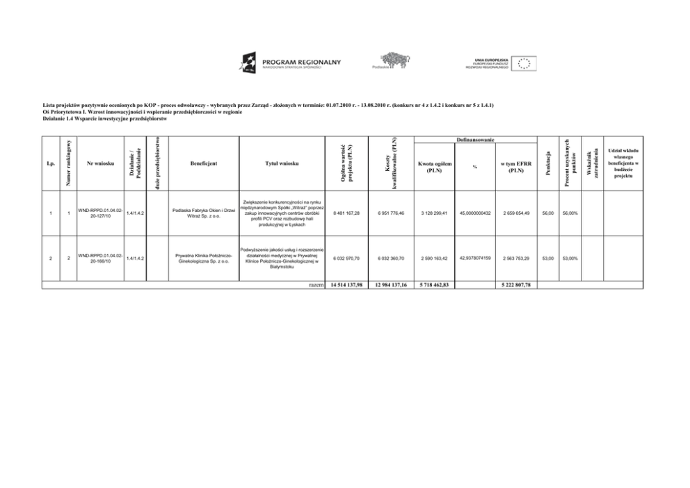 Zwiększenie konkurencyjności na rynku międzynarodowym Spółki „Witraż” poprzez zakup innowacyjnych centrów obróbki profili PCV oraz rozbudowę hali produkcyjnej w Łyskach WND-RPPD.01.04.021.4/1.4.2 20-166/10 Prywatna Klinika PołożniczoGinekologiczna Sp. z o.o. Podwyższenie jakości usług i rozszerzenie działalności medycznej w Prywatnej Klinice Położniczo-Ginekologicznej w Białymstoku razem w tym EFRR (PLN) 8 481 167,28 6 951 776,46 3 128 299,41 45,0000000432 2 659 054,49 56,00 56,00% 6 032 970,70 6 032 360,70 2 590 163,42 42,9378074159 2 563 753,29 53,00 53,00% 14 514 137,98 12 984 137,16 5 718 462,83 Dofinansowanie 5 222 807,78 Wskaźnik zatrudnienia Podlaska Fabryka Okien i Drzwi Witraż Sp. z o.o. % Procent uzyskanych punktów WND-RPPD.01.04.021.4/1.4.2 20-127/10 Kwota ogółem (PLN) Punktacja 2 Tytuł wniosku Koszty kwalifikowalne (PLN) 2 Beneficjent Nr wniosku Ogólna wartość projektu (PLN) 1 duże przedsiębiorstwo 1 Działanie / Poddziałanie Lp. Numer rankingowy Lista projektów pozytywnie ocenionych po KOP - proces odwoławczy - wybranych przez Zarząd - złożonych w terminie: 01.07.2010 r. - 13.08.2010 r. (konkurs nr 4 z 1.4.2 i konkurs nr 5 z 1.4.1) Oś Priorytetowa I. Wzrost innowacyjności i wspieranie przedsiębiorczości w regionie Działanie 1.4 Wsparcie inwestycyjne przedsiębiorstw Udział wkładu własnego beneficjenta w budżecie projektu