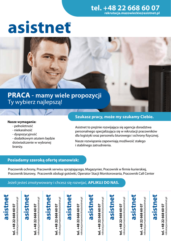tel. +48 22 668 60 07 [email protected] Szukasz pracy, może my szukamy Ciebie. Nasze wymagania: - pełnoletność - niekaralność - dyspozycyjność - dodatkowym atutem będzie doświadczenie w wybranej branży. Asistnet to prężnie rozwijająca się agencja doradztwa personalnego specjalizująca się w rekrutacji pracowników dla logistyki oraz personelu biurowego i ochrony fizycznej. Nasze rozwiązania zapewniają możliwość stałego i stabilnego zatrudnienia. Posiadamy szeroką ofertę stanowisk: Pracownik ochrony, Pracownik serwisu sprzątającego, Magazynier, Pracownik w firmie kurierskiej, Pracownik biurowy, Pracownik obsługi gotówki, Operator Stacji Monitorowania, Pracownik Call Center [email protected] tel. +48 22 668 60 07 [email protected] tel. +48 22 668 60 07 [email protected] tel. +48 22 668 60 07 [email protected] tel. +48 22 668 60 07 [email protected] tel. +48 22 668 60 07 [email protected] tel. +48 22 668 60 07 [email protected] tel. +48 22 668 60 07 tel. +48 22 668 60 07 [email protected] Jeżeli jesteś zmotywowany i chcesz się rozwijać, APLIKUJ DO NAS.