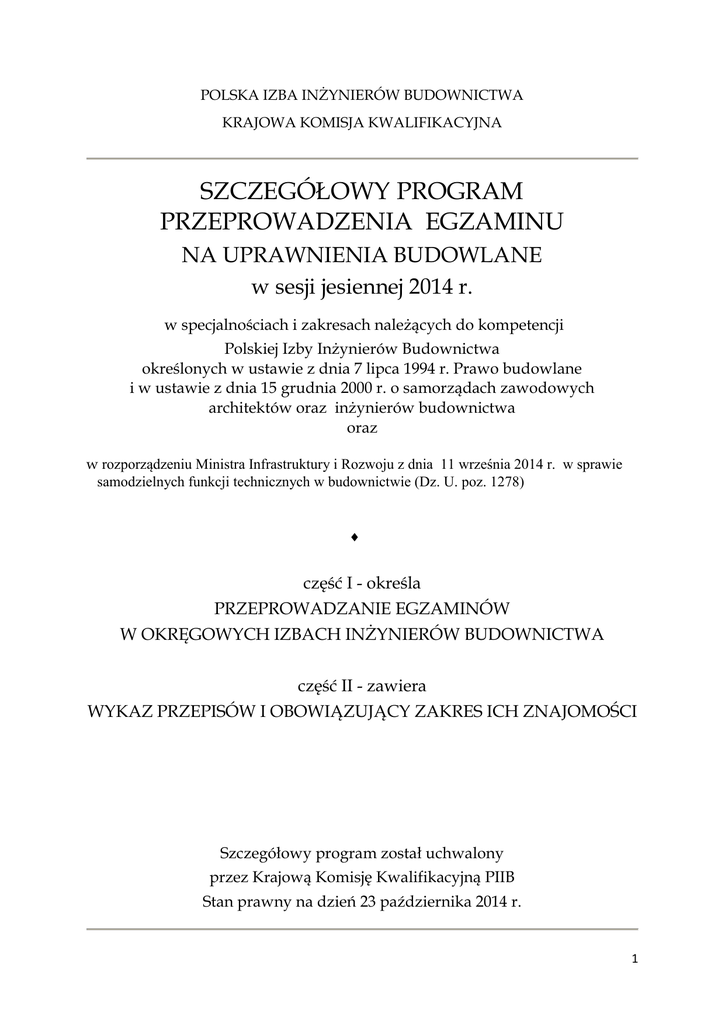 POLSKA IZBA INŻYNIERÓW BUDOWNICTWA KRAJOWA KOMISJA KWALIFIKACYJNA SZCZEGÓŁOWY PROGRAM PRZEPROWADZENIA EGZAMINU NA UPRAWNIENIA BUDOWLANE w sesji jesiennej 2014 r. w specjalnościach i zakresach należących do kompetencji Polskiej Izby Inżynierów Budownictwa określonych w ustawie z dnia 7 lipca 1994 r. Prawo budowlane i w ustawie z dnia 15 grudnia 2000 r. o samorządach zawodowych architektów oraz inżynierów budownictwa oraz w rozporządzeniu Ministra Infrastruktury i Rozwoju z dnia 11 września 2014 r. w sprawie samodzielnych funkcji technicznych w budownictwie (Dz. U. poz. 1278) część I - określa PRZEPROWADZANIE EGZAMINÓW W OKRĘGOWYCH IZBACH INŻYNIERÓW BUDOWNICTWA część II - zawiera WYKAZ PRZEPISÓW I OBOWIĄZUJĄCY ZAKRES ICH ZNAJOMOŚCI Szczegółowy program został uchwalony przez Krajową Komisję Kwalifikacyjną PIIB Stan prawny na dzień 23 października 2014 r. 1 PROGRAM UWZGLĘDNIA ZASADY PRZEPROWADZANIA EGZAMINÓW OKREŚLONE W ROZPORZĄDZENIU MINISTRA INFRASTRUKTURY I ROZWOJU Z DNIA 11 WRZEŚNIA 2014 R. W SPRAWIE SAMODZIELNYCH FUNKCJI TECHNICZNYCH W BUDOWNICTWIE (DZ. U. POZ. 1278) EGZAMINY WG NINIEJSZEGO PROGRAMU PRZEPROWADZAJĄ OKRĘGOWE KOMISJE KWALIFIKACYJNE WŁAŚCIWYCH OKRĘGOWYCH IZB INŻYNIERÓW BUDOWNICTWA. SZCZEGÓŁOWY PROGRAM EGZAMINÓW NA UPRAWNIENIA BUDOWLANE SKŁADA SIĘ Z DWÓCH CZĘŚCI: I – PRZEPROWADZANIE EGZAMINÓW W OKRĘGOWYCH IZBACH INŻYNIERÓW BUDOWNICTWA II – WYKAZ PRZEPISÓW I OBOWIĄZUJĄCY ZAKRES ICH ZNAJOMOŚCI. KRAJOWA KOMISJA KWALIFIKACYJNA POLSKIEJ IZBY INŻYNIERÓW BUDOWNICTWA UPOWAŻNIONA JEST DO BIEŻĄCEJ AKTUALIZACJI ORAZ UZUPEŁNIANIA WYKAZU PRZEPISÓW, STANOWIĄCEGO II CZĘŚĆ NINIEJSZEGO „SZCZEGÓŁOWEGO PROGRAMU", O NOWE AKTY PRAWNE ZWIĄZANE Z PROCESEM BUDOWLANYM, JAK RÓWNIEŻ DO WYCOFANIA Z WYKAZU PRZEPISÓW TYCH AKTÓW PRAWNYCH, KTÓRE UTRACIŁY MOC PRAWNĄ ORAZ OKREŚLENIA ZAKRESU OBOWIĄZKOWEJ ICH ZNAJOMOŚCI. KRAJOWA KOMISJA KWALIFIKACYJNA POLSKIEJ IZBY INŻYNIERÓW BUDOWNICTWA UPOWAŻNIONA JEST DO USTALANIA WYKAZU POLSKICH NORM, KTÓRYCH ZNAJOMOŚĆ OBOWIĄZUJE ZDAJĄCYCH EGZAMIN. 2 SZCZEGÓŁOWY PROGRAM EGZAMINÓW CZĘŚĆ I PRZEPROWADZANIE EGZAMINÓW NA UPRAWNIENIA BUDOWLANE W OKRĘGOWYCH IZBACH INŻYNIERÓW BUDOWNICTWA Na podstawie: 1) ustawy z dnia 15 grudnia 2000 r. o samorządach zawodowych architektów oraz inżynierów budownictwa (Dz.U. z 2013 r., poz.932 z późn. zm.) 2) ustawy z dnia 7 lipca 1994 r. Prawo budowlane (Dz.U. z 2013 r., poz.1409 z późn. zm.) 3) rozporządzenia Ministra Infrastruktury i Rozwoju z dnia 11 września 2014 r. w sprawie samodzielnych funkcji technicznych w budownictwie (Dz.U. poz.1278) PRZEPROWADZANIE EGZAMINÓW NA UPRAWNIENIA BUDOWLANE 1. Zakres merytoryczny egzaminów. 1.1. Zgodnie z ustawą o samorządach zawodowych okręgowa izba inżynierów budownictwa nadaje uprawnienia budowlane w specjalnościach, o których mowa w art.14 ust.1 pkt 2-4 ustawy – Prawo budowlane. 1.2. Uprawnienia budowlane są udzielane w specjalnościach: 1.2.1. konstrukcyjno-budowlanej (art.14 ust.1 pkt 2), 1.2.2. inżynieryjnej mostowej (art.14 ust.1 pkt 3 lit a), 1.2.3. inżynieryjnej drogowej (art.14 ust.1 pkt 3 lit. b), 1.2.4. inżynieryjnej kolejowej (art.14 ust.1 pkt 3 lit. c), 1.2.5. inżynieryjnej hydrotechnicznej (art.14 ust.1 pkt 3 lit. d), 1.2.6. inżynieryjnej wyburzeniowej (art.14 ust.1 pkt 3 lit. e), 1.2.7. instalacyjnej w zakresie sieci, instalacji i urządzeń telekomunikacyjnych (art.14 ust.1 pkt 4 lit. a), 1.2.8. instalacyjnej w zakresie sieci, instalacji i urządzeń cieplnych, wentylacyjnych, gazowych, wodociągowych i kanalizacyjnych (art.14 ust.1 pkt 4 lit. b), 1.2.9. instalacyjnej w zakresie sieci, instalacji i urządzeń elektrycznych i elektroenergetycznych (art.14 ust.1 pkt 4 lit. c). 3 1.3. Postępowanie kwalifikacyjne oraz przeprowadzanie egzaminów w sprawach nadawania uprawnień budowlanych i wydawanie decyzji o nadaniu tych uprawnień należy do kompetencji okręgowych komisji kwalifikacyjnych, właściwych według miejsca zamieszkania osób ubiegających się o uprawnienia budowlane. 1.4. Prowadzenie postępowania odwoławczego i wydawanie decyzji w drugiej instancji w ww. sprawach należy do kompetencji Krajowej Komisji Kwalifikacyjnej Polskiej Izby Inżynierów Budownictwa. 2. Organizacja egzaminów. 2.1. Organizatorem egzaminów na uprawnienia budowlane są Okręgowe Komisje Kwalifikacyjne okręgowych izb inżynierów budownictwa, zwane dalej „Komisjami”. 2.2. Postępowanie o nadanie uprawnień budowlanych składa się z dwóch etapów: 1) postępowania kwalifikacyjnego, 2) egzaminu. 2.3. Postępowanie kwalifikacyjne i egzaminy przeprowadza Okręgowa Komisja Kwalifikacyjna w zespołach kwalifikacyjnych i w zespołach egzaminacyjnych. 2.4. Postępowanie kwalifikacyjne przeprowadzają 3-5 osobowe zespoły kwalifikacyjne, wyznaczane przez przewodniczącego Okręgowej Komisji Kwalifikacyjnej. 2.5. Egzaminy przeprowadzają 3-5 osobowe zespoły egzaminacyjne, wyznaczane przez przewodniczącego Okręgowej Komisji Kwalifikacyjnej. 2.6. W skład Zespołu Egzaminacyjnego wchodzą: – Przewodniczący Komisji lub jego Zastępca, – członkowie Zespołu, w tym co najmniej 1 osoba z uprawnieniami budowlanymi bez ograniczeń w specjalności odpowiedniej do specjalności, którą reprezentuje zdający. Funkcje: Przewodniczącego, zastępców przewodniczącego i członków zespołu egzaminacyjnego mogą pełnić osoby posiadające wyższe wykształcenie techniczne i uprawnienia budowlane bez ograniczeń oraz osoby z wykształceniem prawniczym. 3. Terminy egzaminów. 3.1. Egzaminy na uprawnienia budowlane przeprowadzane są co najmniej 2 razy w roku, w sesji wiosennej i jesiennej. 3.2. Terminy sesji egzaminacyjnych (egzaminów testowych) ustala Krajowa Komisja Kwalifikacyjna jako obowiązujące dla wszystkich Okręgowych Komisji Kwalifikacyjnych. Terminy egzaminów ustnych ustala Przewodniczący Okręgowej Komisji Kwalifikacyjnej. 3.3. Informacja o ustalonych termi