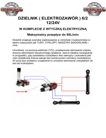 DZIELNIK ( ELEKTROZAWÓR ) 6/2 12/24V W KOMPLECIE Z WTYCZKĄ ELEKTRYCZNĄ Maksymalny przepływ do 90L/min Dzielnik znajduje szerokie zastosowanie w rolnictwie i budownictwie w takich maszynach jak TURY, CYKLOPY, MASZYNY BUDOWLANE i inne. Umożliwia, za pomocą elektryki (12V), przełączanie sterowania między dwoma siłownikami dwustronnego działania. Jest to idealne rozwiązanie w przypadku, gdy posiadamy rozdzielacz dwu sekcyjny i potrzebna jest nam dodatkowa trzecia sekcja bez konieczności wymiany rozdzielacza. W turze bez problemu urządzenie to umożliwi sterowanie chwytakiem do bel lub krokodylem.