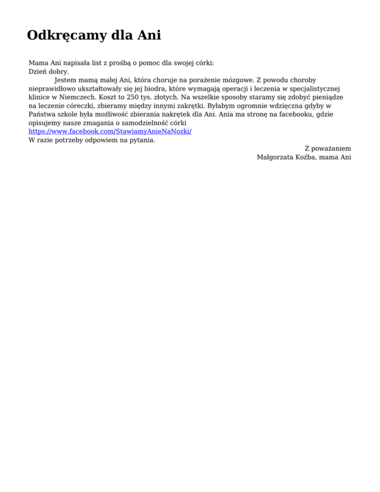 Odkręcamy dla Ani Mama Ani napisała list z prośbą o pomoc dla swojej córki: Dzień dobry. Jestem mamą małej Ani, która choruje na porażenie mózgowe. Z powodu choroby nieprawidłowo ukształtowały się jej biodra, które wymagają operacji i leczenia w specjalistycznej klinice w Niemczech. Koszt to 250 tys. złotych. Na wszelkie sposoby staramy się zdobyć pieniądze na leczenie córeczki, zbieramy między innymi zakrętki. Byłabym ogromnie wdzięczna gdyby w Państwa szkole była możliwość zbierania nakrętek dla Ani. Ania ma stronę na facebooku, gdzie opisujemy nasze zmagania o samodzielność córki https://www.facebook.com/StawiamyAnieNaNozki/ W razie potrzeby odpowiem na pytania. Z poważaniem Małgorzata Koźba, mama Ani