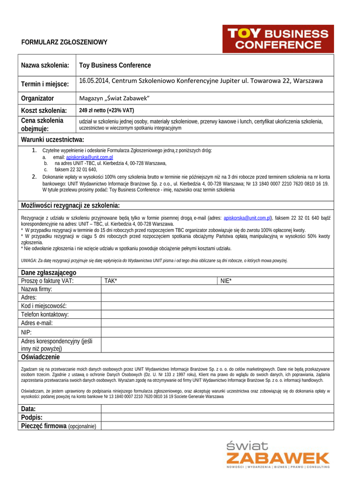 FORMULARZ ZGŁOSZENIOWY Nazwa szkolenia: Toy Business Conference Termin i miejsce: 16.05.2014, Centrum Szkoleniowo Konferencyjne Jupiter ul. Towarowa 22, Warszawa Organizator Magazyn „Świat Zabawek” Koszt szkolenia: Cena szkolenia obejmuje: 249 zł netto (+23% VAT) udział w szkoleniu jednej osoby, materiały szkoleniowe, przerwy kawowe i lunch, certyfikat ukończenia szkolenia, uczestnictwo w wieczornym spotkaniu integracyjnym Warunki uczestnictwa: 1. Czytelne wypełnienie i odesłanie Formularza Zgłoszeniowego jedną z poniższych dróg: 2. a. email: [email protected] b. na adres UNIT -TBC, ul. Kierbedzia 4, 00-728 Warszawa, c. faksem 22 32 01 640, Dokonanie wpłaty w wysokości 100% ceny szkolenia brutto w terminie nie późniejszym niż na 3 dni robocze przed terminem szkolenia na nr konta bankowego: UNIT Wydawnictwo Informacje Branżowe Sp. z o.o., ul. Kierbedzia 4, 00-728 Warszawa; Nr 13 1840 0007 2210 7620 0810 16 19. W tytule przelewu prosimy podać: Toy Business Conference - imię, nazwisko oraz termin szkolenia Możliwości rezygnacji ze szkolenia: Rezygnacje z udziału w szkoleniu przyjmowane będą tylko w formie pisemnej drogą e-mail (adres: [email protected]), faksem 22 32 01 640 bądź korespondencyjnie na adres: UNIT – TBC, ul. Kierbedzia 4, 00-728 Warszawa. * W przypadku rezygnacji w terminie do 15 dni roboczych przed rozpoczęciem TBC organizator zobowiązuje się do zwrotu 100% opłaconej kwoty. * W przypadku rezygnacji w ciągu 5 dni roboczych przed rozpoczęciem spotkania obciążymy Państwa opłatą manipulacyjną w wysokości 50% kwoty zgłoszenia. * Nie odwołanie zgłoszenia i nie wzięcie udziału w spotkaniu powoduje obciążenie pełnymi kosztami udziału. UWAGA: Za datę rezygnacji przyjmuje się datę wpłynięcia do Wydawnictwa UNIT pisma i od tego dnia obliczane są dni robocze, o których mowa powyżej. Dane zgłaszającego Proszę o fakturę VAT: Nazwa firmy: Adres: Kod i miejscowość: Telefon kontaktowy: Adres e-mail: NIP: Adres korespondencyjny (jeśli inny niż powyżej) TAK* NIE* Oświadczenie Zgadzam się na przetwarzanie moich danych osobowych przez UNIT Wydawnictwo Informacje Branżowe Sp. z o. o. do celów marketingowych. Dane nie będą przekazywane osobom trzecim. Zgodnie z ustawą o ochronie Danych Osobowych (Dz. U. Nr 133 z 1997 roku), Klient ma prawo do wglądu do swoich danych, ich poprawiania, żądania zaprzestania przetwarzania swoich danych osobowych. Wyrażam zgodę na otrzymywanie od firmy UNIT Wydawnictwo Informacje Branżowe Sp. z o. o. informacji handlowych. Oświadczam, że jestem uprawniony do podpisania niniejszego formularza zgłoszeniowego, oraz akceptuję warunki uczestnictwa oraz zobowiązuję się do dokonania opłaty w wysokości: podanej powyżej na konto bankowe Nr 13 1840 0007 2210 7620 0810 16 19 Societe Generale Warszawa Data: Podpis: Pieczęć firmowa (opcjonalnie)