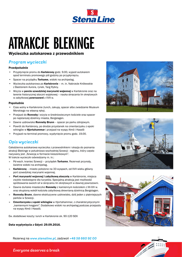 ATRAKCJE BLEKINGE Wycieczka autokarowa z przewodnikiem Program wycieczki Przedpołudnie • Przypłynięcie promu do Karlskrony godz. 9.00, wyjazd autokarem spod terminalu promowego pół godziny po przypłynięciu. • Spacer na przylądku Torhamn, widoki na archipelag. • Wycieczka autokarowa po Karlskronie – m. in. Nabrzeże Królewskie z Bastionem Aurora, rynek, Targ Rybny. • Wizyta w porcie szwedzkiej marynarki wojennej w Karlskronie oraz na terenie historycznej stoczni wojskowej – nauka skręcania lin okrętowych w zabytkowej powrozowni z XVII w. Popołudnie • Czas wolny w Karlskronie (lunch, zakupy, spacer albo zwiedzanie Muzeum Morskiego na własną rękę). • Przejazd do Ronneby i wizyta w średniowiecznym kościele oraz spacer po najstarszej dzielnicy miasta, Bergslagen. • Dawne uzdrowisko Ronneby Brunn – spacer po parku zdrojowym. • Powrót do Karlskrony, po drodze przystanek na cmentarzysku z epoki wikingów w Hjortahammar i przejazd na wyspy Almö i Hasslö • Przyjazd na terminal promowy, wypłynięcie promu godz. 19.00. Opis wycieczki Całodzienna autokarowa wycieczka z przewodnikiem i okazja do poznania atrakcji Blekinge w południowo-wschodniej Szwecji - regionu, który często nazywany jest „Szwecją w formacie kieszonkowym”. W trakcie wycieczki odwiedzamy m. in.: »» Pd-wsch. kraniec Szwecji – przylądek Torhamn. Rezerwat przyrody, świetne widoki na archipelag. »» Karlskronę – miasto położone na 33 wyspach, od XVII wieku główny port szwedzkiej marynarki wojennej. »» Port marynarki wojennej i zabytkową stocznię w Karlskronie, miejsca zwykle niedostępne dla turystów. Specjalną atrakcją jest możliwość spróbowania swoich sił w skręcaniu lin okrętowych w dawnej powrozowni. »» Dawne duńskie miasteczko Ronneby z kamiennym kościołem z XII-XIV w. oraz skupioną wokół kościoła zabytkową drewnianą dzielnicą Bergslagen. »» Ronneby Brunn, dawne ekskluzywne uzdrowisko, dziś jeden z piękniejszych parków w Szwecji. »» Cmentarzysko z epoki wikingów w Hjortahammar, z charakterystycznymi „kamiennymi kręgami”. Dodatkowo widoki na archipelag podczas przejazdu na wyspy Almö i Hasslö. Ew. dodatkowe koszty: lunch w Karlskronie ok. 90-120 SEK Data wypłynięcia z Gdyni: 29.09.2016. Rezerwuj na www.stenaline.pl, zadzwoń +48 58 660 92 00 Everyone deserves a break 20