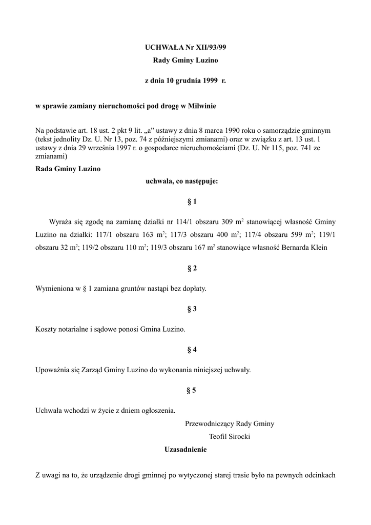 UCHWAŁA Nr XII/93/99 Rady Gminy Luzino z dnia 10 grudnia 1999 r. w sprawie zamiany nieruchomości pod drogę w Milwinie Na podstawie art. 18 ust. 2 pkt 9 lit. „a” ustawy z dnia 8 marca 1990 roku o samorządzie gminnym (tekst jednolity Dz. U. Nr 13, poz. 74 z późniejszymi zmianami) oraz w związku z art. 13 ust. 1 ustawy z dnia 29 września 1997 r. o gospodarce nieruchomościami (Dz. U. Nr 115, poz. 741 ze zmianami) Rada Gminy Luzino uchwala, co następuje: §1 WyraŜa się zgodę na zamianę działki nr 114/1 obszaru 309 m2 stanowiącej własność Gminy Luzino na działki: 117/1 obszaru 163 m2; 117/3 obszaru 400 m2; 117/4 obszaru 599 m2; 119/1 obszaru 32 m2; 119/2 obszaru 110 m2; 119/3 obszaru 167 m2 stanowiące własność Bernarda Klein §2 Wymieniona w § 1 zamiana gruntów nastąpi bez dopłaty. §3 Koszty notarialne i sądowe ponosi Gmina Luzino. §4 UpowaŜnia się Zarząd Gminy Luzino do wykonania niniejszej uchwały. §5 Uchwała wchodzi w Ŝycie z dniem ogłoszenia. Przewodniczący Rady Gminy Teofil Sirocki Uzasadnienie Z uwagi na to, Ŝe urządzenie drogi gminnej po wytyczonej starej trasie było na pewnych odcinkach niemoŜliwe, naleŜało ustalić nowe granice i dokonać zamiany z właścicielami działek, stanowiących nowe odcinki drogi.