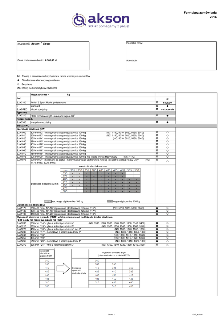 Formularz zamówienia 2016 Invacare® Action 5 Pieczątka firmy: Sport T Cena podstawowa brutto: 6 300,00 zł Adnotacje: p Proszę o zaznaczenie krzyżykiem w ramce wybranych elementów u Standardowe elementy wyposażenia m Bezpłatne (NC 9999) nie kompatybilny z NC9999 Waga pacjenta = kg Kod zł SJA0100 Action 5 Sport Model podstawowy N standard SJASPEC Model specjalny Typ ramy 0 SJA0210 Stała przednia część, rama pod kątem 80 Rodzaj napędu SJA0300 Napęd samodzielny SIEDZISKO Szerokość siedziska (SW) SJA1000 305 mm/12" - maksymalna waga użytkownika 100 kg (NC: 1190, 5010, 5020, 5030, 5040) SJA1010 330 mm/13" - maksymalna waga użytkownika 100 kg (NC: 1190, 5010, 5020, 5030, 5040) SJA1020 355 mm/14" - maksymalna waga użytkownika 130 kg (NC: 5010, 5020, 5030, 5040) SJA1030 380 mm/15" - maksymalna waga użytkownika 130 kg SJA1040 405 mm/16" - maksymalna waga użytkownika 130 kg SJA1050 430 mm/17" - maksymalna waga użytkownika 130 kg SJA1060 455 mm/18" - maksymalna waga użytkownika 130 kg SJA1070 480 mm/19" - maksymalna waga użytkownika 130 kg SJA1075 505 mm/20" - maksymalna waga użytkownika 130 kg -nie jest to wersja Heavy Duty (NC: 1170) SJA1078 530 mm/21" (z paskami za pięty) - maksymalna waga użytkownika 130 kg -nie jest to wersja Heavy Duty (NC: 1170, 5010, 5020, 5040) szerokość siedziska w mm p p p 6300,00 u na życzenie p u p u p p p p p p p p p p m m m m m m m m m p p p m m m p p p p p p p m m m m m m m p m m głębokość siedziska w mm max. waga użytkownika 100 kg max waga użytkownika 130 kg Głębokość siedziska (SD) SJA1170 350-400 mm / 14"-16" regulowana (dostarczana 375 mm / 15") (NC: 5010, 5020, 5030, 5040) SJA1180 400-450 mm / 16"-18" regulowana (dostarczana 425 mm / 17") SJA1190 450-500 mm / 18"-20" regulowana (dostarczana 475 mm / 19") Wysokość siedziska z przodu (FSTF) wózka, mierzona od podłoża do środka siedziska. FSTF nigdy nie może być niższe niż RSTF SJA1200 360 mm / 14" - tylko z kołami przednimi 4" (NC: 1310, 1320, 1330, 1340, 1350, 1360, 3140, 3450) SJA1210 385 mm / 15" - tylko z kołami przednimi 5" (NC: 1320, 1330, 1340, 1350, 1360, 3140) SJA1220 410 mm / 16" - tylko z kołami przednimi 4" lub 5" (NC: 1330, 1340, 1350, 1360) SJA1230 435 mm / 17" - niemożliwe z kołami przednimi 7" (NC: 1300, 1340, 1350, 1360) SJA1240 460 mm / 18" (NC: 1300, 1310, 1350, 1360) SJA1250 485 mm / 19" (NC: 1300, 1310, 1320, 1360) SJA1260 510 mm / 20" - niemożliwe z kołami przednimi 4" (NC: 1300, 1310, 1320, 1330) SJA1270 535 mm / 21" - tylko z kołami przednimi 7" wysokość siedziska z przodu-FSTF (NC: 1300, 1310, 1320, 1330, 1340, 3130) Wysokość siedziska z tyłu (z tyłu siedziska do podłoża-RSTF) Dostępna wysokość siedziska z tyłu Strona 1 1215_Action4 Wysokość siedziska z tyłu (RSTF) wózka, mierzona od podłoża do środka siedziska. RSTF nigdy nie może być wyższe niż FSTF - max różnica między FSTF i RSTF = - 80 mm lub 90 SJA1300 360 mm / 14" niemożliwe w kołami tylnymi 25" p m SJA1310 385 mm / 15" p m SJA1320 410 mm / 16" p m SJA1330 435 mm/ 17" p m SJA1340 460 mm / 18" p m SJA1350 485 mm / 19" niemożliwe z kołami tylnymi 22" p m p m SJA1360 510 mm / 20" tylko w kołami tylnymi 25" Typ tapicerki siedziska SJA1500 SJA1520 Nylonowy pas z bezstopniową regulacją głębokości (- 50 mm / -2") siedziska z uchwytem na telefon pod siedziskiem Tapicerka siedziska z regulacją naprężenia i głębokości -50 mm Tapicerka p u p 445,50 p u p 895,50 OPARCIE Typ mocowania oparcia SJA2010 SJA2020 Z regulacją kąta od -150 do +150, ustawione pod kątem 900 do szyny siedziska 0 0 Z regulacją kąta, składane (od -15 do +15 ), składa się w przód na siedzisko i blokuje się w pozycji *** Proszę wybrać oparcie ze stałą wysokością lub z regulacją wysokości *** Oparcie ze stałą wysokością (tapicerka przesuwana), mierzone od góry tapicerki siedziska do góry tapicerki oparcia Oparcie stałe 7°, niska wysokość 300 mm / 12", stałe krótkie rączki wys. 300-350 mm / 12"-14" ustawione na 300 mm/12" (3 pozycje, 25 mm / 1" stopnie za pomocą tapicerki) możliwe tylko z tapicerką Contour SJA2510! (NC: 8200) p Oparcie stałe 7°, niska wysokość 325 mm / 13", stałe krótkie rączki wys. 300-350 mm / 12"-14" ustawione na 325 mm/13" (3 pozycje, 25 mm / 1" stopnie za pomocą tapicerki) możliwe tylko z tapicerką Contour SJA2510! (NC: 8200) p Oparcie stałe 7°, niska wysokość 350 mm / 14", stałe krótkie rączki wys. 300-350 mm / 12"-14" ustawione na 350 mm/14" (3 pozycje, 25 mm / 1" stopnie za pomocą tapicerki) (NC: 8200) Oparcie stałe 7°, średnia wysokość 400 mm / 16", stałe długie rączki wys. 400-450 mm / 16"-18" ustawione na 400 mm/16" (3 pozycje, 25 mm / 1" stopnie za pomocą tapicerki) Oparcie stałe 7°, średnia wysokość 425 mm / 17", stałe długie rączki wys. 400-450 mm / 16"-18" ustawione na 425 mm/17" (3 pozycje, 25 mm / 1" stopnie za pomocą tapicerki) p SJA2116 Oparcie stałe 7°, średnia wysokość 450 mm / 18", stałe długie rączki wys. 400-450 mm / 16"-18" ustawione na 450 mm/18" (3 pozycje, 25 mm / 1" stopnie za pomocą tapicerki) p SJA2120 Oparcie stałe 7°, średnia wysokość 450 mm / 18", stałe długie rączki wys. 450-500 mm / 18"-20" ustawione na 450 mm/18" (3 pozycje, 25 mm / 1" stopnie za pomocą tapicerki) Oparcie stałe 7°, duża wysokość 475 mm / 19", stałe długie rączki wys. 450-500 mm / 18"-20" ustawione na 475 mm/19" (3 pozycje, 25 mm / 1" stopnie za pomocą tapicerki) Oparcie stałe 7°, duża wysokość 500 mm / 20", stałe długie rączki wys. 450-500 mm / 18"-20" ustawione na 500 mm/20" (3 pozycje, 25 mm / 1" stopnie za pomocą tapicerki) p SJA2100 SJA2103 SJA2106 SJA2110 SJA2113 SJA2123 SJA2126 m m p p p p m m u m m m m Oparcie w regulacją wysokości (rurki oparcia przesuwane) mierzone od góry tapicerki siedziska do góry tapicerki oparcia SJA2300 Regulacja wysokości 360-400 mm / 14,5" - 16" ustawione na wys. 400 mm /16" SJA2310 Regulacja wysokości 410-490 mm