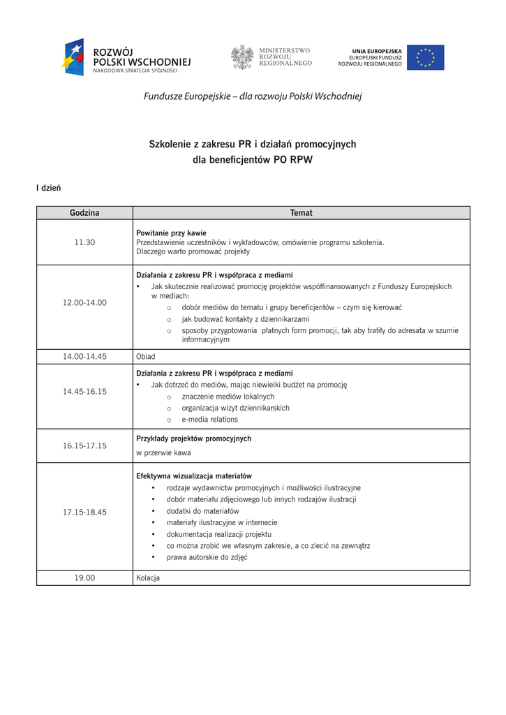 Fundusze Europejskie – dla rozwoju Polski Wschodniej Szkolenie z zakresu PR i działań promocyjnych dla beneficjentów PO RPW I dzień Godzina 11.30 Temat Powitanie przy kawie Przedstawienie uczestników i wykładowców, omówienie programu szkolenia. Dlaczego warto promować projekty Działania z zakresu PR i współpraca z mediami • 12.00-14.00 Jak skutecznie realizować promocję projektów współfinansowanych z Funduszy Europejskich w mediach: o dobór mediów do tematu i grupy beneficjentów – czym się kierować o jak budować kontakty z dziennikarzami o sposoby przygotowania płatnych form promocji, tak aby trafiły do adresata w szumie informacyjnym 14.00-14.45 Obiad Działania z zakresu PR i współpraca z mediami 14.45-16.15 • Jak dotrzeć do mediów, mając niewielki budżet na promocję o znaczenie mediów lokalnych o organizacja wizyt dziennikarskich o e-media relations 16.15-17.15 Przykłady projektów promocyjnych w przerwie kawa Efektywna wizualizacja materiałów 17.15-18.45 19.00 • rodzaje wydawnictw promocyjnych i możliwości ilustracyjne • dobór materiału zdjęciowego lub innych rodzajów ilustracji • dodatki do materiałów • materiały ilustracyjne w internecie • dokumentacja realizacji projektu • co można zrobić we własnym zakresie, a co zlecić na zewnątrz • prawa autorskie do zdjęć Kolacja II dzień Godzina 8.00 9.00-10.30 Temat Śniadanie Zasady stosowania oznaczeń w ramach PO RPW w przerwie kawa Działania z zakresu PR i współpraca z mediami • Jak sprawić, by pisali o nas dobrze i obiektywnie o kilka zasad tworzenia informacji prasowej o co może być interesującym newsem i jak go sprzedać mediom 10.30-12.30 o jak informować o problemach, aby nie wyglądały jak problemy • Pisanie komunikatów prasowych – ćwiczenia warsztatowe o analiza wybranych tekstów prasowych i komunikatów oraz informacji prasowych pod kątem stylu i jasności przekazu o samodzielne pisanie informacji dla mediów pod okiem wykładowcy 12.30-13.15 Obiad 13.15-15.15 Konsultacje bufet kawowy