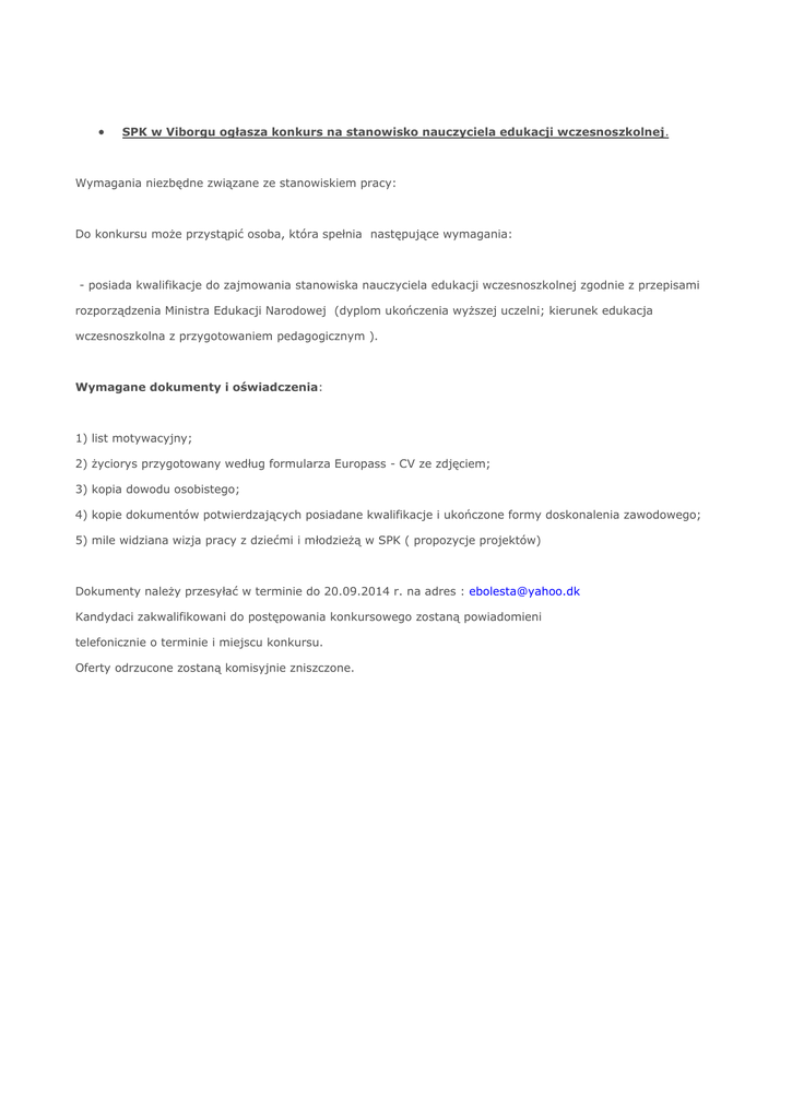 SPK w Viborgu ogłasza konkurs na stanowisko nauczyciela edukacji wczesnoszkolnej. Wymagania niezbędne związane ze stanowiskiem pracy: Do konkursu może przystąpić osoba, która spełnia następujące wymagania: - posiada kwalifikacje do zajmowania stanowiska nauczyciela edukacji wczesnoszkolnej zgodnie z przepisami rozporządzenia Ministra Edukacji Narodowej (dyplom ukończenia wyższej uczelni; kierunek edukacja wczesnoszkolna z przygotowaniem pedagogicznym ). Wymagane dokumenty i oświadczenia: 1) list motywacyjny; 2) życiorys przygotowany według formularza Europass - CV ze zdjęciem; 3) kopia dowodu osobistego; 4) kopie dokumentów potwierdzających posiadane kwalifikacje i ukończone formy doskonalenia zawodowego; 5) mile widziana wizja pracy z dziećmi i młodzieżą w SPK ( propozycje projektów) Dokumenty należy przesyłać w terminie do 20.09.2014 r. na adres : [email protected] Kandydaci zakwalifikowani do postępowania konkursowego zostaną powiadomieni telefonicznie o terminie i miejscu konkursu. Oferty odrzucone zostaną komisyjnie zniszczone.