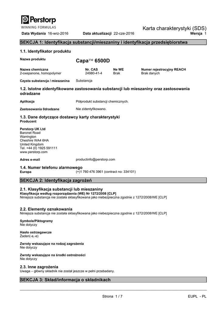 Karta charakterystyki (SDS) Data Wydania 16-wrz-2016 Data aktualizacji 22-cze-2016 Wersja 1 SEKCJA1:I dent yf i kacj asubst ancj i / mi esz ani nyii dent yf i kacj apr z edsi ębi or st wa 1.1. Identyfikator produktu Nazwa produktu CapaÔ 6500D Nazwa chemiczna 2-oxepanone, homopolymer Czysta substancja / mieszanina Nr. CAS 24980-41-4 Ne WE Brak Numer rejestracyjny REACH Brak danych Substancja 1.2. Istotne zidentyfikowane zastosowania substancji lub mieszaniny oraz zastosowania odradzane Aplikacja Pół pr oduk ts ubs t anc j i c hemi c z ny c h. Zastosowania 0dradzane Nie zidentyfikowano. 1. 3.Danedot ycz ącedost awcykar t ychar akt er yst yki Producent Perstorp UK Ltd Baronet Road Warrington Cheshire WA4 6HA United Kingdom Tel. +44 (0) 1925 591111 www.perstorp.com Adres e-mail [email protected] 1.4. Numer telefonu alarmowego Europa (+)1 760 476 3961 (contract no: 334101) SEKCJA2:I dent yf i kacj az agr oż eń 2.1. Klasyfikacja substancji lub mieszaniny Kl asyf i kacj awedł ugr oz por z ądz eni a( WE)Nr1272/ 2008[ CLP] Ni ni ej s z as ubs t anc j ani ez os t ał as k l as y f i k owanaj ak oni ebez pi ec z naz godni ez1272/ 2008/ WE[ CLP] 2.2. Elementy oznakowania Ni ni ej s z as ubs t anc j ani ez os t ał as k l as y f i k owanaj ak oni ebez pi ec z naz godni ez1272/ 2008/ WE[ CLP] Symbole/Piktogramy Nie dotyczy Hasł oost r z egawcz e Żaden( a, e) Zwr ot ywskaz uj ącenar odz ajz agr oż eni a Nie dotyczy Zwr ot ywskaz uj ącenaśr odkiost r oż ności Nie dotyczy 2. 3.I nnez agr oż eni a Uwaga–gł ównys k ł adni kni ez os t ał j es z c z ewpeł ni pr z ebadany . SEKCJA3:Skł ad/ i nf or macj aoskł adni kach ___________________________________________________________________________________________ Strona 1 / 7 EUPL - PL Data aktualizacji 22-cze-2016 CapaÔ 6500D ___________________________________________________________________________________________ 3.1 Substancje Nazwa chemiczna 2-oxepanone, homopolymer Ne WE Nr. CAS Numer rejestracyjny REACH % wagowo Kl asyf i kacj awedł ug r oz por z ądz eni a( WE)Nr1272/ 2008 [CLP] Brak 24980-41-4 Brak danych >99 Nie klasyfikowany Peł ent ek s tz wr ot ówHi EUH:pat r zs ek c j a16 Dodatkowe wskazówki Pr oduk ts t anowi wy j ąt ekodr ej es t r ac j i REACH( pol i mer ) . SEKCJA4:Śr odkipi er wsz ejpomocy 4. 1.Opi sśr odków pi er wsz ejpomocy Wdychanie Śr odk i pi er ws z ej pomoc ymedy c z nej ni es ąwy magane,al enal eż ywy j ś ćnaś wi eż e powi et r z edl awł as negok omf or t u. Kont aktz eskór ą Śr odk i pi er ws z ej pomoc yni es ąk oni ec z ne,al ez ewz gl ędówhi gi eni c z ny c hnal eż yumy ć nar aż onąs k ór ęmy dł em i wodą. Kontakt z oczyma Śr odk i pi er ws z ej pomoc ymedy c z nej ni es ąwy magane,al enal eż ypr z epł uk aćot war t e oc z ypodbi eż ąc ąwodądl awł as negok omf or t u,abyuni k nąćpodr aż ni eni a mechanicznego. Spoż yci e J eś l i poł k ni ęt az os t ał aduż ai l oś ćl ubj eś l i pos z k odowanyź l es i ęc z uj e,nal eż yz as i ęgnąć por ady/uz y s k aćpomocl ek ar s k ą. 4. 2.Naj waż ni ej sz eost r eiopóź ni oneobj awyor azskut kinar aż eni a Brak znanych. 4. 3.Wskaz ani adot ycz ącewsz el ki ejnat ychmi ast owejpomocyl ekar ski ejisz cz egól nego post ępowani azposz kodowanym Lec z y ćobj awowo. SEKCJA5:Post ępowani ew pr z ypadkupoż ar u 5. 1.Śr odkigaśni cz e Wł aści weśr odkigaśni cz e: Roz py l onawoda( mgł a) ,Pi ana,Dwut l enekwęgl a( CO2) ,Pr os z ekgaś ni c z y . Ni ewł aści weśr odkigaśni cz e Ni es t os owaćs t ał egos t r umi eni awody ,poni eważmoż et os powodowaćr oz pr os z eni ei r oz pr z es t r z eni eni es i ęogni a. 5. 2.Sz cz egól nez agr oż eni az wi ąz anezsubst ancj ąl ubmi esz ani ną Roz k ł adt er mi c z nymoż epr owadz i ćdouwol ni eni adr aż ni ąc y c hi t ok s y c z ny c hgaz ówi par :Tl enekwęgl a( CO) .Monomer (2-oksepanon, heksan-6-olid, CAS 502-44-3). 5. 3.I nf or macj edl ast r aż ypoż ar nej Wr az i epoż ar unal eż ys t os owaćni ez al eż nyapar atoddec howy . SEKCJA6:Post ępowani ew pr z ypadkuni ez ami er z onegouwol ni eni adośr odowi ska 6. 1.I ndywi dual neśr odkiost r oż ności ,wyposaż eni eochr onneipr ocedur yw syt uacj ach awaryjnych Zapewni ćodpowi edni ąwent y l ac j ę,s z c z egól ni ewmi ej s c ac hz amk ni ęt y c h. 6. 2.Śr odkiost r oż nościw z akr esi eochr onyśr odowi ska Ni es pł uk i waćdowódpowi er z c hni owy c hani k anal i z ac j i s ani t ar nej .Pat r zDz i ał 12,abyuz y s k aćdodat k owei nf or mac j e ekologiczne. 6. 3.Met odyimat er i ał yz apobi egaj ącer oz pr z est r z eni ani usi ęskaż eni aisł uż ącedousuwani a ___________________________________________________________________________________________ Strona 2 / 7 EUPL - PL Data aktualizacji 22-cze-2016 CapaÔ 6500D ___________________________________________________________________________________________ skaż eni a Met odyz apobi egaj ącer oz pr z est r z eni ani u Zebr aćmec hani c z ni e,umi eś c i ćwodpowi edni c hpoj emni k ac hwc el uut y l i z ac j i . Metody usuwania St os owaćhomol ogowanyodk ur z ac zpr z emy s ł owydous uwani a. 6.4. Odniesienia do innych sekcji Patrz sekcja 8 po dalsze informacje. Patrz sekcja 13 po dalsze informacje. SEKCJA7:Post ępowani ezsubst ancj amiimi esz ani namior azi chmagaz ynowani e 7. 1.Śr odkiost r oż nościdot ycz ącebez pi ecz negopost ępowani a Zapewni ćodpowi edni ąwent y l ac j ę,s z c z egól ni ewmi ej s c ac hz amk ni ęt y c h.Chr oni ćpr z edbez poś r edni m dz i ał ani em ś wi at ł a s ł onec z nego.Pr z ec howy waćzdal aodź r ódeł c i epł a. Ogól nekwest i ez wi ąz anezhi gi eną Pos t ępowaćz godni ezogól ni epr z y j ęt y mi z as adami BHP. 7. 2.War unkibez pi ecz negomagaz ynowani a,ł ącz ni ezi nf or macj amidot ycz ącymiwsz el ki ch wz aj emnychni ez godności Tr z y maćpoj emni ks z c z el ni ez amk ni ęt ywdobr z ewent y l owany m mi ej s c u. 7. 3.Sz cz eg