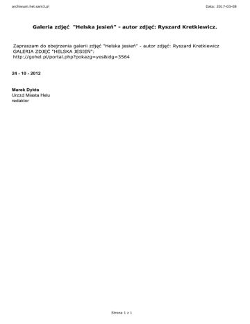 archiwum.hel.sam3.pl Data: 2017-03-08 Galeria zdjęć "Helska jesień" - autor zdjęć: Ryszard Kretkiewicz. Zapraszam do obejrzenia galerii zdjęć "Helska jesień" - autor zdjęć: Ryszard Kretkiewicz GALERIA ZDJĘĆ "HELSKA JESIEŃ": http://gohel.pl/portal.php?pokazg=yes&idg=3564 24 - 10 - 2012 Marek Dykta Urz±d Miasta Helu redaktor Strona 1 z 1