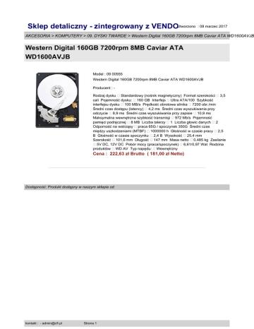 Sklep detaliczny - zintegrowany z VENDOUtworzono : 08 marzec 2017 AKCESORIA > KOMPUTERY > 09. DYSKI TWARDE > Western Digital 160GB 7200rpm 8MB Caviar ATA WD1600AVJB Western Digital 160GB 7200rpm 8MB Caviar ATA WD1600AVJB Model : 09 00555 Western Digital 160GB 7200rpm 8MB Caviar ATA WD1600AVJB Producent : Rodzaj dysku Standardowy (nośnik magnetyczny) Format szerokości 3,5 cali Pojemność dysku: 160 GB Interfejs Ultra ATA/100 Szybkość interfejsu dysku 100 MB/s Prędkość obrotowa silnika 7200 obr./min Średni czas dostępu (latency) 4,2 ms Średni czas wyszukiwania przy odczycie 8,9 ms Średni czas wyszukiwania przy zapisie 10,9 ms Maksymalna wewnętrzna szybkość transmisji 972 Mb/s Pojemność pamięci podręcznej 8 MB Liczba talerzy 1 Liczba głowic danych 2 Odporność na wstrząsy praca 65G / spoczynek 350G Średni czas między uszkodzeniami (MTBF) 1000000 h Głośność w czasie pracy 2,5 B Głośność w czasie spoczynku 2,4 B Wysokość 25,4 mm Szerokość 101,6 mm Długość 147 mm Masa netto 0,485 kg Zasilanie 5V DC, 12V DC Pobór mocy (praca/spoczynek) 6,61/0,97 Wat Rodzina produktów WD AV Typ napędu: Wewnętrzny Cena : 222,63 zł Brutto ( 181,00 zł Netto) Dostępność: Produkt dostępny w naszym sklepie od kontakt : - [email protected] Strona 1