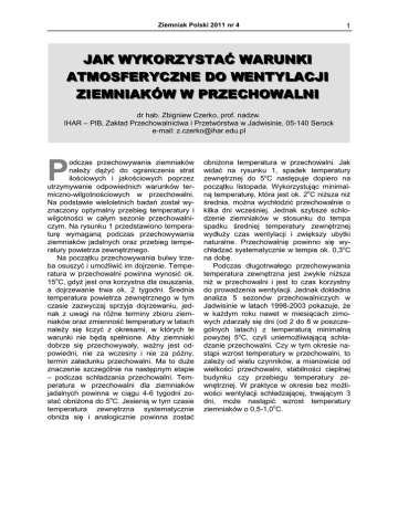 Ziemniak Polski 2011 nr 4 1 JAK WYKORZYSTAĆ WARUNKI ATMOSFERYCZNE DO WENTYLACJI ZIEMNIAKÓW W PRZECHOWALNI dr hab. Zbigniew Czerko, prof. nadzw. IHAR – PIB, Zakład Przechowalnictwa i Przetwórstwa w Jadwisinie, 05-140 Serock e-mail: [email protected] odczas przechowywania ziemniaków należy dążyć do ograniczenia strat ilościowych i jakościowych poprzez utrzymywanie odpowiednich warunków termiczno-wilgotnościowych w przechowalni. Na podstawie wieloletnich badań został wyznaczony optymalny przebieg temperatury i wilgotności w całym sezonie przechowalniczym. Na rysunku 1 przedstawiono temperaturę wymaganą podczas przechowywania ziemniaków jadalnych oraz przebieg temperatury powietrza zewnętrznego. Na początku przechowywania bulwy trzeba osuszyć i umożliwić im dojrzenie. Temperatura w przechowalni powinna wynosić ok. 15oC, gdyż jest ona korzystna dla osuszania, a dojrzewanie trwa ok. 2 tygodni. Średnia temperatura powietrza zewnętrznego w tym czasie zazwyczaj sprzyja dojrzewaniu, jednak z uwagi na różne terminy zbioru ziemniaków oraz zmienność temperatury w latach należy się liczyć z okresami, w których te warunki nie będą spełnione. Aby ziemniaki dobrze się przechowywały, ważny jest odpowiedni, nie za wczesny i nie za późny, termin załadunku przechowalni. Ma to duże znaczenie szczególnie na następnym etapie – podczas schładzania przechowalni. Temperatura w przechowalni dla ziemniaków jadalnych powinna w ciągu 4-6 tygodni zostać obniżona do 5oC. Jesienią w tym czasie temperatura zewnętrzna systematycznie obniża się i analogicznie powinna zostać P obniżona temperatura w przechowalni. Jak widać na rysunku 1, spadek temperatury zewnętrznej do 5oC następuje dopiero na początku listopada. Wykorzystując minimalną temperaturę, która jest ok. 2oC niższa niż średnia, można wychłodzić przechowalnie o kilka dni wcześniej. Jednak szybsze schłodzenie ziemniaków w stosunku do tempa spadku średniej temperatury zewnętrznej wydłuży czas wentylacji i zwiększy ubytki naturalne. Przechowalnię powinno się wychładzać systematycznie w tempie ok. 0,3oC na dobę. Podczas długotrwałego przechowywania temperatura zewnętrzna jest zwykle niższa niż w przechowalni i jest to czas korzystny do prowadzenia wentylacji. Jednak dokładna analiza 5 sezonów przechowalniczych w Jadwisinie w latach 1998-2003 pokazuje, że w każdym roku nawet w miesiącach zimowych zdarzały się dni (od 2 do 8 w poszczególnych latach) z temperaturą minimalną powyżej 5oC, czyli uniemożliwiającą schładzanie przechowalni. Czy w tym okresie nastąpi wzrost temperatury w przechowalni, to zależy od wielu czynników, a mianowicie od wielkości przechowalni, stabilności cieplnej budynku czy przebiegu temperatury zewnętrznej. W praktyce w okresie bez możliwości wentylacji schładzającej, trwającym 3 dni, może nastąpić wzrost temperatury ziemniaków o 0,5-1,0oC. 2 Ziemniak Polski 2011 nr 4 Rys. 1. Przebieg temperatury zewnętrznej (Jadwisin) oraz wymaganej do przechowywania ziemniaków jadalnych Rys. 2. Przebieg wilgotności względnej powietrza zewnętrznego. Jadwisin Średnia temperatura zewnętrzna na przełomie marca i kwietnia wzrasta i przekracza 5oC. Podobnie, pomimo dużej bezwładności cieplnej, rośnie temperatura w przechowalni. Wpływa na to przenikanie ciepła z zewnątrz oraz zwiększone oddychanie bulw na początku kiełkowania. Z punktu widzenia potrzeb przechowalniczych ziemniaki jadalne są sprzedawane do końca maja, a nawet do początku czerwca. Jak widać na rysunku 1, średnio od początku kwietnia w zasadzie nie ma możliwości utrzymania optymalnej temperatury bulw przy wykorzystaniu jedynie powietrza zewnętrznego. Oczywiście występują niekiedy chłodniejsze wiosny, kiedy temperatura tak intensywnie nie rośnie, ale przy budowie przechowalni i projektowaniu wyposażenia należy uwzględniać temperatury średnie wieloletnie. Ziemniaki jadalne przechowywane do początku czerwca powinny być umieszczone w komorze wyposażonej w urządzenia chłodnicze. Przebieg wilgotności zewnętrznej powietrza ma wpływ na utrzymanie wilgotności w przechowalni. Na rysunku 2 przedstawiono przebieg zewnętrznej wilgotności dekadowej w Jadwisinie. Z wykresu wynika, że najniższa wilgotność względna – 85% – występuje na początku jesieni i wiosną. W zimie wilgot- Ziemniak Polski 2011 nr 4 ność utrzymuje się na korzystnym poziomie 85-93%. W przechowalnictwie do określenia wpływu warunków zewnętrznych na ubytki naturalne używa się często pojęcia „niedosytu wilgotności powietrza”, które wiąże z sobą temperaturę i wilgotność. Niedosyt wilgotności jest definiowany jako różnica między 3 prężnością maksymalną w temperaturze powietrza, w której została zmierzona prężność aktualna, a wartością prężności aktualnej, wyrażona w hPa. Od wartości niedosytu wilgotności zależy m.in. prędkość zachodzących procesów parowania: im niedosyt większy, tym parowanie jest szybsze. Rys. 3. Przebieg niedosytu wilgotności powietrza zewnętrznego (hPa). Jadwisin Bardzo korzystny dla przechowywania ziemniaków jest niedosyt wilgotności poniżej 1 hPa, ale takie warunki panują tylko w zimie – 0,34-0,93 hPa (rys. 3). Najbardziej wartość ta jest przekroczona jesienią we wrześniu i październiku oraz wiosną w marcu i kwietniu. Na rysunku 4 przedstawiono przebieg zmian niedosytu wilgotności powietrza zewnętrznego jesienią i wiosną zależnie od czasu pracy systemu wentylacji. Należy przypomnieć, że w projektowanych przechowalniach, ze względu na wydajność wentylatorów, średni dobowy czas wietrzenia wynosi 6 godzin. Niższy niedosyt wilgotności można uzyskać, wietrząc krócej (2 godziny), ale wymaga to użycia wentylatorów o większej wydajności. Decydując się na wyposażenie przechowalni w system wentylacji, zawsze trzeba pójść na pewien kompromis. Można zastosować większe 