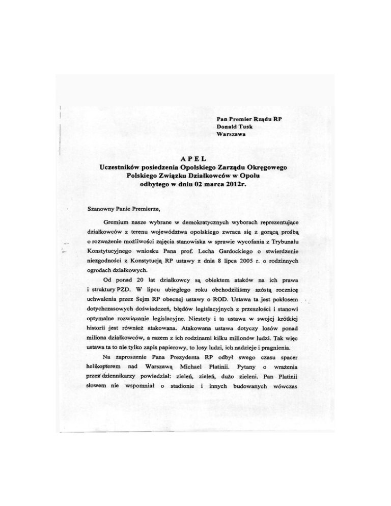 Pan Premier Rządu RP Donald Tusk Warszawa APEL Uczestników posiedzenia Opolskiego Zarządu Okręgowego Polskiego Związku Działkowców w Opolu odbytego w dniu 02 marca 2012r. Szanowny Panie Premierze, Gremium nasze wybrane w demokratycznych wyborach reprezentujące działkowców z terenu województwa opolskiego zwraca się z gorącą prośbą 0 rozważenie możliwości zajęcia stanowiska w sprawie wycofania z Trybunału Konstytucyjnego wniosku Pana prof. Lecha Gardockiego o stwierdzenie niezgodności z Konstytucją RP ustawy z dnia 8 lipca 2005 r. o rodzinnych ogrodach działkowych. Od ponad 20 lat działkowcy są obiektem ataków na ich prawa 1 struktury PZD. W lipcu ubiegłego roku obchodziliśmy szóstą rocznicę uchwalenia przez Sejm RP obecnej ustawy o ROD. Ustawa ta jest pokłosem dotychczasowych doświadczeń, błędów legislacyjnych z przeszłości i stanowi optymalne rozwiązanie legislacyjne. Niestety i ta ustawa w swojej krótkiej historii jest również atakowana. Atakowana ustawa dotyczy losów ponad miliona działkowców, a razem z ich rodzinami kilku milionów ludzi. Tak więc ustawa ta to nie tylko zapis papierowy, to losy ludzi, ich nadzieje i pragnienia. Na zaproszenie Pana Prezydenta RP odbył swego czasu spacer helikopterem nad Warszawą Michael Platinii. Pytany o wrażenia prze^ dziennikarzy powiedział: zieleń, zieleń, dużo zieleni. Pan Platinii słowem nie wspomniał o stadionie i innych budowanych wówczas obiektach na Euro 2012. Ta zieleń to właśnie nasze ogrody. Ogrody powstałe często na wysypiskach śmieci, bagnach i nieużytkach. Dzisiaj grunty te stanowią łakome kąski dla komercji. Ogrody to nasze dobro wspólne, tak jak Warszawa wyglądają także inne miasta w kraju. Nie można dopuścić do tego, aby komercja zamieniła tą zieleń w kamienne pustynie. Prowadzony atak jest skierowany przeciwko ludziom o najniższych dochodach, w podeszłym wielu i schorowanym. Dla ludzi tych działka jest rodzajem świadczenia socjalnego. Działkowcy u schyłku swojego życia mają prawo domagać się spokoju i stabilizacji, tymczasem spotyka ich stres i niepewność. Nasze ogrody są otwarte, są one wdzięcznym obiektem do spacerów odbywanych przez np. przedszkolaków, pełnia funkcję edukacyjną. Nie ma piękniejszego widoku jak grupa przedszkolaków spacerująca po ogrodzie, zachwycająca się zielenią i kwiatami. Nie można dopuścić do tego, aby młody człowiek oglądał zieleń, kwiaty czy zioła w ogrodzie botanicznym. Dotychczas różne gremia działkowców skierowały do ważnych organów RP kilka tysięcy wniosków, apeli czy protestów w obronie naszej ustawy. W wystąpieniach tych podnoszono zarzuty merytoryczne przeciwko wnioskowi byłego Pierwszego Prezesa Sądu Najwyższego, a tym samym nie chcemy ich powtarzać. Spełnienie naszego apelu pozwoli działkowcom odpocząć i odetchnąć z ulgą. Działkowcy są świadomi jak groźny jest obecny atak. Powodzenie tego ataku przed Trybunałem Konstytucyjnym będzie bezwzględnie wiążące dla ustawodawcy, partii politycznych i rządu RP. Dla działkowców taki finał oznaczać będzie kompletną klęskę i przyspieszony koniec życia tysięcy ludzi, którzy nie będą w stanie tego wytrzymać. Struktury naszego państwa nie są kompletnie gotowe na przyjęcie ponad milionowej organizacji, jej majątku, problemów i struktur organizacyjnych. Rzucenie na żer komercji naszych ogrodów spowoduje kompletną anarchię, korupcję i inne patologie na skalę wręcz niewyobrażalną. 3 Związek nasz nigdy nie protestował, gdy na cele dobra społecznego należało oddać część naszych ogrodów. Dobrym przykładem jest tutaj m.in. stadion w Gdańsku, bliskim Pana sercu, który powołał na terenie naszych rodzinnych ogrodów działkowych. Chcemy w tym miejscu przypomnieć słowa takich szlagierów wokalnych jak „Na kamieniu kwiaty nie rosną", czy Jonasza Kofty „Pamiętajcie 0 ogrodach" . Z wyrazami najwyższego szacunku dla Pana starań i walkę dla Polski 1 dobra jej obywateli. /^Okręgowy' Zarząd Opolski Opole, 02 marca 2012r. jtaia^sf^ ifHaj Jftadfd^ d&L rdL 'Łn-A fcfl^' // iw ^¿o Uj^Jo^ ^ J ^ f&jfiZtoHc ^tS&ćr^ii
