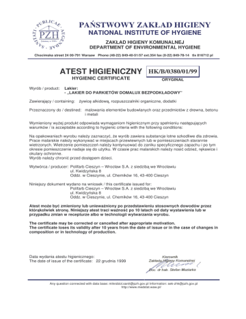 PA STWOWY ZAKŁAD HIGIENY NATIONAL INSTITUTE OF HYGIENE ZAKŁAD HIGIENY KOMUNALNEJ DEPARTMENT OF ENVIRONMENTAL HYGIENE Chocimska street 24 00-791 Warsaw Phone (48-22) 849-40-51/57 ext.354 fax (0-22) 849-78-14 tlx 816712 pl ATEST HIGIENICZNY HK/B/0380/01/99 HYGIENIC CERTIFICATE Wyrób / product: ORYGINAŁ Lakier: - „LAKIER DO PARKIETÓW DOMALUX BEZPODKŁADOWY” Zawieraj cy / containing: ywic alkidow , rozpuszczalniki organiczne, dodatki Przeznaczony do / destined: malowania elementów budowlanych oraz przedmiotów z drewna, betonu i metali Wymieniony wy ej produkt odpowiada wymaganiom higienicznym przy spełnieniu nast puj cych warunków / is acceptable according to hygienic criteria with the following conditions: Na opakowaniach wyrobu nale y zaznaczy , e wyrób zawiera substancje lotne szkodliwe dla zdrowia. Prace malarskie nale y wykonywa w miejscach przewiewnych lub w pomieszczeniach starannie wietrzonych. Wietrzenie pomieszcze nale y kontynuowa do zaniku specyficznego zapachu i po tym okresie pomieszczenie nadaje si do u ytku. W czasie prac malarskich nale y nosi odzie , r kawice i okulary ochronne. Wyrób nale y chroni przed dost pem dzieci. Wytwórca / producer: Polifarb Cieszyn – Wrocław S.A. z siedzib we Wrocławiu ul. Kwidzy ska 8 Oddz. w Cieszynie, ul. Chemików 16, 43-400 Cieszyn Niniejszy dokument wydano na wniosek / this certificate issued for: Polifarb Cieszyn – Wrocław S.A. z siedzib we Wrocławiu ul. Kwidzy ska 8 Oddz. w Cieszynie, ul. Chemików 16, 43-400 Cieszyn Atest mo e by zmieniony lub uniewa niony po przedstawieniu stosownych dowodów przez któr kolwiek stron . Niniejszy atest traci wa no po 10 latach od daty wystawienia lub w przypadku zmian w recepturze albo w technologii wytwarzania wyrobu. The certificate may be corrected or cancelled after appropriate motivation. The certificate loses its validity after 10 years from the date of issue or in the case of changes in composition or in technology of production. Data wydania atestu higienicznego: The date of issue of the certificate: 22 grudnia 1999 Any question connected with data base: [email protected] Information: [email protected] http://www.medstat.waw.pl/ PA STWOWY ZAKŁAD HIGIENY NATIONAL INSTITUTE OF HYGIENE ZAKŁAD HIGIENY KOMUNALNEJ DEPARTMENT OF ENVIRONMENTAL HYGIENE Chocimska Street 24 00-791 Warsaw Phone (22) 5421354 Fax (22) 8497814 e-mail: [email protected] ATEST HIGIENICZNY HK/B/1628/01/2002 HYGIENIC CERTIFICATE ORYGINAŁ Wyrób / product: DOMALUX – lakier do parkietów o odporno ci na zarysowania połysk Zawieraj cy / containing: ywic poliuretanow , octan metoksypropylu, octan butylu, ksylen, tolueno-diizocyjanian Przeznaczony do / destined: stosowania wewn trz pomieszcze budynków mieszkalnych i u yteczno ci publicznej, w tym w obiektach szkolno-wychowawczych i słu by zdrowia Wymieniony wy ej produkt odpowiada wymaganiom higienicznym przy spełnieniu nast puj cych warunków / is acceptable according to hygienic criteria with the following conditions: Na opakowaniu wyrobu nale y umie ci etykiet w j zyku polskim zawieraj c zalecenia dotycz ce rodków ostro no ci wg karty charakterystyki wyrobu, zgodnie z obowi zuj cymi przepisami prawnymi. Wyrób przechowywa w miejscu niedost pnym dla dzieci. Lakier mog stosowa wył cznie ekipy zawodowe. Lakier nale y stosowa wył cznie w pomieszczeniach intensywnie wietrzonych. Wietrzenie pomieszcze nale y kontynuowa do zaniku specyficznego zapachu i po tym okresie nadaj si do u ytkowania. W tym czasie w pomieszczeniach tych nie powinny przebywa kobiety ci arne oraz osoby chore i w podeszłym wieku. Wytwórca / producer: Polifarb Cieszyn – Wrocław S.A. z siedzib we Wrocławiu 51-416 Wrocław, ul. Kwidzy ska 8 Niniejszy dokument wydano na wniosek / this certificate issued for: Polifarb Cieszyn – Wrocław S.A. z siedzib we Wrocławiu 51-416 Wrocław, ul. Kwidzy ska 8 Atest mo e by zmieniony lub uniewa niony po przedstawieniu stosownych dowodów przez któr kolwiek stron . Niniejszy atest traci wa no po 2007-08-07 lub w przypadku zmian w recepturze albo w technologii wytwarzania wyrobu. The certificate may be corrected or cancelled after appropriate motivation. The certificate loses its validity after 2007-08-07 or in the case of changes in composition or in technology of production. Data wydania atestu higienicznego: The date of issue of the certificate: 7 sierpnia 2002 www.pzh.gov.pl PA STWOWY ZAKŁAD HIGIENY NATIONAL INSTITUTE OF HYGIENE ZAKŁAD HIGIENY KOMUNALNEJ DEPARTMENT OF ENVIRONMENTAL HYGIENE Chocimska street 24 00-791 Warsaw Phone (48-22) 849-40-51/57 ext.354 fax (0-22) 849-78-14 tlx 816712 pl ATEST HIGIENICZNY HK/B/1483/01/99 HYGIENIC CERTIFICATE Wyrób / product: ORYGINAŁ Lakier poliuretanowy jadnoskładnikowy do parkietów – DOMALUX SUPER Zawieraj cy / containing: ywic poliuretanow , diizocyjanian, octan metoksypropylu, dodatki Przeznaczony do / destined: lakierowania drewna i wyrobów drewnianych w tym drewnianych podłóg, schodów, boazerii. Wymieniony wy ej produkt odpowiada wymaganiom higienicznym przy spełnieniu nast puj cych warunków / is acceptable according to hygienic criteria with the following conditions: Na opakowaniu wyrobu nale y zaznaczy , e wyrób zawiera substancje szkodliwe dla zdrowia i nieutwardzona ywica mo e powodowa odczyny alergiczne i uszkodzenia płuc. Lakier mog stosowa wył cznie ekipy zawodowe. Lakier nale y stosowa wył cznie w pomieszczeniach intensywnie wietrzonych. Wietrzenie pomieszcze nale y kontynuowa do zaniku specyficznego zapachu i po tym okresie nadaj si do u ytkowania. W tym czasie w pomieszczeniach tych nie powinny przebywa kobiety ci arne oraz osoby chore i w podeszłym wieku. W czasie pracy nale y nosi odzie , r kawice i okulary ochronne, a w przypadku stosowania metody natryskowej równie mask ochronn . Wyrób nale y chroni przed dost pem dzieci. Wytwórca / producer: Polifarb Cieszyn – Wrocław S.A. – Oddział Wrocław 51-416 Wrocław, ul. Kwidzy ska 8 Niniejszy dokument wydano na 