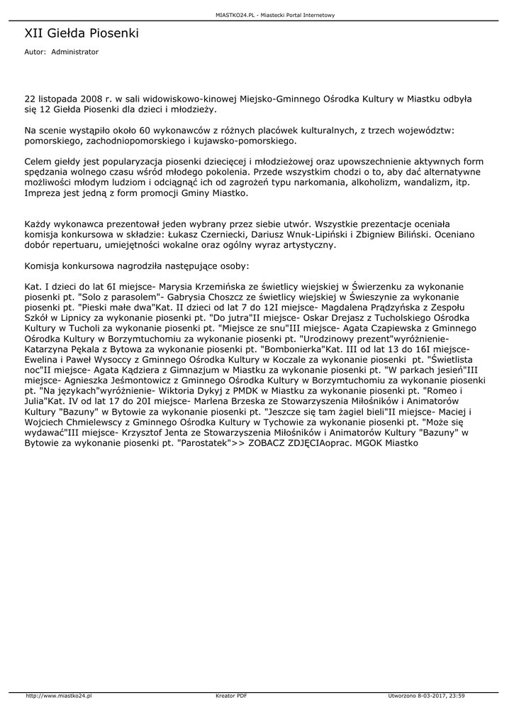 MIASTKO24.PL - Miastecki Portal Internetowy XII Giełda Piosenki Autor: Administrator 22 listopada 2008 r. w sali widowiskowo-kinowej Miejsko-Gminnego Ośrodka Kultury w Miastku odbyła się 12 Giełda Piosenki dla dzieci i młodzieży. Na scenie wystąpiło około 60 wykonawców z różnych placówek kulturalnych, z trzech województw: pomorskiego, zachodniopomorskiego i kujawsko-pomorskiego. Celem giełdy jest popularyzacja piosenki dziecięcej i młodzieżowej oraz upowszechnienie aktywnych form spędzania wolnego czasu wśród młodego pokolenia. Przede wszystkim chodzi o to, aby dać alternatywne możliwości młodym ludziom i odciągnąć ich od zagrożeń typu narkomania, alkoholizm, wandalizm, itp. Impreza jest jedną z form promocji Gminy Miastko. Każdy wykonawca prezentował jeden wybrany przez siebie utwór. Wszystkie prezentacje oceniała komisja konkursowa w składzie: Łukasz Czerniecki, Dariusz Wnuk-Lipiński i Zbigniew Biliński. Oceniano dobór repertuaru, umiejętności wokalne oraz ogólny wyraz artystyczny. Komisja konkursowa nagrodziła następujące osoby: Kat. I dzieci do lat 6I miejsce- Marysia Krzemińska ze świetlicy wiejskiej w Świerzenku za wykonanie piosenki pt. "Solo z parasolem"- Gabrysia Choszcz ze świetlicy wiejskiej w Świeszynie za wykonanie piosenki pt. "Pieski małe dwa"Kat. II dzieci od lat 7 do 12I miejsce- Magdalena Prądzyńska z Zespołu Szkół w Lipnicy za wykonanie piosenki pt. "Do jutra"II miejsce- Oskar Drejasz z Tucholskiego Ośrodka Kultury w Tucholi za wykonanie piosenki pt. "Miejsce ze snu"III miejsce- Agata Czapiewska z Gminnego Ośrodka Kultury w Borzymtuchomiu za wykonanie piosenki pt. "Urodzinowy prezent"wyróżnienieKatarzyna Pękala z Bytowa za wykonanie piosenki pt. "Bombonierka"Kat. III od lat 13 do 16I miejsceEwelina i Paweł Wysoccy z Gminnego Ośrodka Kultury w Koczale za wykonanie piosenki pt. "Świetlista noc"II miejsce- Agata Kądziera z Gimnazjum w Miastku za wykonanie piosenki pt. "W parkach jesień"III miejsce- Agnieszka Jeśmontowicz z Gminnego Ośrodka Kultury w Borzymtuchomiu za wykonanie piosenki pt. "Na językach"wyróżnienie- Wiktoria Dykyj z PMDK w Miastku za wykonanie piosenki pt. "Romeo i Julia"Kat. IV od lat 17 do 20I miejsce- Marlena Brzeska ze Stowarzyszenia Miłośników i Animatorów Kultury "Bazuny" w Bytowie za wykonanie piosenki pt. "Jeszcze się tam żagiel bieli"II miejsce- Maciej i Wojciech Chmielewscy z Gminnego Ośrodka Kultury w Tychowie za wykonanie piosenki pt. "Może się wydawać"III miejsce- Krzysztof Jenta ze Stowarzyszenia Miłośników i Animatorów Kultury "Bazuny" w Bytowie za wykonanie piosenki pt. "Parostatek">> ZOBACZ ZDJĘCIAoprac. MGOK Miastko http://www.miastko24.pl Kreator PDF Utworzono 8-03-2017, 23:59