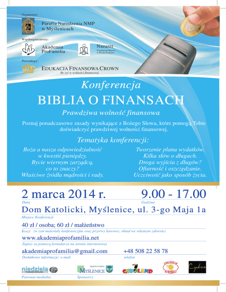 Organizator: Parafia Narodzenia NMP w Myślenicach Współorganizatorzy: Nazaret Akademia ProFamilia Wspólnota Odnowy w Duchu Świętym Prowadzący: EDUKACJA FINANSOWA CROWN By żyć w wolności finansowej Konferencja BIBLIA O FINANSACH Prawdziwa wolność finansowa Poznaj ponadczasowe zasady wynikające z Bożego Słowa, które pomogą Tobie doświadczyć prawdziwej wolności finansowej. Tematyka konferencji: Boża a nasza odpowiedzialność w kwestii pieniędzy. Bycie wiernym zarządcą, co to znaczy? Właściwe źródła mądrości i rady. Tworzenie planu wydatków. Kilka słów o długach. Droga wyjścia z długów? Ofiarność i oszczędzanie. Uczciwość jako sposób życia. 9.00 - 17.00 2 marca 2014 r. Data Godzina Dom Katolicki, Myślenice, ul. 3-go Maja 1a Miejsce Konferencji 40 zł / osoba; 60 zł / małżeństwo Koszt (w tym materiały konferencyjne oraz przerwy kawowe; obiad we własnym zakresie) www.akademiaprofamilia.net Zapisy za pomocą formularza na stronie internetowej [email protected] +48 508 22 58 78 Dodatkowe informacje: e-mail telefon Patronat medialny Sponsorzy