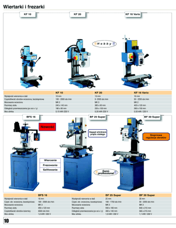 Wiertarki i frezarki KF 10 KF 20 Wydajność wiercenia w stali Częstotliwość obrotów wrzeciona, bezstopniowa Mocowanie wrzeciona Rozmiary stołu Odległość przemieszczania (po osi x / y) Moc silnika KF 16 Vario KF 10 KF 20 KF 16 Vario 10 mm 100 - 2000 obr./min MK 2 240 x 145 mm 180 x 90 mm 0,15 kWt /230 V 13 mm 0- 2500 obr./min MK 3 385 x 90 mm 235 x 100 mm 0,35 kWt /230 V 16 mm 50 - 2250 obr./min MK 2 400 x 120 mm 280 x 150 mm 0,50 kWt / 230 V BFS 16 BF 25 Super BF 30 Super Nowość Napęd silnikiem prądu stałego Stopniowa regulacja obrotów Wiercenie Frezowanie Szlifowanie BFS 16 Wydajność wiercenia w stali Częst. obr. wrzeciona, bezstopniowa Mocowanie wrzeciona Rozmiary stołu Częstotliwość obrotów ściernicy Moc silnika 10 16 mm 100 - 2500 obr./min MK 3 450 x 120 mm 2500 obr./min 1,0 kWt / 230 V Wydajność wiercenia w stali Częst. obr. wrzeciona, bezstopniowa Mocowanie wrzeciona Rozmiary stołu Odległość przemieszczania (po osi x / y) Moc silnika BF 25 Super BF 30 Super 25 mm 100 - 1750 obr./min MK 3 550 x 160 mm 400 x 140 mm 1,0 kWt / 230 V 30 mm 50 - 2250 obr./min MK 3 840 x 210 mm 565 x 215 mm 1,1 kWt / 230 V Wiertarki i frezarki KF 25 D Vario KF 25 L Vario KF 25 TOP Stół KF 25 L Vario 700 x 180 mm Nowość Nowość Bieg trzpienia MK 3 Wydajność wiercenia w stali Częstotliwość obrotów wrzeciona, bezstopniowa Mocowanie wrzeciona Rozmiary stołu Odległość przemieszczania (po osi x / y) Moc silnika KF 25 D Vario KF 25 L Vario KF 25 TOP 20 mm 50 - 2250 obr./min MK 2 500 x 180 mm 305 x 150 mm 0,60 kWt / 230 V 20 mm 50 - 2250 obr./min MK 2 700 x 180 mm 490 x 150 mm 0,60 kWt / 230 V 20 mm 50 - 2250 obr./min MK 3 700 x 180 mm 490 x 150 mm 0,60 kWt / 230 V KF 30 KF 40 KF 45 2-stopniowy motor seryjny Wydajność wiercenia w stali Częstotliwość obrotów wrzeciona Mocowanie wrzeciona Rozmiary stołu Odległość przemieszczania (po osi x / y) Moc silnika KF 30 KF 40 32 mm (12) 125 - 2500 obr./min MK 3 730 x 210 mm 430 x 185 mm 1,1 kWt / 400 V 32 mm (12) 80- 2500 obr./min MK 3 700 x 240 mm 475 x 210 mm 0,55 / 0,75 kWt - 400 V KF 45 Wydajność wiercenia w odlewach Częstotliwość obrotów wrzeciona Mocowanie wrzeciona Rozmiary stołu Odległość przemieszczania (po osi x / y) Moc silnika 40 mm (12) 80- 2500 obr./min MK 4 800 x 240 mm 505 x 205 mm 0,85 / 1,1 kWt - 400 V 11 Wiertarki i frezarki FM 45 V FM 40 V 2-stopniowy motor seryjny Posuw przesuwnej tulei wrzecionowej seryjny FM 40 V Wydajność wiercenia w odlewach Mocowanie wrzeciona Posuw tuleji Rozmiary stołu Odległość przemieszczania (po osi x / y) Moc silnika FM 45 V 40 mm MK 3 (3) 0,12 / 0,19 / 0,26 mm/obr. 730 x 210 mm 500 x 210 mm 0,85 / 1,1 kWt - 400 V KF 60 12 40 mm (8) 115- 1750 obr./min ISO 40 800 x 240 mm 400 x 230 x 400 mm 0,85 / 1,5 kWt 40 mm MK 4 (3) 0,12 / 0,19 / 0,26 mm/obr. 820 x 240 mm 550 x 190 mm 0,85 / 1,1 kWt - 400 V UWF 80 KF 60 Wydajność wiercenia w odlewach Częst. obr. wrzeciona Mocowanie wrzeciona Rozmiary stołu Odl. przemieszczania (po osi x / y) Moc silnika Wydajność wiercenia w odlewach Mocowanie wrzeciona Posuw tuleji Rozmiary stołu Odległość przemieszczania (po osi x / y) Moc silnika UWF 80 E UWF 80 Rozmiary stołu Mocowanie wrzeciona Częst. obr. wrzeciona, pionowy Wysięg Zakres posuwu Moc silnika 800 x 240 mm ISO 40 (8) 115 - 1750 obr./min 190 - 740 mm 24 - 720 mm/min 0,85 / 1,5 kWt UWF 80 E Rozmiary stołu Mocowanie wrzeciona Częst. obr. wrzeciona, pionowy Odl. przemieszczania (po osi x / y / z) Wysięg Moc silnika 1000 x 240 mm ISO 40 (8) 115 - 1750 obr./min 600 x 220 x 350 mm 190 - 740 mm 0,85 / 1,5 kWt Wiertarki i frezarki BF 40 BF 40 V KF 50 Posuw przesuwnej tulei wrzecionowej seryjny BF 40 Wydajność wiercenia w stali Częstotliwość obrotów wrzeciona Mocowanie wrzeciona Rozmiary stołu Odl. przemieszczania (po osi x / y) Moc silnika BF 40 V 32 mm (12) 50 - 2520 obr./min MK 4 730 x 210 mm 500 x 180 mm 0,85 / 1,1 kWt Wydajność wiercenia w odlewach Mocowanie wrzeciona Posuw tuleji Rozmiary stołu Odl. przemieszczania (po osi x / y) Moc silnika 40 mm MK 4 0,12 / 0,19 / 0,26 mm/obr. 730 x 210 mm 500 x 180 mm 0,85 / 1,1 kWt KF 50 Wydajność wiercenia w stali Częstotliwość obrotów wrzeciona Mocowanie wrzeciona Rozmiary stołu Odl. przemieszczania (po osi x / y) Moc silnika UWF 90 35 mm (8) 115- 1750 obr./min MK 4 800 x 240 mm 400 x 230 mm 0,85 / 1,5 kWt UWF 95 Posuw przesuwnej tulei wrzecionowej seryjny UWF 90 Rozmiary stołu Mocowanie wrzeciona Odległość przemieszczania (po osi x / y) Zakres obrotu stożku wrzeciona Moc silnika, pozioma Waga, ≈ 1120 x 260 mm ISO 40 600 x 305 x 340 mm od -90° do +90° 2,2 kWt 1350 kg UWF 95 Rozmiary stołu Mocowanie wrzeciona Posuw tuleji Odległość przemieszczania (po osi x / y / z) Moc silnika Waga, ≈ 1325 x 320 mm ISO 40 0,08 / 0,15 / 0,25 mm/obr. 750 x 290 x 400 mm 2,2 kWt 2000 kg 13 Wiertarki i frezarki MFM 250 MFM 230 Zawiera pneumatyczny zacisk narzędzia Napęd „Vario” MFM 230 Rozmiary stołu Mocowanie wrzeciona Częstotliwość obrotów wrzeciona, bezstopniowa Posuw tuleji Odległość przemieszczania (po osi x / y) Moc silnika MFM 250 1245 x 230 mm ISO 40 50 - 3335 obr./min (3) 0,04 / 0,08 / 0,15 mm/obr. 735 x 340 x 360 mm 2,25 kWt Rozmiary stołu Mocowanie wrzeciona Częstotliwość obrotów wrzeciona, bezstopniowa Posuw tuleji Odległość przemieszczania (po osi x / y / z) Moc silnika UWF 130 1370 x 254 mm ISO 40 50 - 3335 obr./min (3) 0,04 / 0,08 / 0,15 mm/obr. 850 x 410 x 410 mm 2,25 kWt BFM 180 Silnik podnoszenia seryjny Nowość UWF 130 Rozmiary stołu Mocowanie wrzeciona Odległość przemieszczania (po osi x / y) Wysięg Moc silnika Odległość pomiędzy wrzecionem i stołem 14 1320 x 320 mm ISO 40 1000 x 270 x 450 mm 0 - 780 mm 3,0 kWt 200 - 650 mm BFM 180 Rozmiary stołu Mocowanie wrzeciona Posuw tuleji Odległość przemieszczania (po osi x / y / z) Odległość pomiędzy wrzecionem i stołem Moc silnika 1220 x 360 mm ISO 40 0,1 / 0,15 / 0,3 mm/obr. 620 x 370 x 510 mm 90 - 600