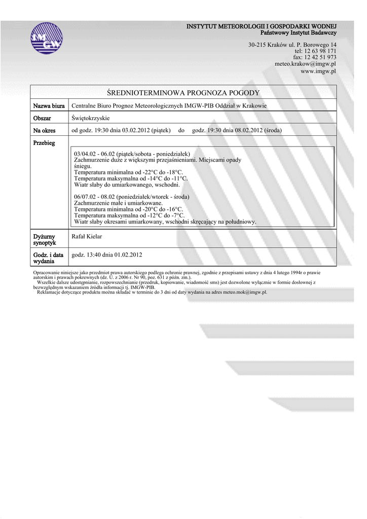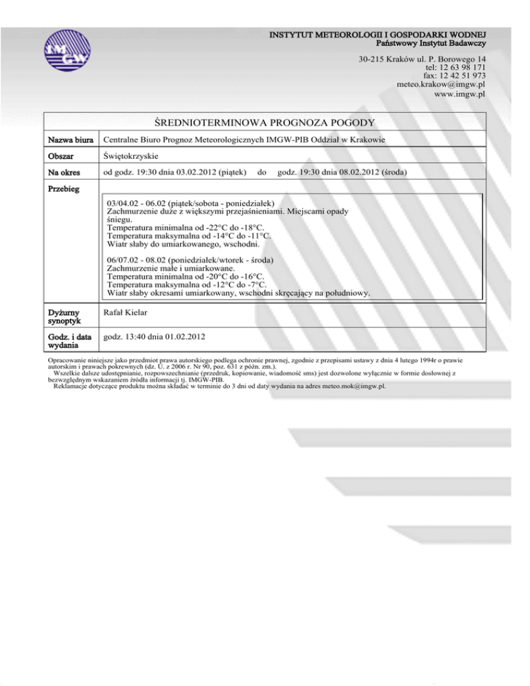 INSTYTUT METEOROLOGII I GOSPODARKI WODNEJ Państwowy Instytut Badawczy 30-215 Kraków ul. P. Borowego 14 tel: 12 63 98 171 fax: 12 42 51 973 [email protected] www.imgw.pl ŚREDNIOTERMINOWA PROGNOZA POGODY Nazwa biura Centralne Biuro Prognoz Meteorologicznych IMGW-PIB Oddział w Krakowie Obszar Świętokrzyskie Na okres od godz. 19:30 dnia 03.02.2012 (piątek) do godz. 19:30 dnia 08.02.2012 (środa) Przebieg 03/04.02 - 06.02 (piątek/sobota - poniedziałek) Zachmurzenie duże z większymi przejaśnieniami. Miejscami opady śniegu. Temperatura minimalna od -22°C do -18°C. Temperatura maksymalna od -14°C do -11°C. Wiatr słaby do umiarkowanego, wschodni. 06/07.02 - 08.02 (poniedziałek/wtorek - środa) Zachmurzenie małe i umiarkowane. Temperatura minimalna od -20°C do -16°C. Temperatura maksymalna od -12°C do -7°C. Wiatr słaby okresami umiarkowany, wschodni skręcający na południowy. Dyżurny synoptyk Rafał Kielar Godz. i data wydania godz. 13:40 dnia 01.02.2012 Opracowanie niniejsze jako przedmiot prawa autorskiego podlega ochronie prawnej, zgodnie z przepisami ustawy z dnia 4 lutego 1994r o prawie autorskim i prawach pokrewnych (dz. U. z 2006 r. Nr 90, poz. 631 z późn. zm.). Wszelkie dalsze udostępnianie, rozpowszechnianie (przedruk, kopiowanie, wiadomość sms) jest dozwolone wyłącznie w formie dosłownej z bezwzględnym wskazaniem źródła informacji tj. IMGW-PIB. Reklamacje dotyczące produktu można składać w terminie do 3 dni od daty wydania na adres [email protected].