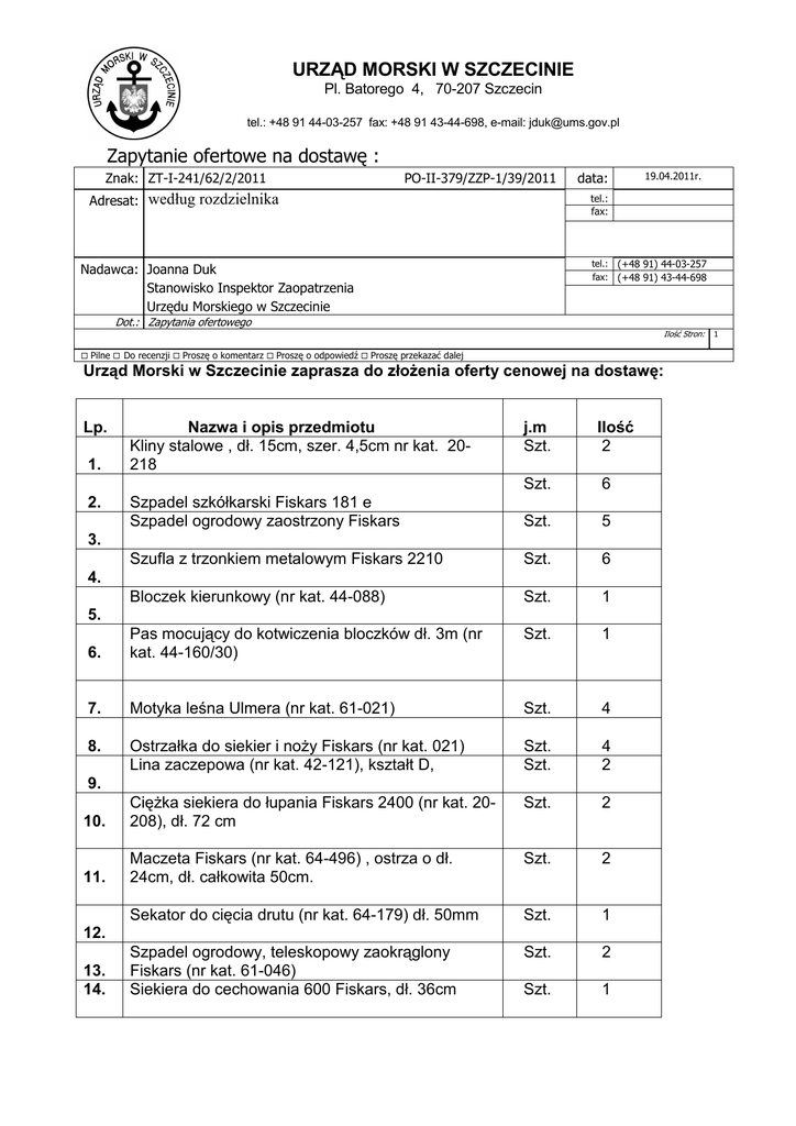 URZĄD MORSKI W SZCZECINIE Zapytanie ofertowe na dostawę :