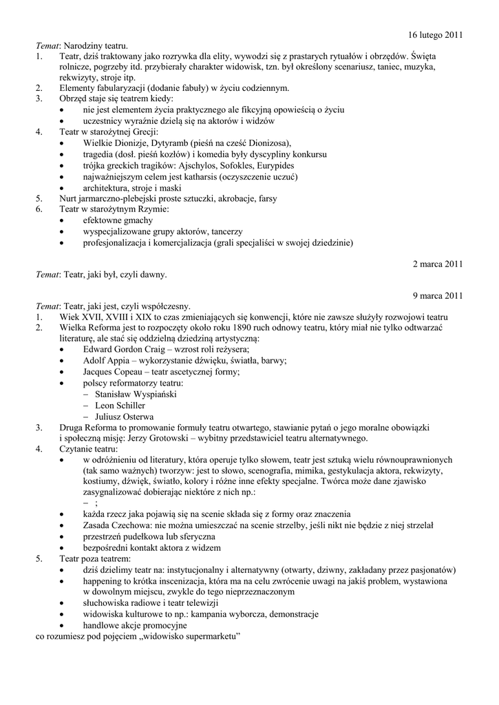 16 lutego 2011 Temat: Narodziny teatru. 1. Teatr, dziś traktowany jako rozrywka dla elity, wywodzi się z prastarych rytuałów i obrzędów. Święta rolnicze, pogrzeby itd. przybierały charakter widowisk, tzn. był określony scenariusz, taniec, muzyka, rekwizyty, stroje itp. 2. Elementy fabularyzacji (dodanie fabuły) w życiu codziennym. 3. Obrzęd staje się teatrem kiedy: nie jest elementem życia praktycznego ale fikcyjną opowieścią o życiu uczestnicy wyraźnie dzielą się na aktorów i widzów 4. Teatr w starożytnej Grecji: Wielkie Dionizje, Dytyramb (pieśń na cześć Dionizosa), tragedia (dosł. pieśń kozłów) i komedia były dyscypliny konkursu trójka greckich tragików: Ajschylos, Sofokles, Eurypides najważniejszym celem jest katharsis (oczyszczenie uczuć) architektura, stroje i maski 5. Nurt jarmarczno-plebejski proste sztuczki, akrobacje, farsy 6. Teatr w starożytnym Rzymie: efektowne gmachy wyspecjalizowane grupy aktorów, tancerzy profesjonalizacja i komercjalizacja (grali specjaliści w swojej dziedzinie) 2 marca 2011 Temat: Teatr, jaki był, czyli dawny. 9 marca 2011 Temat: Teatr, jaki jest, czyli współczesny. 1. Wiek XVII, XVIII i XIX to czas zmieniających się konwencji, które nie zawsze służyły rozwojowi teatru 2. Wielka Reforma jest to rozpoczęty około roku 1890 ruch odnowy teatru, który miał nie tylko odtwarzać literaturę, ale stać się oddzielną dziedziną artystyczną: Edward Gordon Craig – wzrost roli reżysera; Adolf Appia – wykorzystanie dźwięku, światła, barwy; Jacques Copeau – teatr ascetycznej formy; polscy reformatorzy teatru: Stanisław Wyspiański Leon Schiller Juliusz Osterwa 3. Druga Reforma to promowanie formuły teatru otwartego, stawianie pytań o jego moralne obowiązki i społeczną misję: Jerzy Grotowski – wybitny przedstawiciel teatru alternatywnego. 4. Czytanie teatru: w odróżnieniu od literatury, która operuje tylko słowem, teatr jest sztuką wielu równouprawnionych (tak samo ważnych) tworzyw: jest to słowo, scenografia, mimika, gestykulacja aktora, rekwizyty, kostiumy, dźwięk, światło, kolory i różne inne efekty specjalne. Twórca może dane zjawisko zasygnalizować dobierając niektóre z nich np.: ; każda rzecz jaka pojawią się na scenie składa się z formy oraz znaczenia Zasada Czechowa: nie można umieszczać na scenie strzelby, jeśli nikt nie będzie z niej strzelał przestrzeń pudełkowa lub sferyczna bezpośredni kontakt aktora z widzem 5. Teatr poza teatrem: dziś dzielimy teatr na: instytucjonalny i alternatywny (otwarty, dziwny, zakładany przez pasjonatów) happening to krótka inscenizacja, która ma na celu zwrócenie uwagi na jakiś problem, wystawiona w dowolnym miejscu, zwykle do tego nieprzeznaczonym słuchowiska radiowe i teatr telewizji widowiska kulturowe to np.: kampania wyborcza, demonstracje handlowe akcje promocyjne co rozumiesz pod pojęciem „widowisko supermarketu”