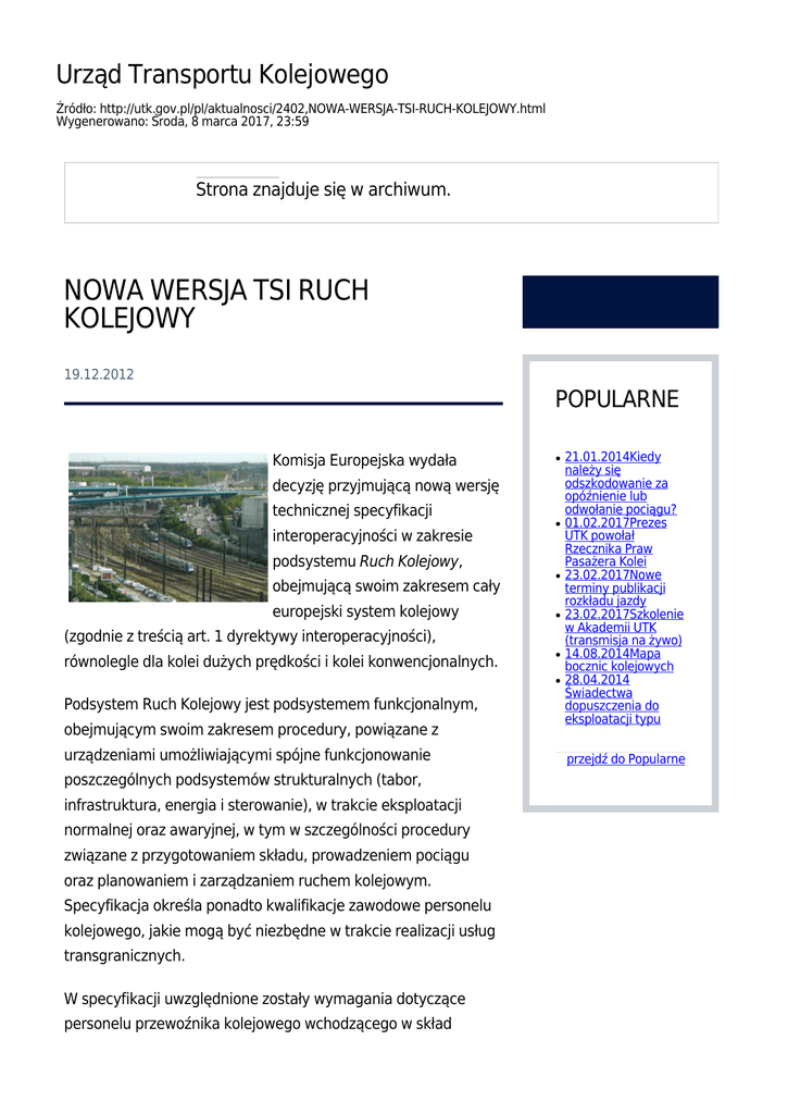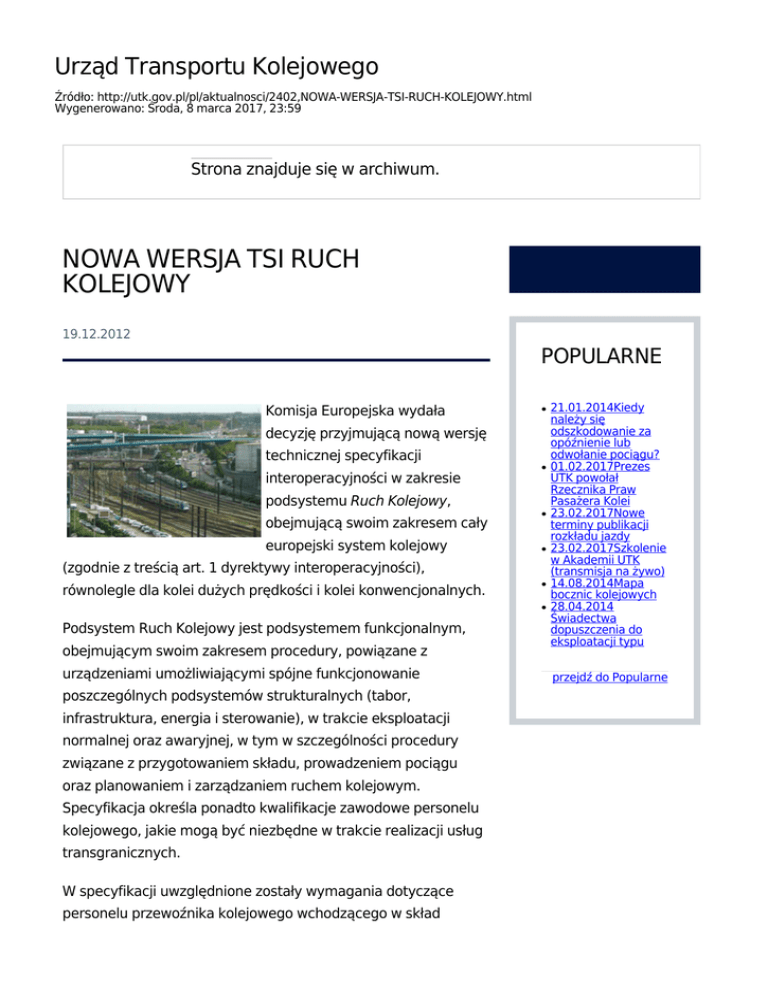Urząd Transportu Kolejowego Źródło: http://utk.gov.pl/pl/aktualnosci/2402,NOWA-WERSJA-TSI-RUCH-KOLEJOWY.html Wygenerowano: Środa, 8 marca 2017, 23:59 Strona znajduje się w archiwum. NOWA WERSJA TSI RUCH KOLEJOWY 19.12.2012 POPULARNE Komisja Europejska wydała ● decyzję przyjmującą nową wersję technicznej specyfikacji ● interoperacyjności w zakresie podsystemu Ruch Kolejowy, obejmującą swoim zakresem cały europejski system kolejowy ● ● (zgodnie z treścią art. 1 dyrektywy interoperacyjności), równolegle dla kolei dużych prędkości i kolei konwencjonalnych. ● ● Podsystem Ruch Kolejowy jest podsystemem funkcjonalnym, obejmującym swoim zakresem procedury, powiązane z urządzeniami umożliwiającymi spójne funkcjonowanie poszczególnych podsystemów strukturalnych (tabor, infrastruktura, energia i sterowanie), w trakcie eksploatacji normalnej oraz awaryjnej, w tym w szczególności procedury związane z przygotowaniem składu, prowadzeniem pociągu oraz planowaniem i zarządzaniem ruchem kolejowym. Specyfikacja określa ponadto kwalifikacje zawodowe personelu kolejowego, jakie mogą być niezbędne w trakcie realizacji usług transgranicznych. W specyfikacji uwzględnione zostały wymagania dotyczące personelu przewoźnika kolejowego wchodzącego w skład 21.01.2014Kiedy należy się odszkodowanie za opóźnienie lub odwołanie pociągu? 01.02.2017Prezes UTK powołał Rzecznika Praw Pasażera Kolei 23.02.2017Nowe terminy publikacji rozkładu jazdy 23.02.2017Szkolenie w Akademii UTK (transmisja na żywo) 14.08.2014Mapa bocznic kolejowych 28.04.2014 Świadectwa dopuszczenia do eksploatacji typu przejdź do Popularne drużyny pociągowej z uwzględnieniem maszynisty oraz personelu odpowiedzialnego za przygotowanie pociągu, a także wymagania dotyczące personelu zarządcy infrastruktury, wykonującego zadania związane z ruchem pociągów. Wymagania te obejmują swoim zakresem kwestie związane komunikacją i dokumentacją, a także po części dotyczące kwalifikacji personelu, warunków zdrowotnych oraz bezpieczeństwa i higieny pracy. W związku z przyjęciem nowej specyfikacji, państwa członkowskie zobowiązane zostały do aktualizacji krajowych planów wdrażania TSI Ruch Kolejowy oraz poinformowania o nich innych państw członkowskich i Komisji, a także do zgłoszenia Komisji obowiązujących porozumień krajowych i międzynarodowych dotyczących funkcjonowania ruchu kolejowego. Nowy akt prawny wprowadza również zmiany w decyzji dotyczącej specyfikacji krajowego rejestru pojazdów kolejowych, m.in. w zakresie funkcjonowania europejskiego numeru pojazdu (EVN). Państwa członkowskie mają obowiązek przygotowania się do stosowania decyzji w terminie do 1 stycznia 2014 r. Do tego czasu obowiązywać będą specyfikacje przyjęte decyzjami 2008/231/WE i 2011/314/UE, odrębnie dla kolei dużych prędkości i kolei konwencjonalnych. Treść nowego TSI Ruch kolejowy jest dostępna w witrynie Urzędu Transportu Kolejowego, w dziale Wymagania wspólnotowe / Techniczne Specyfikacje Interoperacyjności.
