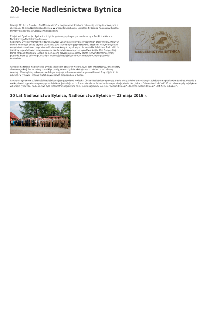 20-lecie Nadleśnictwa Bytnica 2016-05-20 20 maja 2016 r. w Ośrodku „Pod Modrzewiem” w miejscowości Kosobudz odbyła się uroczystość związana z obchodami 20-lecia Nadleśnictwa Bytnica. W uroczystościach wziął udział Jan Rydzanicz Regionalny Dyrektor Ochrony Środowiska w Gorzowie Wielkopolskim. Z tej okazji Dyrektor Jan Rydzanicz złożył list gratulacyjny i wyrazy uznania na ręce Pan Piotra Niemca Nadleśniczego Nadleśnictwa Bytnica. Regionalny Dyrektor Ochrony Środowiska wyraził uznanie za efekty pracy wszystkich pracowników, którzy w okresie minionych dekad czynnie uczestnicząc w racjonalnym gospodarowaniu zasobami leśnymi uwydatnili wszystkie ekonomiczne, przyrodnicze i kulturowe korzyści wynikające z istnienia Nadleśnictwa. Podkreślił, że jesteśmy województwem przygranicznym, często odwiedzanym przez sąsiadów z krajów Unii Europejskiej. Obraz naszego Regionu w Europie to m.in. cenne przyrodniczo obszary objęte różnymi formami ochrony przyrody, które są dobrym przykładem aktywności Nadleśnictwa Bytnica na polu ochrony przyrody i środowiska. Aktualnie na terenie Nadleśnictwa Bytnica jest osiem obszarów Natura 2000, park krajobrazowy, dwa obszary chronionego krajobrazu, cztery pomniki przyrody, osiem użytków ekologicznych i siedem stref ochrony zwierząt. W zarządzanym kompleksie leśnym znajdują schronienie rzadkie gatunki fauny i flory objęte ścisłą ochroną, w tym wilk - jeden z dwóch największych drapieżników w Polsce. Istotnym segmentem działalności Nadleśnictwa jest gospodarka łowiecka. Obszar Nadleśnictwa pokryty prawie wyłącznie borem sosnowym położonym na piaskowym sandrze, obecnie z wielką dbałością przebudowywany przez leśników, jest miejscem które upodobała sobie bardzo liczna populacja jelenia. Na „Łąkach Dobrosułowskich” od 200 lat odbywają się największe w Europie rykowiska. Nadleśnictwo było wielokrotnie nagradzane m.in. takimi nagrodami jak „Lider Polskiej Ekologii", „Panteon Polskiej Ekologii", „Hit Ziemi Lubuskiej". 20 Lat Nadleśnictwa Bytnica, Nadleśnictwo Bytnica — 23 maja 2016 r.