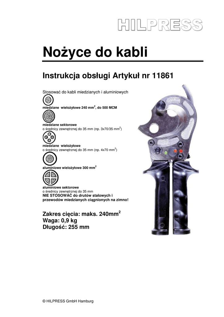 HILPRESS NoŜyce do kabli Instrukcja obsługi Artykuł nr 11861 Stosować do kabli miedzianych i aluminiowych 2 miedziane wieloŜyłowe 240 mm , do 500 MCM miedziane sektorowe 2 o średnicy zewnętrznej do 35 mm (np. 3x70/35 mm ) miedziane wieloŜyłowe 2 o średnicy zewnętrznej do 35 mm (np. 4x70 mm ) aluminiowe wieloŜyłowe 300 mm 2 aluminiowe sektorowe o średnicy zewnętrznej do 35 mm NIE STOSOWAĆ do drutów stalowych i przewodów miedzianych ciągnionych na zimno! Zakres cięcia: maks. 240mm2 Waga: 0,9 kg Długość: 255 mm © HILPRESS GmbH Hamburg HILPRESS NoŜyce do kabli są najlepszym urządzeniem na rynku europejskim. UmoŜliwiają one równieŜ obcinanie kabli o duŜych przekrojach bez miaŜdŜenia i bez konieczności uŜycia duŜej siły dzięki ich rozwiniętej technice, do której naleŜą: części mechanizmów napędowych na łoŜyskach igłowych, specjalna geometria ostrza i optymalny napęd mimośrodowy. Wymiarowanie zazębienia i ułoŜyskowania, trwale nasmarowanych, prowadzi do długiej Ŝywotności urządzenia bez konieczności przeprowadzania większych konserwacji. 1 płyta tnąca Funkcja / Obsługa 2 nóŜ obrotowy 21 zapadka trzymająca Najpierw odryglować dźwignię ruchomą (13): Obrócić wałek blokujący (16) w taki sposób, Ŝeby czerwony znacznik wskazywał na zielone oznaczenie płyty tnącej (1). Następnie wkręcać nóŜ obrotowy (2) w taki sposób, Ŝeby moŜna było łatwo włoŜyć kabel między ostrza noŜa obrotowego i płyty tnącej. Proces obracania jest ułatwiony, jeśli jednocześnie naciska się zapadkę trzymającą (21) a ruchoma dźwignia ręczna jest wychylona aŜ do oporu – wówczas nóŜ obrotowy moŜna obrócić w dowolnym kierunku. dźwignia stała 13 dźwignia ruchoma 16 wałek blokujący NóŜ obrotowy obrócić w kierunku włoŜonego kabla i powolnymi ruchami dźwigni ręcznej rozpocząć przecinanie. Wymieniona zapadka trzymająca oraz zapadka zębata w napędzie wydają przy tym dobrze słyszalne kliknięcie – oznaka prawidłowego działania. Proces cięcia moŜna w razie potrzeby przerwać w kaŜdej fazie cięcia: Dźwignię ręczną (13) trzymać odchyloną do oporu i nacisnąć zapadkę trzymającą (21) (ewent. poluzować za pomocą gumowego młotka) – teraz moŜna swobodnie obrócić do tyłu nóŜ obrotowy i wyjąć nacięty kabel. Naprawy przeprowadzamy najszybciej. © HILPRESS GmbH Hamburg moŜliwie HILPRESS Lista części zamiennych © HILPRESS GmbH Hamburg HILPRESS Lista części zamiennych Nr części 1 2 3 4 5 6 7 8 9 10 11 12 13 15 16 17 18 19 20 21 23 24 25 29 Nazwa Płyta tnąca NóŜ obrotowy Wkręt z łbem walcowym wysokim SpręŜyna Tarcza pasowana Nakrętka kołpakowa Tuleja dystansowa Śruba z łbem walcowym o gnieździe sześciokątnym Nakrętka kołpakowa Sworzeń przegubowy Igiełki łoŜyskowe Koszyczek łoŜyskowy igłowy Dźwignia mimośrodowa, bez akcesoriów Uchwyt formy, czarny Wałek blokujący Tarcza Podkładka spręŜysta Pierścień osadczy spręŜynujący SpręŜyna naciskowa Zapadka trzymająca Płyta pokładowa, komplet z uchwytem i uchwytem formy SpręŜyna naciągowa, komplet Zapadka zębata Pierścień osadczy spręŜynujący do części 10 Szt. 1 1 1 1 1 1 2 3 3 1 19 1 1 2 1 1 1 1 1 1 1 1 1 2 Podzespoły i zestawy montaŜowe 27 Dźwignia ręczna kompletna z zapadkę zębatą, spręŜyną naciągową, igiełkami łoŜyskowymi i sworzniem przegubowym 1 zestaw 28 Wkręt z łbem walcowym wysokim, komplet ze spręŜyną krąŜkową, tarczą pasowana i nakrętką kołpakową 1 zestaw 30 Wałek blokujący, komplet z tarczą, podkładką spręŜystą i pierścieniem osadczym spręŜynującym 1 zestaw 31 NóŜ obracany komplet z 1 zestawem część nr 28 1 zestaw 32 3 x śruby z łbem walcowym o gnieździe sześciokątnym z nakrętką kołpakową 1 zestaw © HILPRESS GmbH Hamburg
