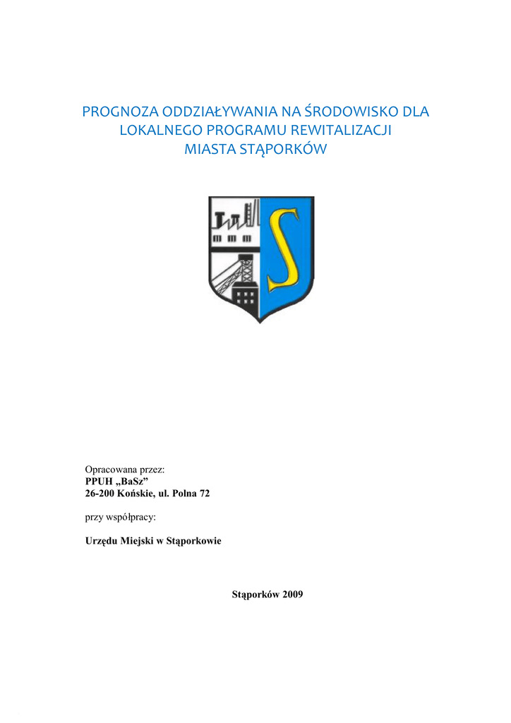 PROGNOZA ODDZIAŁYWANIA NA ŚRODOWISKO DLA LOKALNEGO PROGRAMU REWITALIZACJI MIASTA STĄPORKÓW Opracowana przez: PPUH „BaSz” 26-200 Końskie, ul. Polna 72 przy współpracy: Urzędu Miejski w Stąporkowie Stąporków 2009 Prognoza oddziaływania na środowisko „Lokalnego Programu Rewitalizacji Miasta Stąporków” Spis treści 1. Wprowadzenie ..............................................................................................3 1.1. Podstawa prawna i cel opracowania prognozy..............................................3 1.2. Zawartość merytoryczna prognozy ...............................................................3 2. Analiza zawartości Lokalnego Programu Rewitalizacji Miasta Stąporków ..5 2.1. Zawartość LPR .............................................................................................5 2.2. Cele LPR ......................................................................................................6 2.3. Powiązania LPR z innymi dokumentami strategicznymi ..............................7 3. Analiza stanu środowiska naturalnego ..........................................................8 3.1. Istniejący stan środowiska oraz problemy jego ochrony z punktu widzenia realizacji LPR ze szczególnym uwzględnieniem terenów podlegających ochronie ........................................................................................................8 3.2. Potencjalne zmiany stanu środowiska w przypadku braku realizacji Lokalnego Programu Rewitalizacji Miasta Stąporków ...............................12 4. Przewidywane oddziaływanie na środowisko .............................................13 4.1. Stan środowiska na obszarach objętych przewidywanym znaczącym oddziaływaniem..........................................................................................13 4.3. Główne cele ochrony środowiska ustanowione na szczeblu międzynarodowym, wspólnotowym, krajowym i regionalnym i ich uwzględnienie podczas opracowania LPR ..................................................18 4.4. Propozycje rozwiązań służących zapobieganiu, ograniczaniu lub kompensacji przyrodniczej negatywnych oddziaływań na środowisko w związku z realizacją projektu „Lokalnego Programu Rewitalizacji Miasta Stąporków” .................................................................................................21 4.5. Rozwiązania alternatywne, zapobiegające, ograniczające lub kompensujące ewentualne negatywne oddziaływania na środowisko Lokalnego Programu Rewitalizacji Miasta i Gminy Stąporków ...................................................22 4.6. Niedostatki i braki materiałów utrudniające ocenę szkodliwego oddziaływania na środowisko ustaleń projektowanego dokumentu ............22 4.7. Oddziaływania transgraniczne związane z realizacją Lokalnego Programu Rewitalizacji ...............................................................................................23 5. Informacje końcowe ...................................................................................23 5.1. Metody wykorzystane przy opracowaniu prognozy i analizie realizacji Lokalnego Programu Rewitalizacji Miasta Stąporków ...............................23 5.2. Metody analizy realizacji skutków LPR .....................................................24 6. Streszczenie w języku niespecjalistycznym ...................................................25 2 Prognoza oddziaływania na środowisko „Lokalnego Programu Rewitalizacji Miasta Stąporków” 1. Wprowadzenie 1.1. Podstawa prawna i cel opracowania prognozy Podstawę prawną sporządzenia niniejszej „Prognozy oddziaływania na środowisko projektu „Lokalnego Programu Rewitalizacji Miasta Stąporków” jest art. 46 ustawy z dnia 3 października 2008 r. o udostępnianiu informacji o środowisku i jego ochronie, udziale społeczeństwa w ochronie środowiska oraz o ocenach oddziaływania na środowisko (Dz. U. z 2008 Nr 199, poz. 1227). Artykuł ten zobowiązuje organy administracji opracowujące projekty polityk, strategii, planów lub programów obowiązek przeprowadzenia postępowania w sprawie oceny oddziaływania na środowisko skutków realizacji tych dokumentów. Związane jest to ze stosowaniem w prawodawstwie polskim postanowień Dyrektywy 2001/42/WE z 27 czerwca 2001 roku w sprawie oceny wpływu niektórych planów i programów na środowisko. Zgodnie z zapisami ustawowymi (Prawo ochrony środowiska, art. 46) przeprowadzenia strategicznej oceny oddziaływania na środowisko wymagają projekty: „strategii rozwoju regionalnego (…) polityki, strategie, plany lub programy dotyczące w szczególności przemysłu, energetyki, transportu, telekomunikacji, gospodarki wodnej, gospodarki odpadami, gospodarki przestrzennej, leśnictwa, rolnictwa, rybołówstwa, turystyki i wykorzystania terenu, opracowywane lub przyjmowane przez organy administracji (…) polityk, strategii, planów lub programów, których realizacja może spowodować znaczące oddziaływanie na obszar „Natura 2000”. Nadrzędnym celem prognozy jest określenie potencjalnych skutków w środowisku, jakie mogą wystąpić po wdrożeniu zapisów „Lokalnego Programu Rewitalizacji ...”, jak również sformułowanie zaleceń o charakterze przeciwdziałania lub minimalizacji dla wszelkich jego negatywnych oddziaływań. Prognoza winna wspierać proces decyzyjny dla realizacji inwestycji ingerujących w stan środowiska. Celem przeprowadzenia niniejszej Prognozy było: - ocena stopnia i sposobu uwzględnienia zagadnień ochrony środowiska we wszystkich częściach „Lokalnego Programu Rewitalizacji dla Miasta i Gminy Stąporków”, - ocena potencjalnych skutków środowiskowych wdrażania zapisów LPR, - przygotowanie wytycznych, które pozwolą na udoskonalenie końcowej wersji LPR. 1.2. Zawartość merytoryczna prognozy Zawartość niniejszej Prognozy wynika z powyżej przedstawionych ustaw dotyczących udostępniania inform