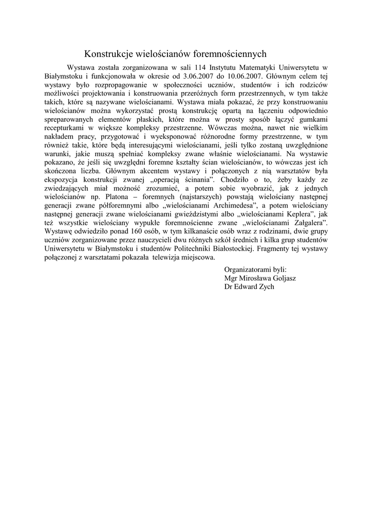 Konstrukcje wielościanów foremnościennych Wystawa została zorganizowana w sali 114 Instytutu Matematyki Uniwersytetu w Białymstoku i funkcjonowała w okresie od 3.06.2007 do 10.06.2007. Głównym celem tej wystawy było rozpropagowanie w społeczności uczniów, studentów i ich rodziców moŜliwości projektowania i konstruowania przeróŜnych form przestrzennych, w tym takŜe takich, które są nazywane wielościanami. Wystawa miała pokazać, Ŝe przy konstruowaniu wielościanów moŜna wykorzystać prostą konstrukcję opartą na łączeniu odpowiednio spreparowanych elementów płaskich, które moŜna w prosty sposób łączyć gumkami recepturkami w większe kompleksy przestrzenne. Wówczas moŜna, nawet nie wielkim nakładem pracy, przygotować i wyeksponować róŜnorodne formy przestrzenne, w tym równieŜ takie, które będą interesującymi wielościanami, jeśli tylko zostaną uwzględnione warunki, jakie muszą spełniać kompleksy zwane właśnie wielościanami. Na wystawie pokazano, Ŝe jeśli się uwzględni foremne kształty ścian wielościanów, to wówczas jest ich skończona liczba. Głównym akcentem wystawy i połączonych z nią warsztatów była ekspozycja konstrukcji zwanej „operacją ścinania”. Chodziło o to, Ŝeby kaŜdy ze zwiedzających miał moŜność zrozumieć, a potem sobie wyobrazić, jak z jednych wielościanów np. Platona – foremnych (najstarszych) powstają wielościany następnej generacji zwane półforemnymi albo „wielościanami Archimedesa”, a potem wielościany następnej generacji zwane wielościanami gwieździstymi albo „wielościanami Keplera”, jak teŜ wszystkie wielościany wypukłe foremnościenne zwane „wielościanami Załgalera”. Wystawę odwiedziło ponad 160 osób, w tym kilkanaście osób wraz z rodzinami, dwie grupy uczniów zorganizowane przez nauczycieli dwu róŜnych szkół średnich i kilka grup studentów Uniwersytetu w Białymstoku i studentów Politechniki Białostockiej. Fragmenty tej wystawy połączonej z warsztatami pokazała telewizja miejscowa. Organizatorami byli: Mgr Mirosława Goljasz Dr Edward Zych