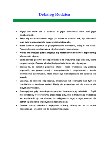Dekalog Rodzica Nigdy nie mów źle o dziecku w jego obecności albo pod jego nieobecność. Skup się na wzmacnianiu tego ,co dobre w dziecku tak, by obecność tego dobra pozostawiała coraz mniej miejsca złu. Bądź zawsze aktywny w przygotowaniu otoczenia, dbaj o nie stale. Pomóż dziecku nawiązywać z nim konstruktywne relacje. Wskaż mu miejsce gdzie znajdują się materiały rozwojowe i zaprezentuj ich sposób użycia. Bądź zawsze gotowy, by odpowiedzieć na wezwanie tego dziecka, które cię potrzebuje. Zawsze słuchaj i odpowiadaj temu kto cię wzywa. Szanuj to, że dziecko popełnia błędy i może wcześniej czy później poprawić, ale powstrzymuj - zdecydowanie i natychmiast - każde niewłaściwe zachowanie, które może być niebezpieczne dla dziecka lub innych. Uszanuj, że dziecko odpoczywa, obserwuje lub rozmyśla nad tym co zrobiło lub co zamierza zrobić. Nigdy nie wzywaj go ani nie zmuszaj do innych aktywności. Pomagaj mu, gdy poszukuje aktywności i nie może jej odnaleźć ... Bądź nie strudzony w oferowaniu prezentacji gdy, inni odmówili jej wcześniej we wspieraniu go na drodze do osiągnięcia tego, czego jeszcze nie potrafi i pokonania własnych niedoskonałości. Zawsze traktuj dziecko z najwyższą kulturą, ofiaruj mu to, co masz najlepszego - w sobie lub do swojej dyspozycji. APEL TWOJEGO DZIECKA SZANUJ MNIE ABYM SZANOWAŁ INNYCH WYBACZAJ, ŻEBYM UMIAŁ WYBACZAĆ SŁUCHAJ, ŻEBYM UMIAŁ SŁUCHAĆ NIE BIJ, ŻEBYM NIE BIŁ NIE PONIŻAJ, ŻEBYM NIE PONIŻAŁ ROZMAWIAJ ZE MNĄ, ŻEBYM UMIAŁ ROZMAWIAĆ NIE WYŚMIEWAJ NIE OBRAŻAJ NIE LEKCEWAŻ KOCHAJ, ŻEBYM UMIAŁ KOCHAĆ UCZĘ SIĘ ŻYCIA OD CIEBIE!!! TWOJE DZIECKO CHCE CZUĆ SIĘ BEZPIECZNIE NIE PSUJ MNIE, DAJĄC MI WSZYSTKO, O CO CIĘ POPROSZĘ. NIEKTÓRYMI PRÓBAMI WYSTAWIAM CIĘ NA PRÓBĘ. NIE OBAWIAJ SIĘ POSTĘPOWAĆ WOBEC MNIE ZDECYDOWANIE I KONSEKWENTNIE. DAJE MI TO POCZUCIE BEZPIECZEŃSTWA. NIE POZWÓL MI UTRWALAĆ ZŁYCH NAWYKÓW. UFAM, ŻE TY POMOŻESZ MI SIĘ Z NIMI UPORAĆ. NIE POSTEPUJ TAK ,BYM CZUŁ SIĘ MNIEJSZY NIŻ JESTEM. TO SPRAWIA, ŻE POSTĘPUJĘ GŁUPIO, BY UDOWODNIĆ ZE JESTEM DUŻY. NIE KARĆ MNIE W OBECNOŚCI INNYCH. NAJBARDZIEJ MNIE PRZEKONUJESZ , GDY MÓWISZ DO MNIE SPOKOJNIE I DYSKRETNIE NIE OCHRANIEJ MNIE PRZED KONSEKWENCJAMI TEGO CO ZROBIŁEM. POTRZEBNE MI SĄ RÓWNIEŻ BOLESNE ALE SAMODZIELNE DOŚWIADCZENIA. NIE PRZEJMUJ SIĘ ZBYTNIO, GDY MÓWIĘ ,ŻE CIĘ NIENAWIDZĘ. TO NIE CIEBIE NIENAWIDZĘ ,ALE OGRANICZEŃ KTÓRE STAWIASZ PRZEDE MNĄ. NIE PRZEJMUJ SIĘ ZBYTNIO MOIMI MAŁYMI DOLEGLIWOŚCIAMI . POMYŚL JEDNAK CZY NIE STARAM SIĘ PRZY ICH POMOCY PRZYCIĄGNĄĆ TWOJEJ UWAGI, KTÓREJ TAK POTRZEBUJĘ. NIE GDERAJ .BĘDĘ SIĘ BRONIŁ ,UDAJĄC GŁUCHEGO. NIE DAWAJ MI POCHOPNYCH OBIETNIC ,BO CZUJĘ SIĘ BARDZO ZAWIEDZIONY, GDY ICH PÓŹNIEJ NIE DOTRZYMUJESZ. NIE DAWAJ MI POCHOPNYCH OBIETNIC, BO CZUJĘ SIĘ ZAWIEDZIONY, GDY ICH PÓŹNIEJ NIE DOTRZYMUJESZ. NIE PRZECENIAJ MNIE. TO MNIE KRĘPUJE I NIEKIEDY ZMUSZA DO KŁAMSTWA, ABY NIE SPRAWIAĆ CI ZAWODU. NIE ZMIENIAJ SWOICH ZASAD POSTĘPOWANIA W ZALEŻNOŚCI OD UKŁADÓW. CZUJĘ SIĘ WTEDY ZAGUBIONY I TRACĘ WIARĘ WE CIEBIE. NIE ZBYWAJ MNIE GDY STAWIAM CI PYTANIA . JA ZNAJDĘ INFORMACJE GDZIE INDZIEJ, ALE CHCIAŁBYM ŻEBYŚ TY BYŁ MOIM PRZEWODNIKIEM PO ŚWIECIE. NIE MÓW ,ŻE MÓJ STRACH I MOJE OBAWY SĄ GŁUPIE. DLA MNIE SĄ BARDZO REALNE . NIGDY NAWET NIE SUGERUJ, ŻE TY JESTEŚ DOSKONAŁY I NIEOMYLNY. PRZEŻYWAM BOWIEM ZBYT WIELKI WSTRZĄS, GDY WIDZĘ ŻE NIE JESTEŚ TAKI. NIGDY NIE MYŚL, ŻE USPRAWIEDLIWIANIE SIĘ PRZEDE MNĄ JEST PONIŻEJ TWOJEJ GODNOŚĆI. WZBUDZA ONO WE MNIE PRAWDZIWĄ SERDECZNOŚĆ. NIE ZABRANIAJ MI EKSPERYMENTOWANIA I POPEŁMNIANIA BŁĘDÓW. BEZ TEGO NIE MOGĘ SIĘ ROZWIJAĆ NIE ZAPOMINAJ JAK SZYBKO DORASTAM . JEST CI ZAPEWNE TRUDNO DOTRZYMAĆ MI KROKU ,ALE PROSZĘ CIĘ ,POSTARAJ SIĘ .