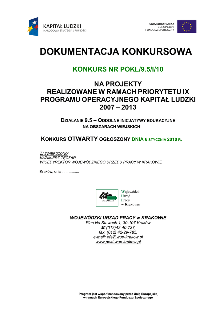 DOKUMENTACJA KONKURSOWA KONKURS NR POKL/9.5/I/10 NA PROJEKTY REALIZOWANE W RAMACH PRIORYTETU IX PROGRAMU OPERACYJNEGO KAPITAŁ LUDZKI 2007 – 2013 DZIAŁANIE 9.5 – ODDOLNE INICJATYWY EDUKACYJNE NA OBSZARACH WIEJSKICH KONKURS OTWARTY OGŁOSZONY DNIA 6 STYCZNIA 2010 R. ZATWIERDZONO: KAZIMIERZ TĘCZAR WICEDYREKTOR WOJEWÓDZKIEGO URZĘDU PRACY W KRAKOWIE Kraków, dnia ................ WOJEWÓDZKI URZĄD PRACY w KRAKOWIE Plac Na Stawach 1, 30-107 Kraków (012)42-40-737, fax. (012) 42-29-785, e-mail: [email protected] www.pokl-wup.krakow.pl Program jest współfinansowany przez Unię Europejską w ramach Europejskiego Funduszu Społecznego Dokumentacja Konkursowa - Konkurs nr POKL/9.5/I/10 na projekty realizowane w ramach Priorytetu IX PO KL, Działanie 9.5 Oddolne inicjatywy edukacyjne na obszarach wiejskich ogłoszony dnia 6 stycznia 2010 r. ----------------------------------------------------------------------------------------------------------------- SPIS TREŚCI 1. INFORMACJE OGÓLNE ........................................................................................................................................... 3 2. PODSTAWOWE INFORMACJE NA TEMAT KONKURSU....................................................................................... 4 2.1 INFORMACJE OGÓLNE NA TEMAT KONKURSU ........................................................................................................ 4 2.2 SŁOWNICZEK POJĘĆ ................................................................................................................................................... 5 2.3 PRZEDMIOT KONKURSU – TYPY PROJEKTÓW ........................................................................................................ 7 2.4 KWOTA PRZEZNACZONA NA KONKURS .................................................................................................................... 7 3. WYMAGANIA KONKURSOWE ................................................................................................................................. 8 3.1 PODMIOTY UPRAWNIONE DO UBIEGANIA SIĘ O DOFINANSOWANIE REALIZACJI PROJEKTU (BENEFICJENCI) 8 3.2 BENEFICJENCI OSTATECZNI (GRUPY DOCELOWE) ................................................................................................ 8 3.3 WYMAGANIA CZASOWE – OKRES REALIZACJI PROJEKTÓW ............................................................................... 10 3.4 WYMAGANE REZULTATY PROJEKTU ....................................................................................................................... 10 3.5 REALIZACJA PROJEKTU Z UDZIAŁEM INNYCH PODMIOTÓW – PARTNERSTWO, ZLECENIE, ZAKUP USŁUG 12 3.6 WYMAGANIA DOTYCZĄCE POMOCY PUBLICZNEJ ................................................................................................. 18 3.7 WYMAGANIA DOT. ZGODNOŚCI PROJEKTU Z PRAWODAWSTWEM W ZAKRESIE ZAMÓWIEŃ PUBLICZNYCH 19 3.8 WYMAGANIA DOTYCZĄCE AUDYTU ......................................................................................................................... 19 3.9 WYMAGANIA DOTYCZĄCE INNOWACYJNOŚCI I WSPÓŁPRACY PONADNARODOWEJ ..................................... 20 3.10 MIEJSCE, TERMIN I TRYB SKŁADANIA WNIOSKÓW ............................................................................................ 20 3.11 WYMAGANIA FINANSOWE, ZASADY FINANSOWANIA PROJEKTU ...................................................................... 22 4. PRZYGOTOWANIE WNIOSKU ............................................................................................................................... 27 4.1 FORMULARZ WNIOSKU.............................................................................................................................................. 27 4.2 WERSJA PAPIEROWA I ELEKTRONICZNA WNIOSKU ............................................................................................. 28 4.3 WYMAGANE ZAŁĄCZNIKI ........................................................................................................................................... 31 4.4 SPOSÓB PRZYGOTOWANIA DOKUMENTÓW .......................................................................................................... 33 5. OCENA FORMALNA WNIOSKÓW ......................................................................................................................... 34 5.1 KRYTERIA OCENY FORMALNEJ ................................................................................................................................ 34 5.2 TERMIN OCENY FORMALNEJ .................................................................................................................................... 38 5.3 WYNIKI OCENY FORMALNEJ ..................................................................................................................................... 38 6. OCENA MERYTORYCZNA PROJEKTÓW ............................................................................................................. 40 6.1 KOMISJA OCENY PROJEKTÓW ................................................................................................................................. 40 6.2 KRYTERIA OCENY MERYTORYCZNEJ ..................................................................................................................... 41 6.3 WYNIKI OCENY MERYTORYCZNEJ ........................................................................................................................... 46 6.4 NEGOCJACJE .............................................................................................................................................................. 51 7. PROCEDURA ODWOŁAWCZA .............................................................................................................................. 53 7.1 PROTEST ....................................................................................................................................................